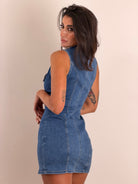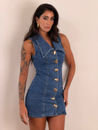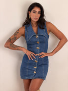 Abito di jeans smanicato, elasticizzato con bottoni oro e bavero a punta