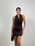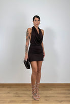 Abito in Jersey elasticizzato a taglie, allacciatura al collo con scollo sciallato e schiena scoperta