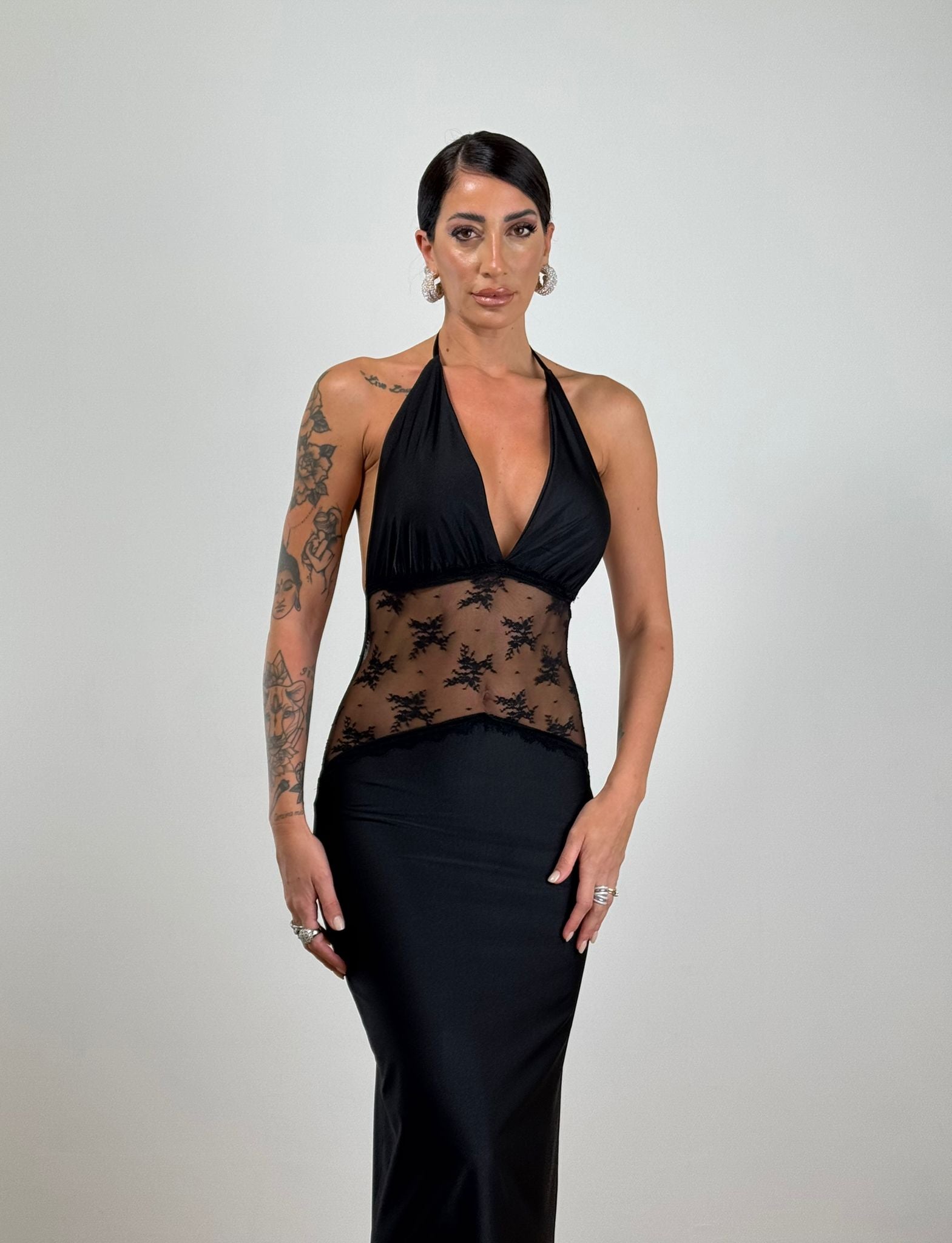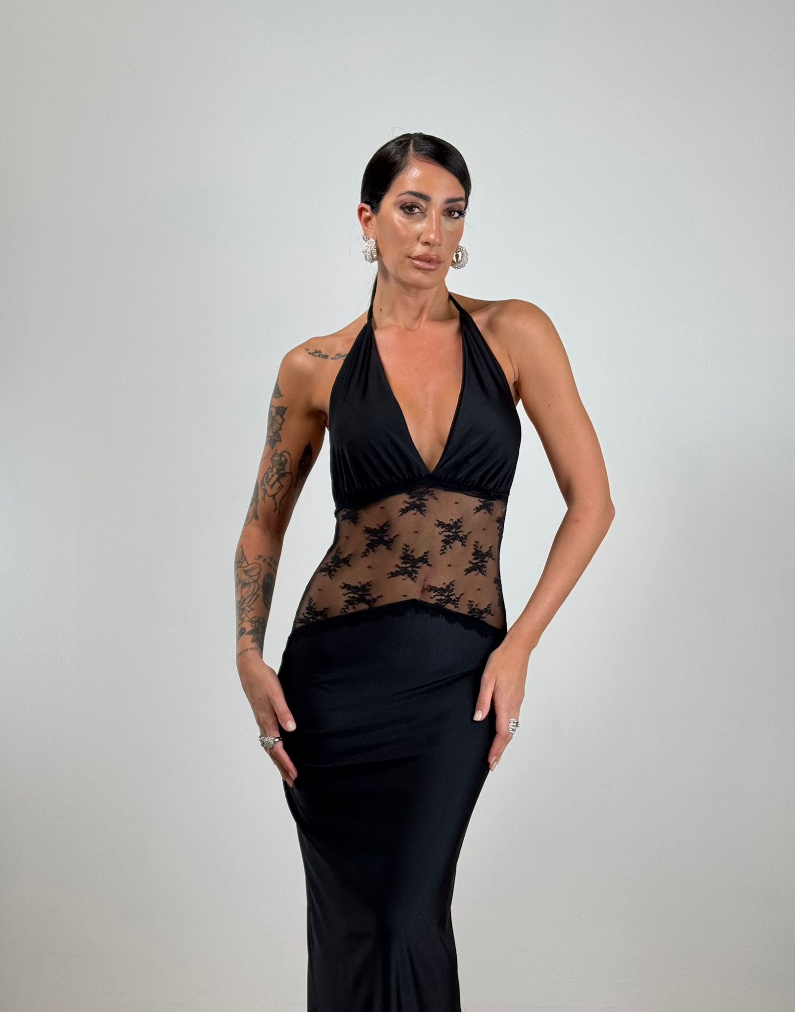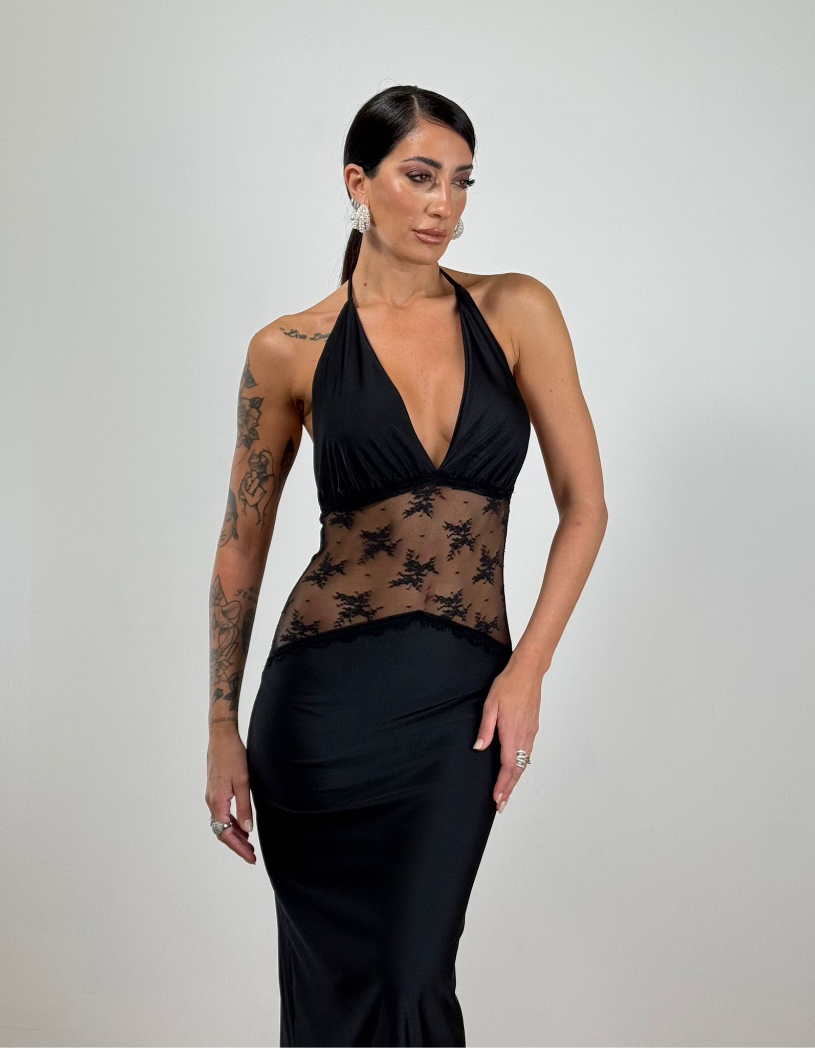 Abito lungo nero con allacciatura al collo coppe preformate , trasparenza in pizzo sul ventre e spacco sul retro . Taglia unica in jersey