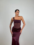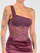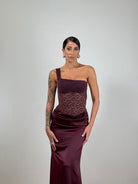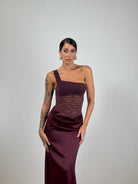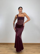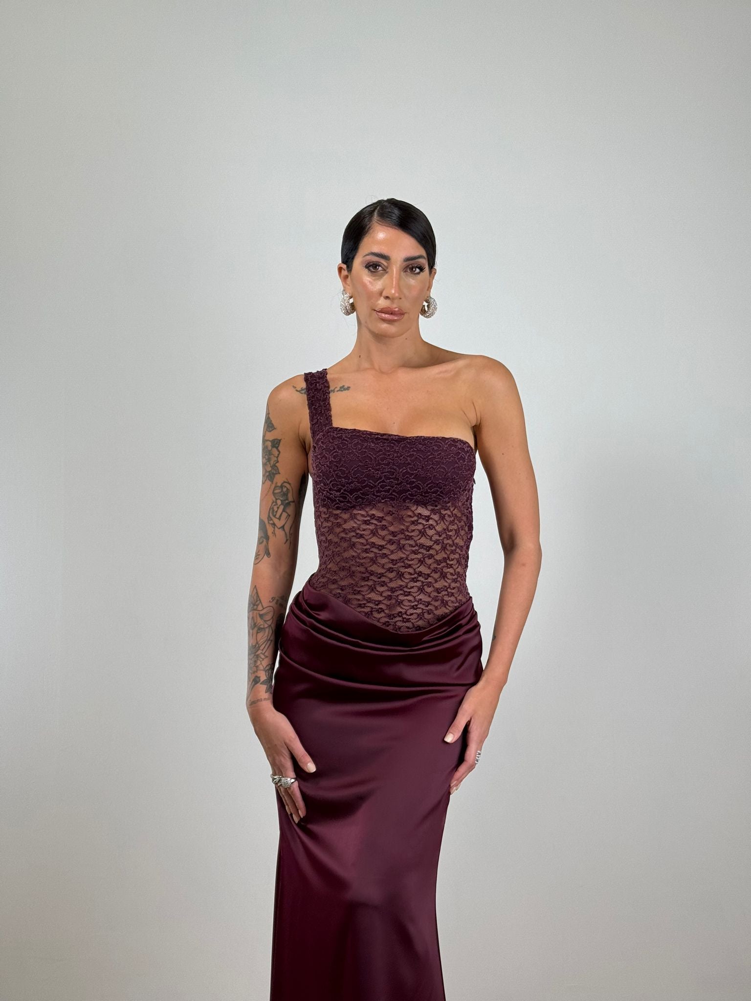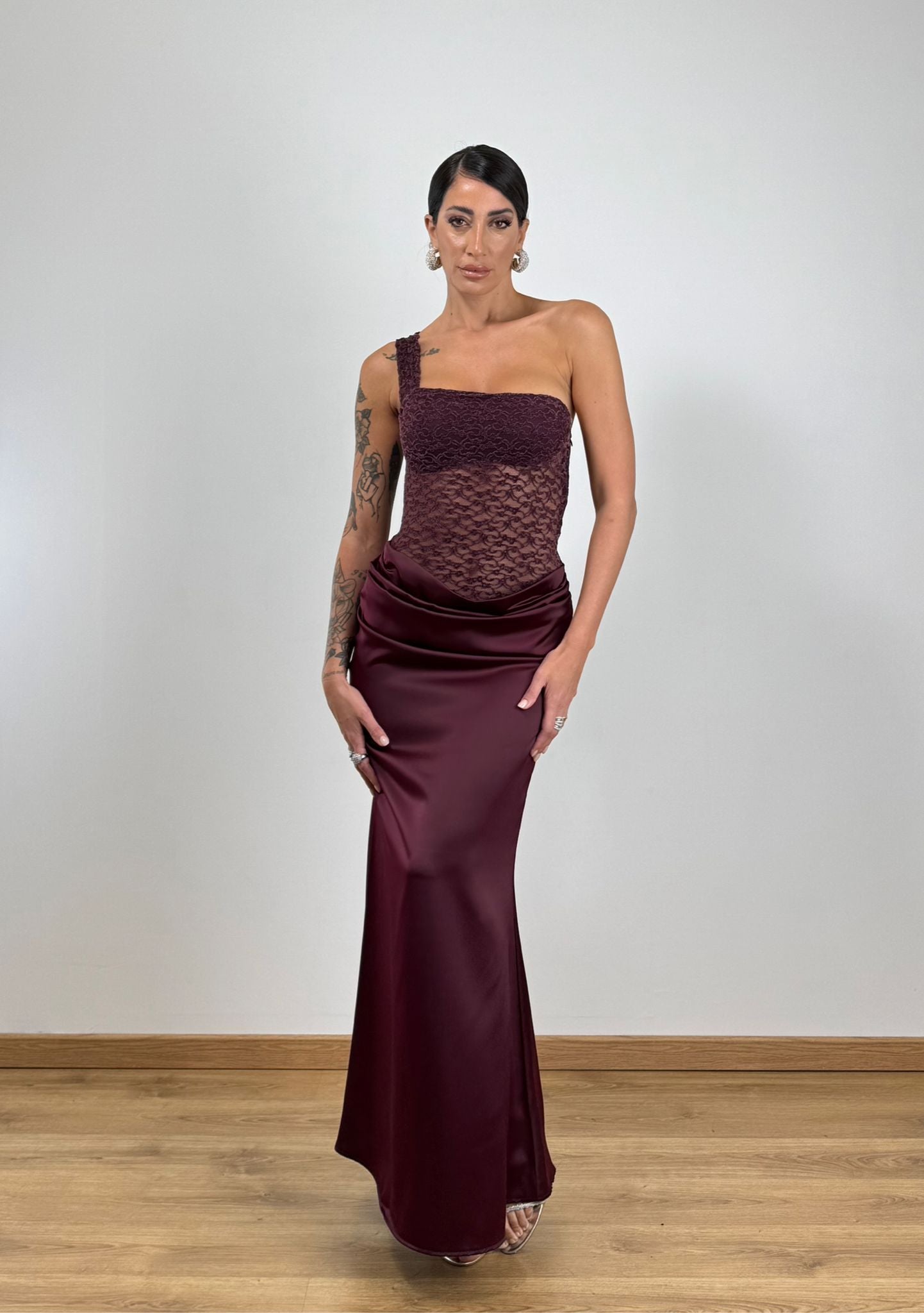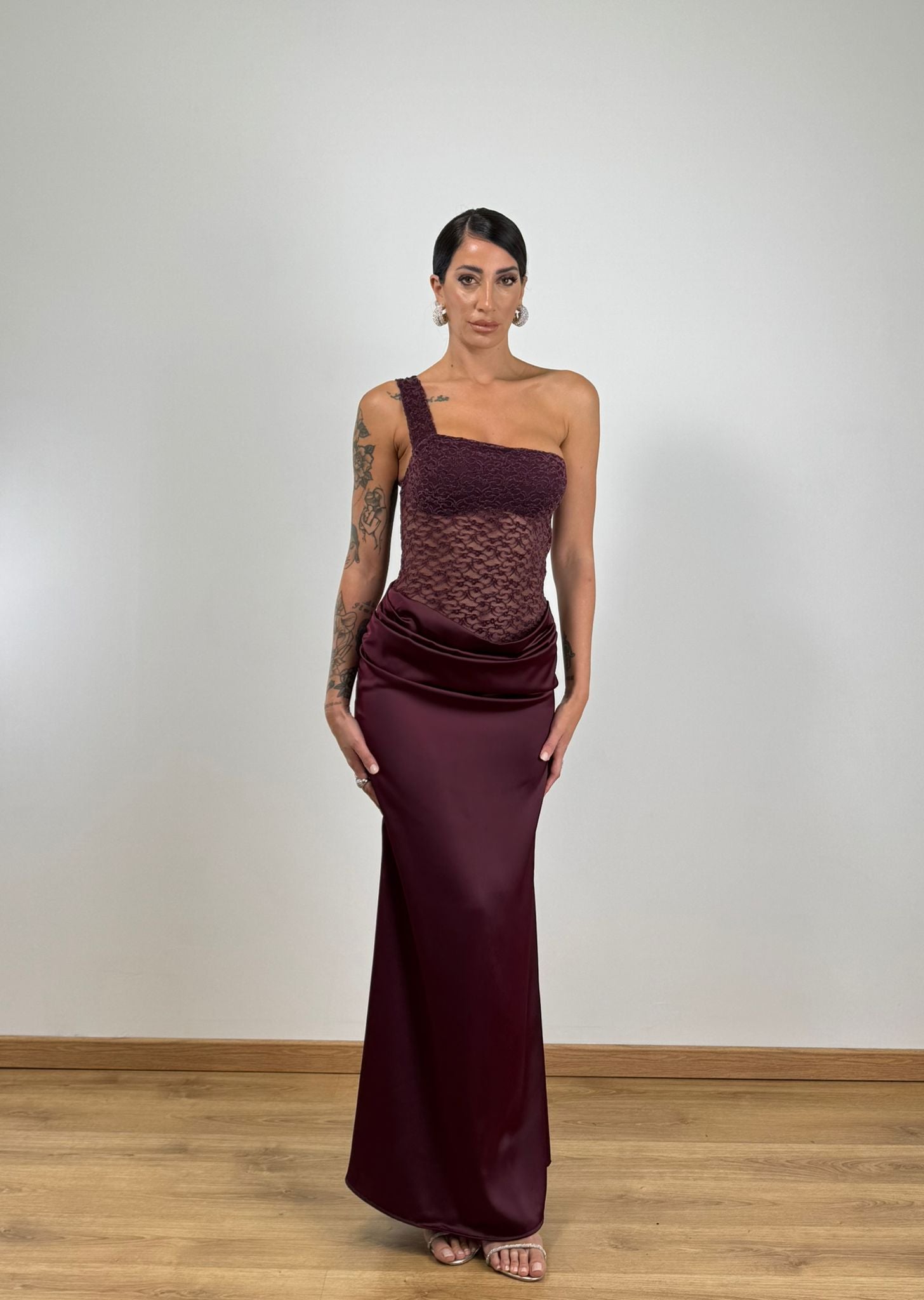 Abito monospalla composto dalla parte superiore in pizzo elasticizzato con coppe preformate , la parte bassa invece prosegue con una gonna in raso leggermente elastica con drappeggio in vita e zip. Veste fino 44