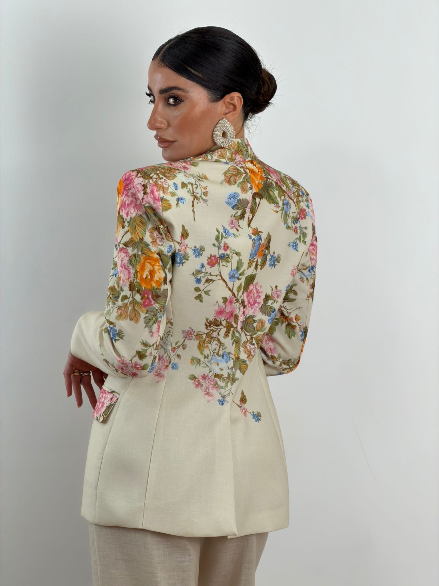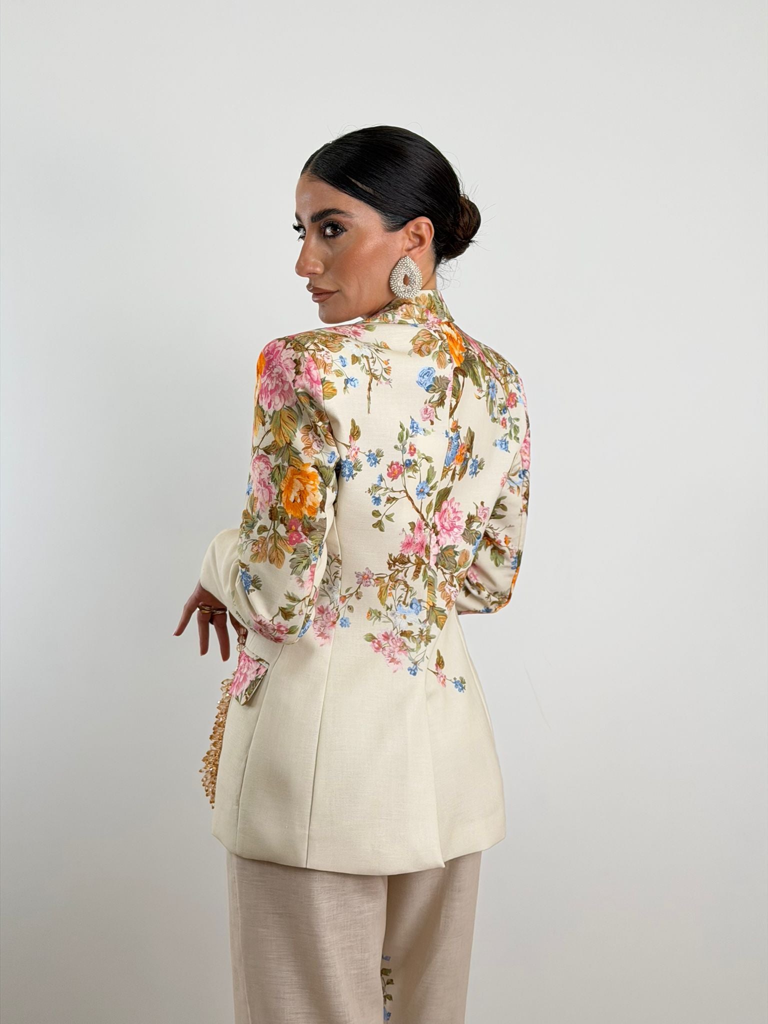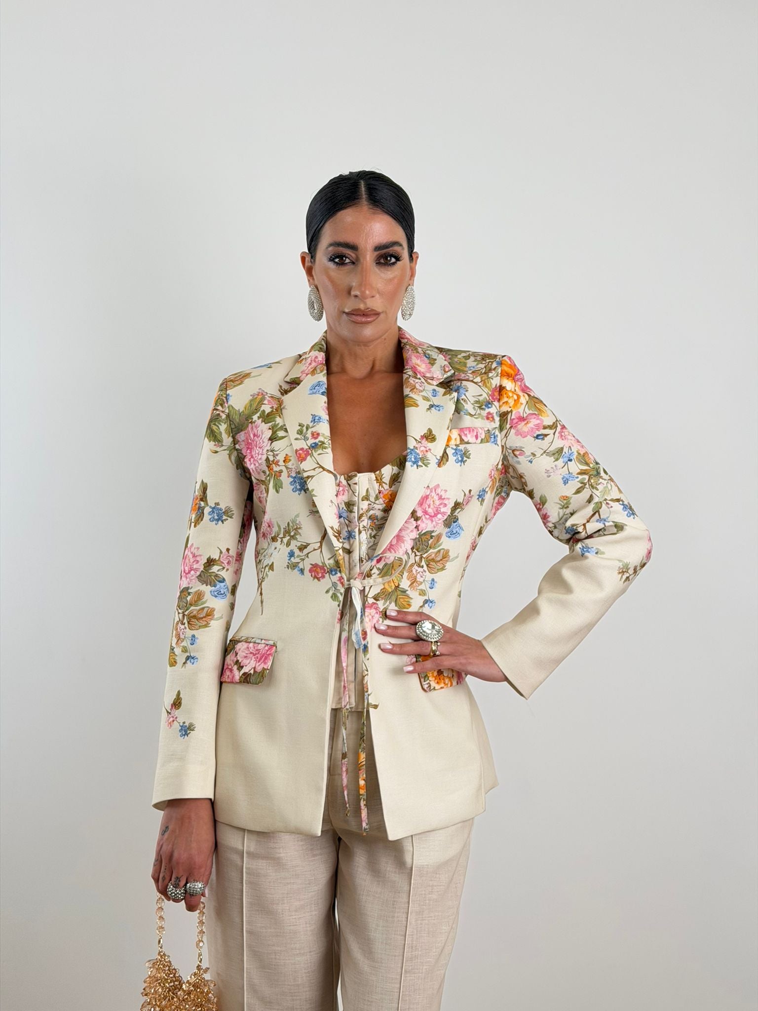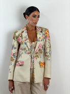 Blazer monopetto dal taglio strutturato.Fantasia: Stampa floreale piazzata "all-over" con motivi botanici nei toni del rosa cipria, arancio mandarino e carta da zucchero su base crema/beige. Collo: Revers classici a lancia.Innovativa chiusura frontale con sottile laccetto coordinato.Due finte tasche frontali orizzontali con patta sagomata.