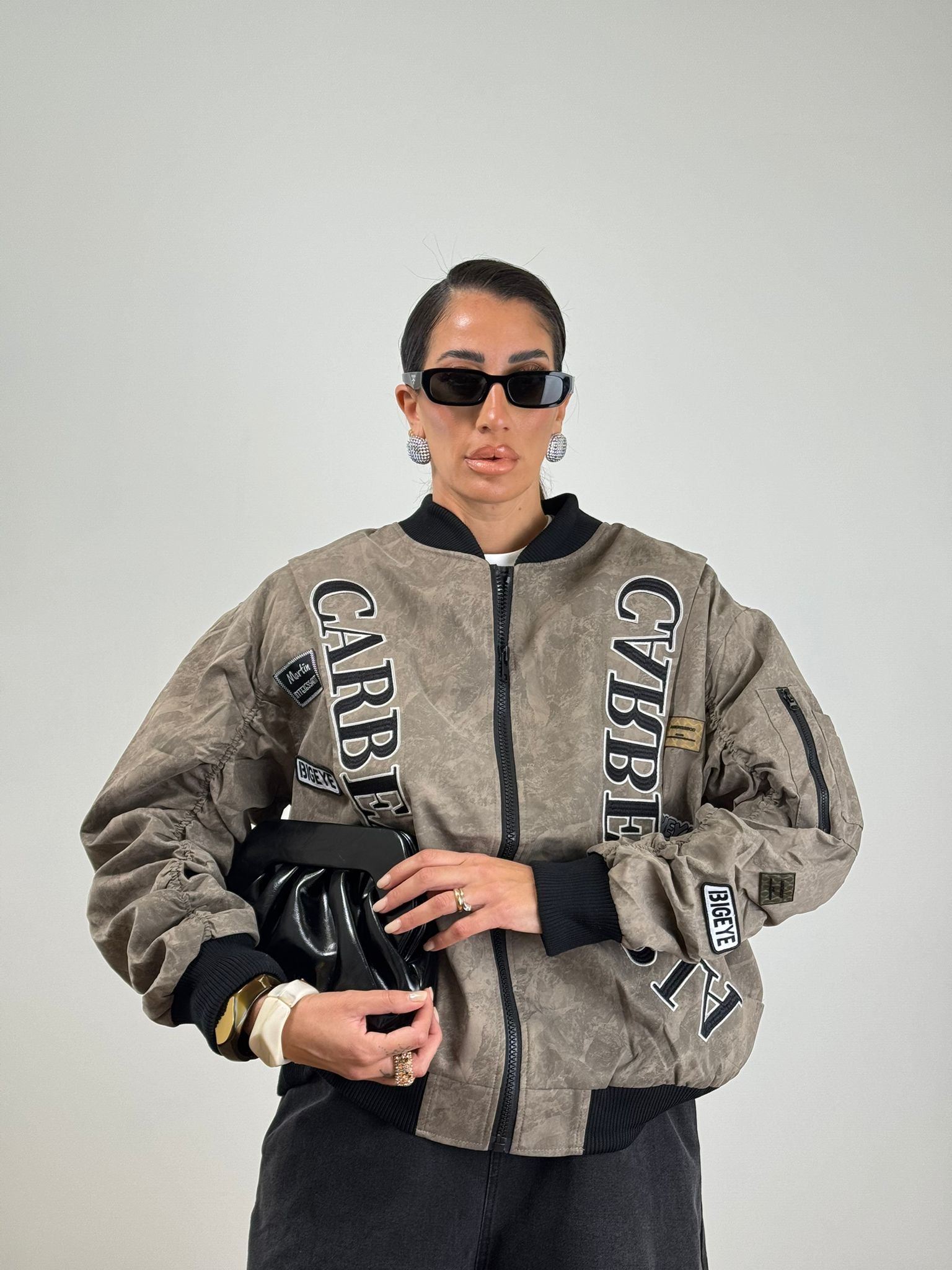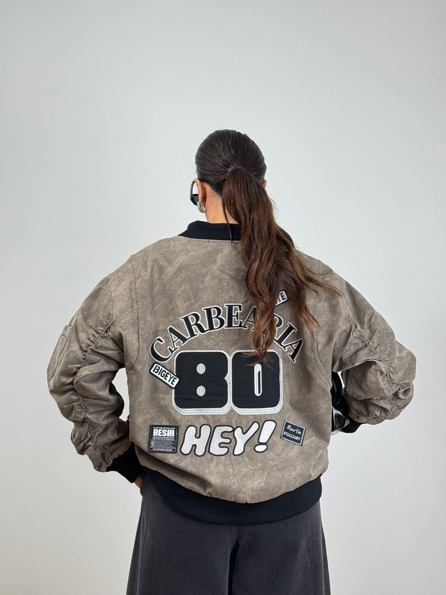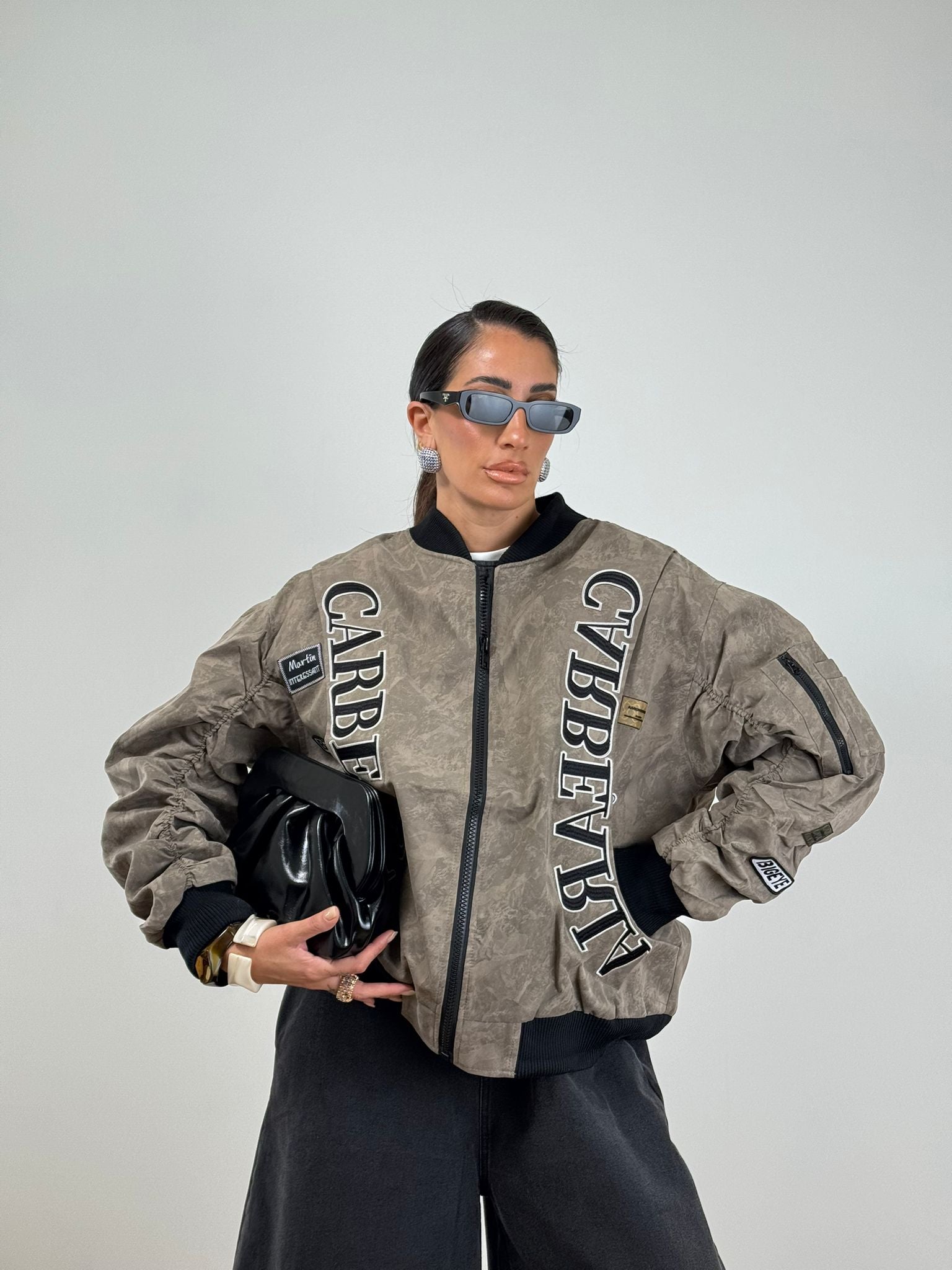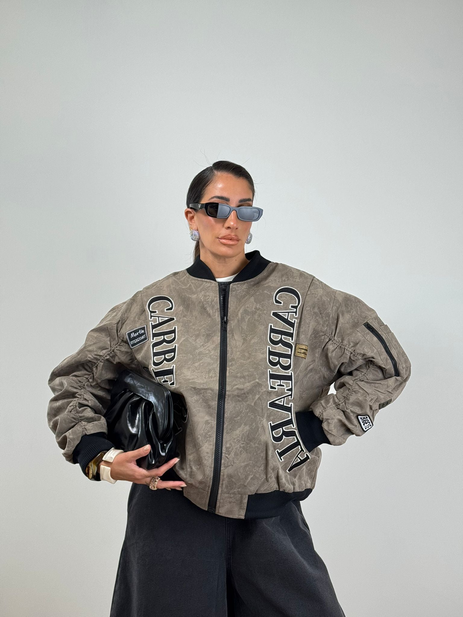 Bomber oversize Grey con patch , maniche arricciate e cannole’. Taglia unica