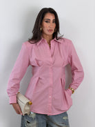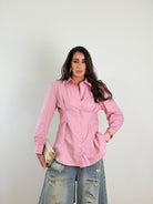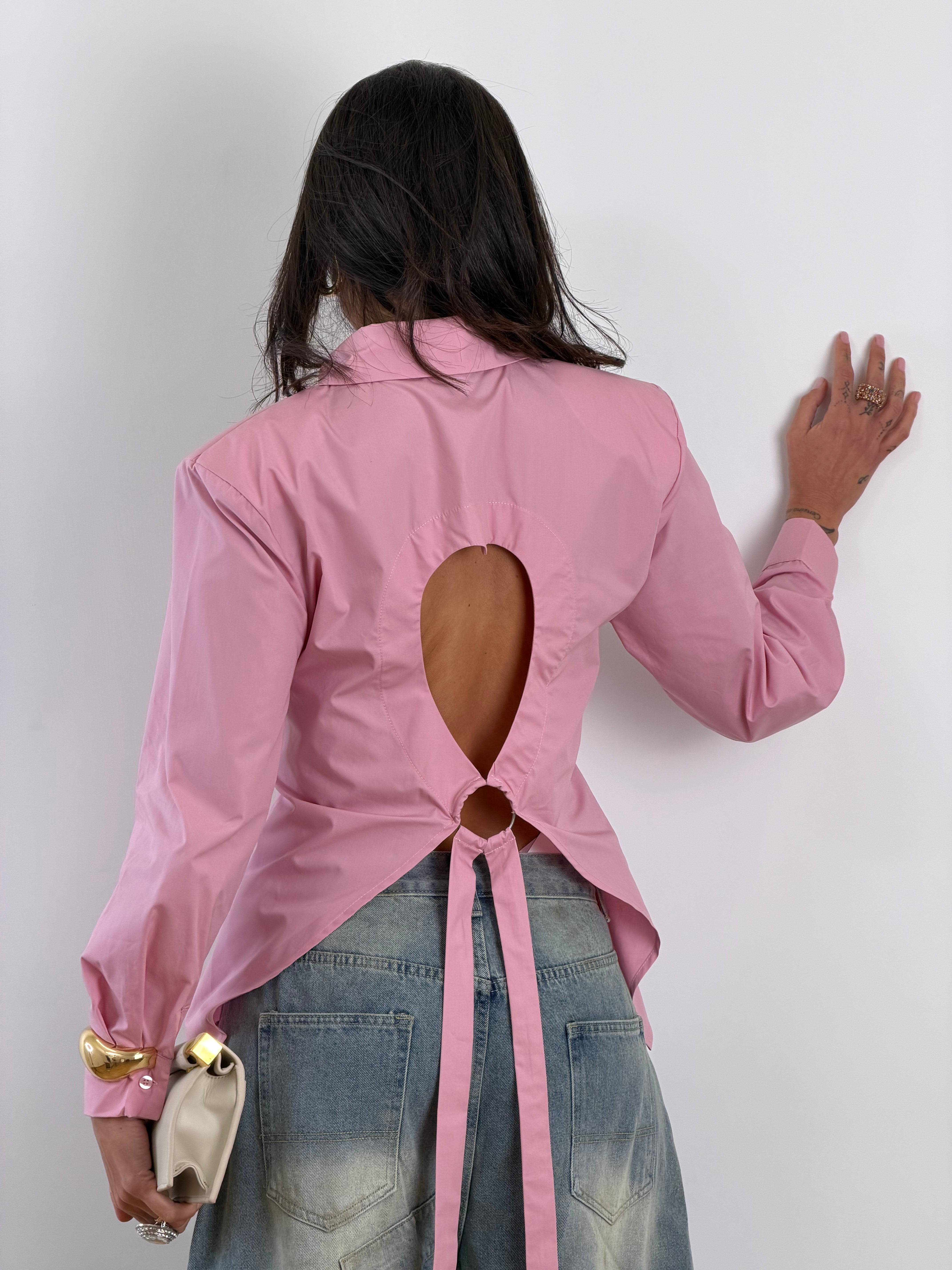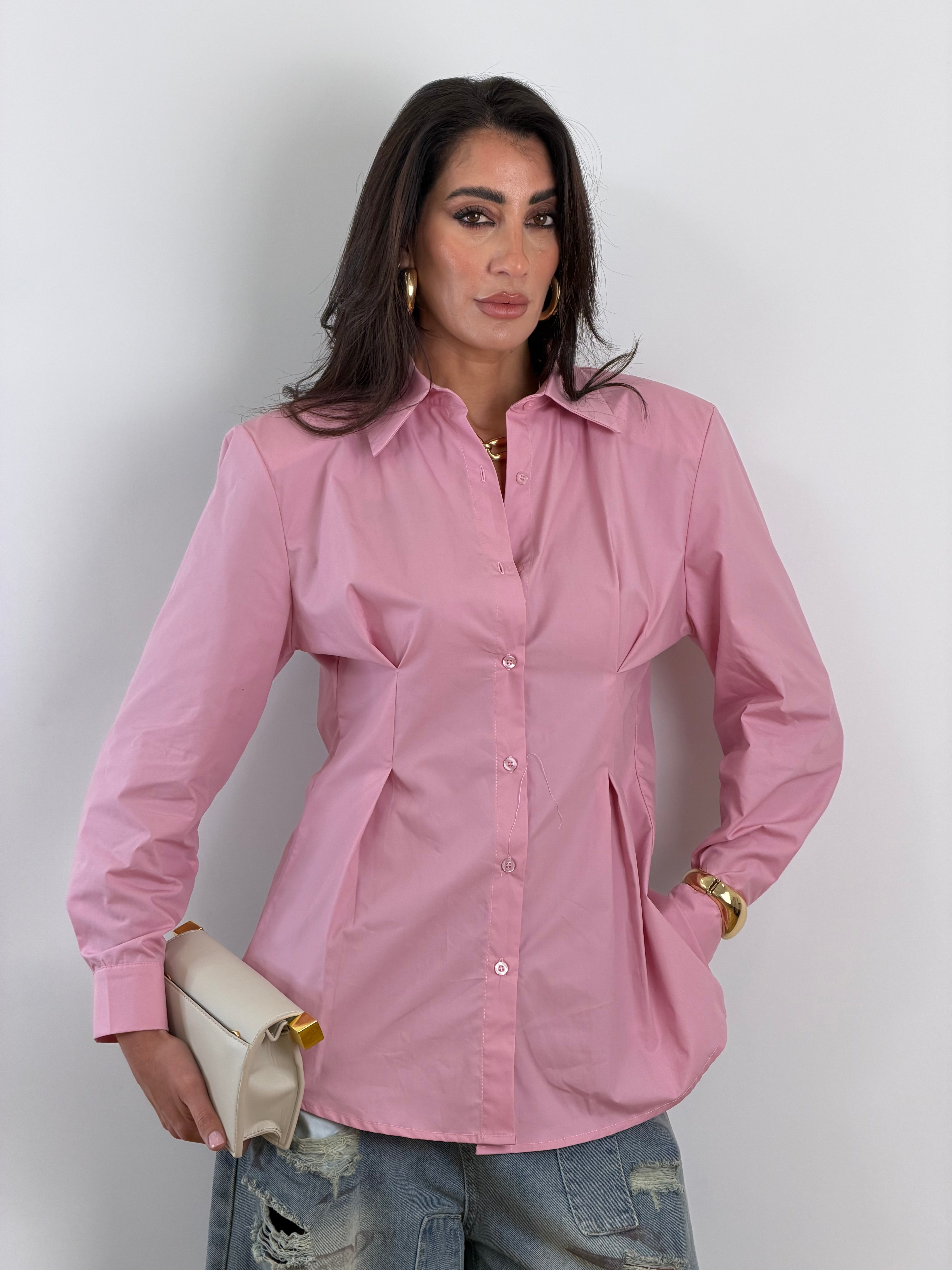Camicia rosa confetto. Taglio a clessidra con pinces frontali che stringono il punto vita. Spalline imbottite. Colletto classico a punta. Polsini alti con chiusura a bottone. Apertura posteriore a cuore. Taglia unica