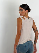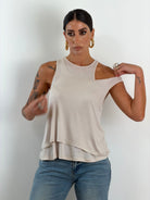 Canotta con design a strati.Scollo Girocollo Taglio: Svasato con vestibilità morbida e fluida.Spalline: Larghe, con design a vogatore accennato. 95% cotone 5% elastene. Taglia unica
