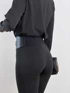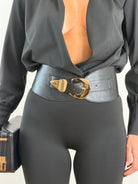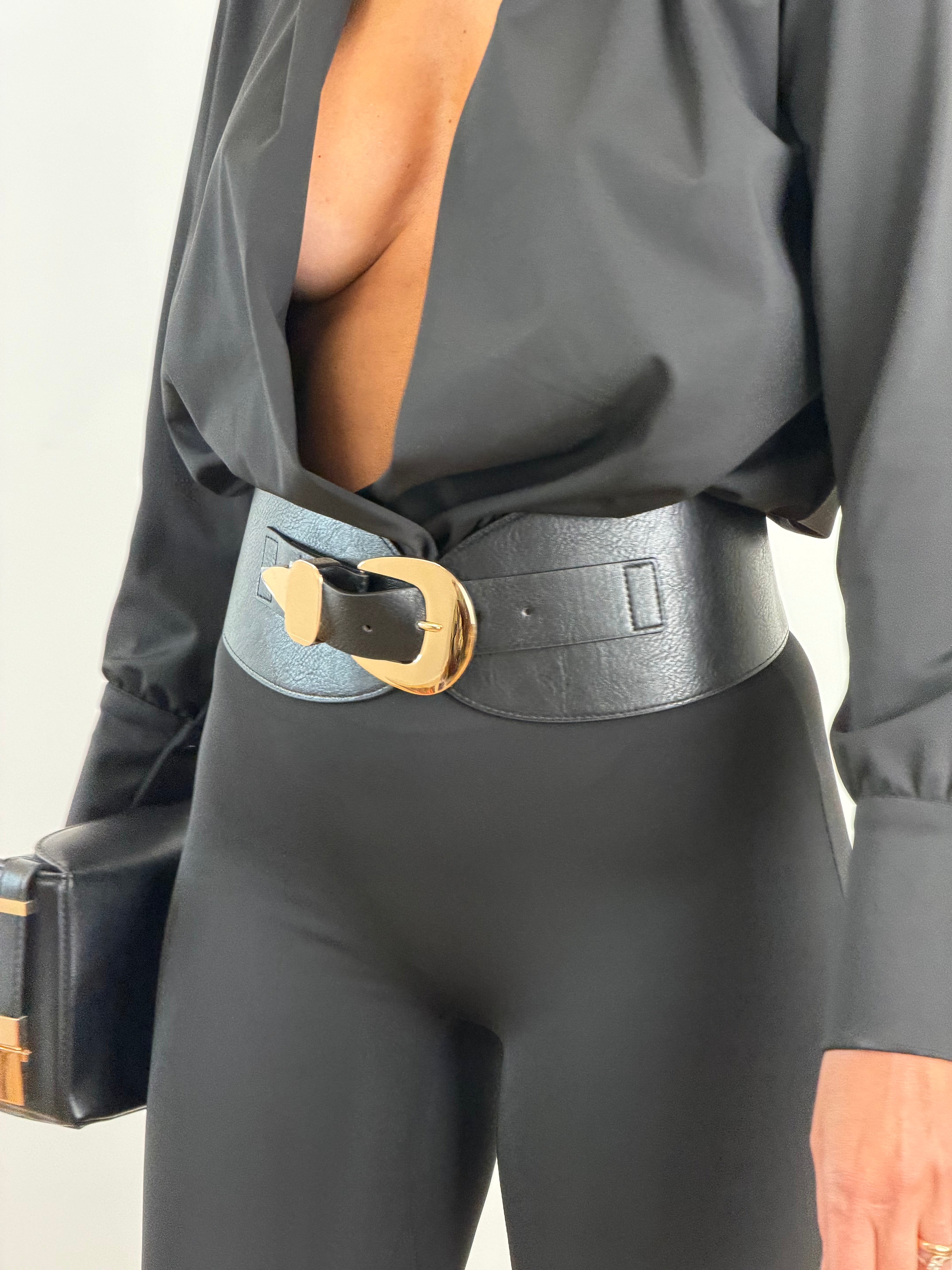 Cinturone ecopelle nero con elastico e fibbia oro.