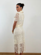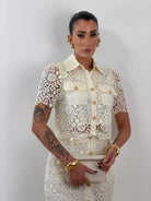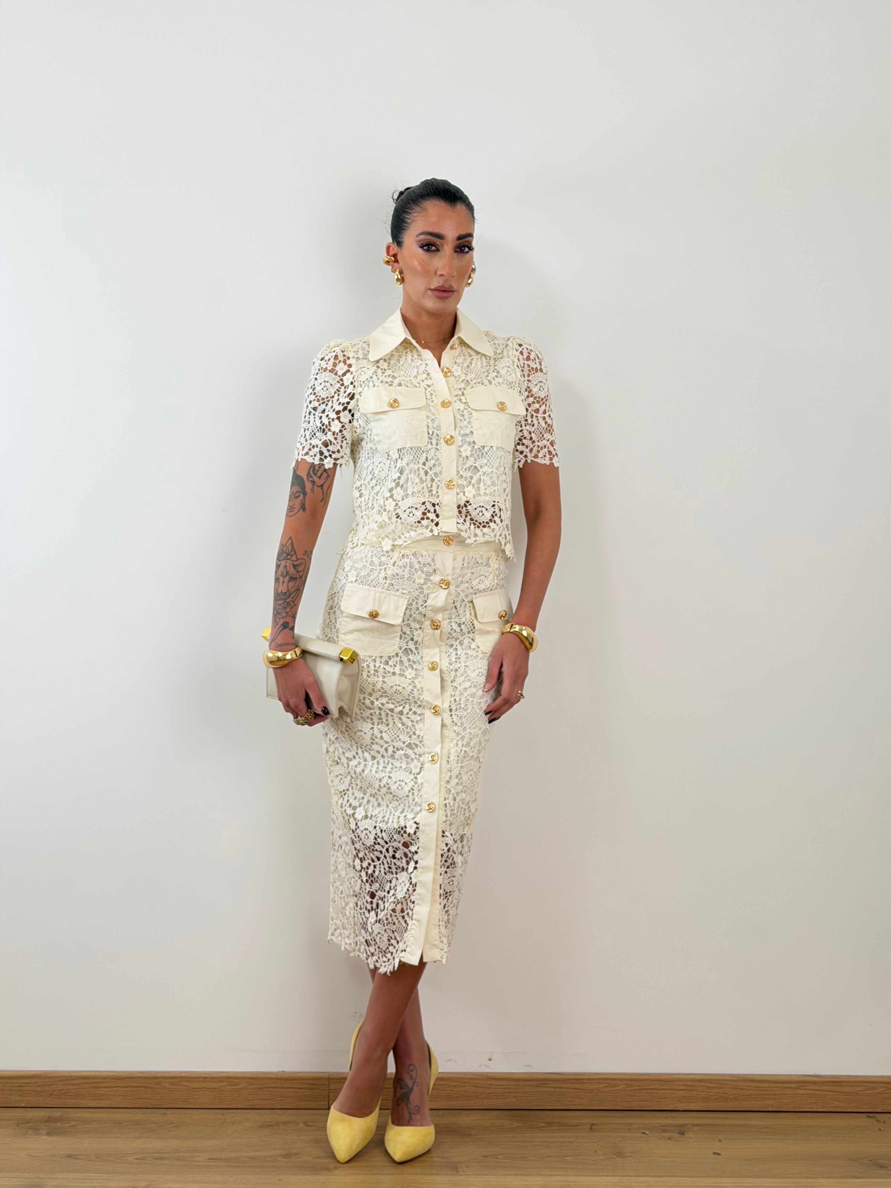 Coordinato in pizzo con motivi floreali. Fodera interna. Camicia mezza manica con colletto classico pattina sul petto e chiusura con bottoni dorati. Gonna lounguette con bottoni centrali e tasche applicate sui fianchi.
