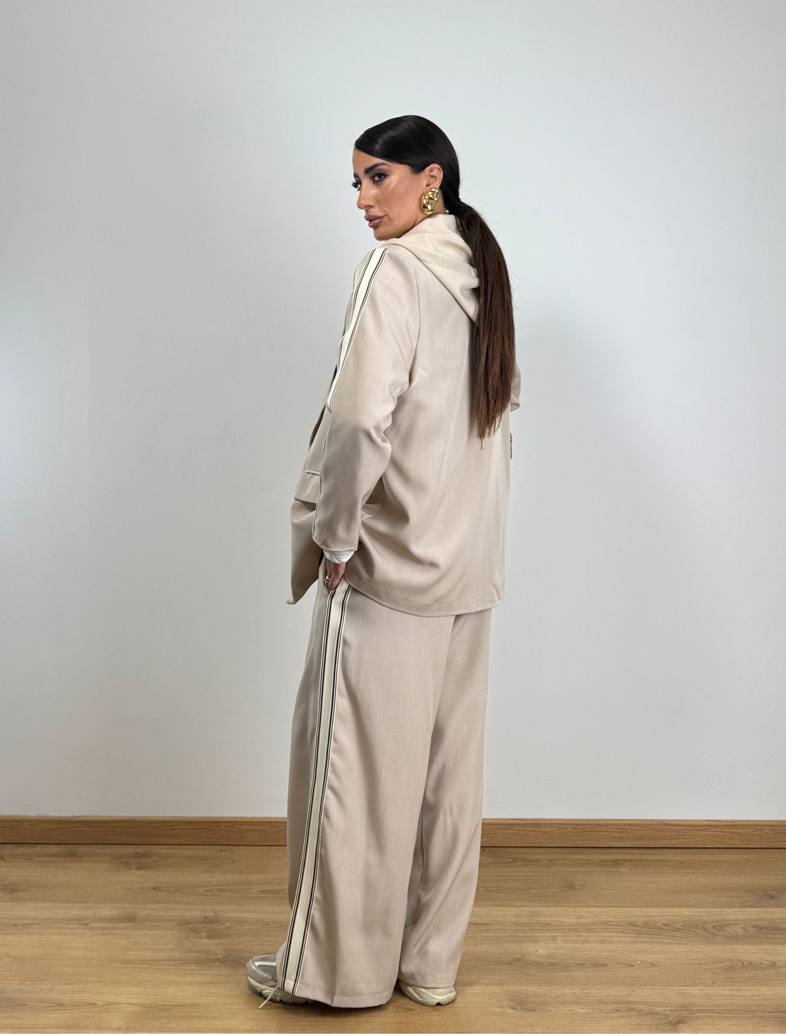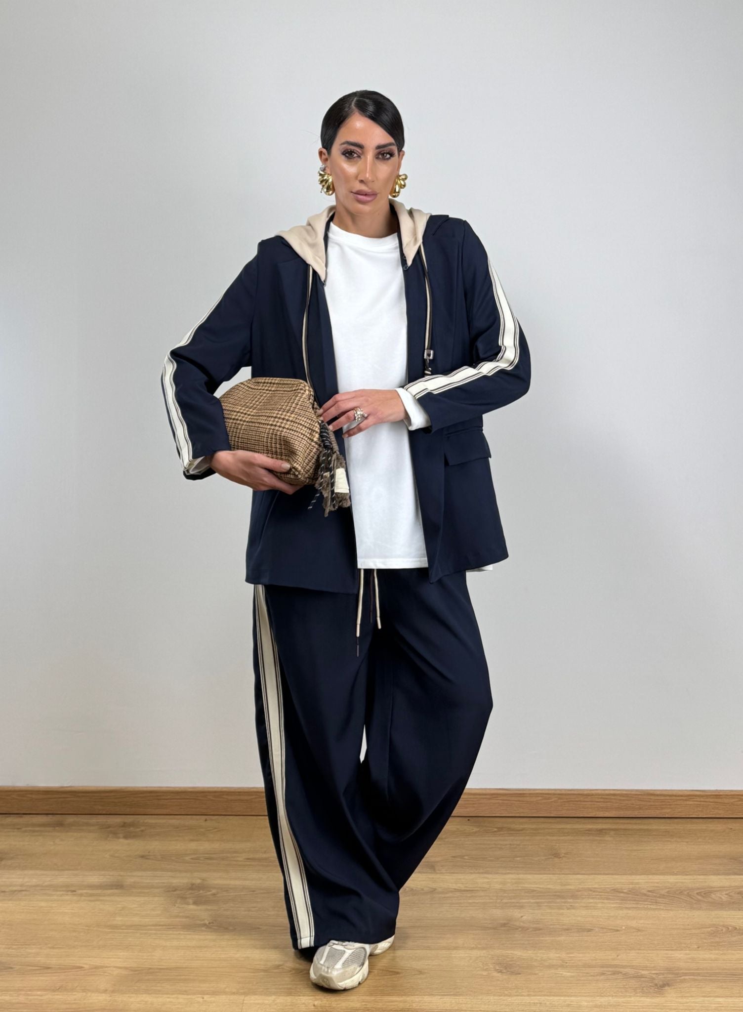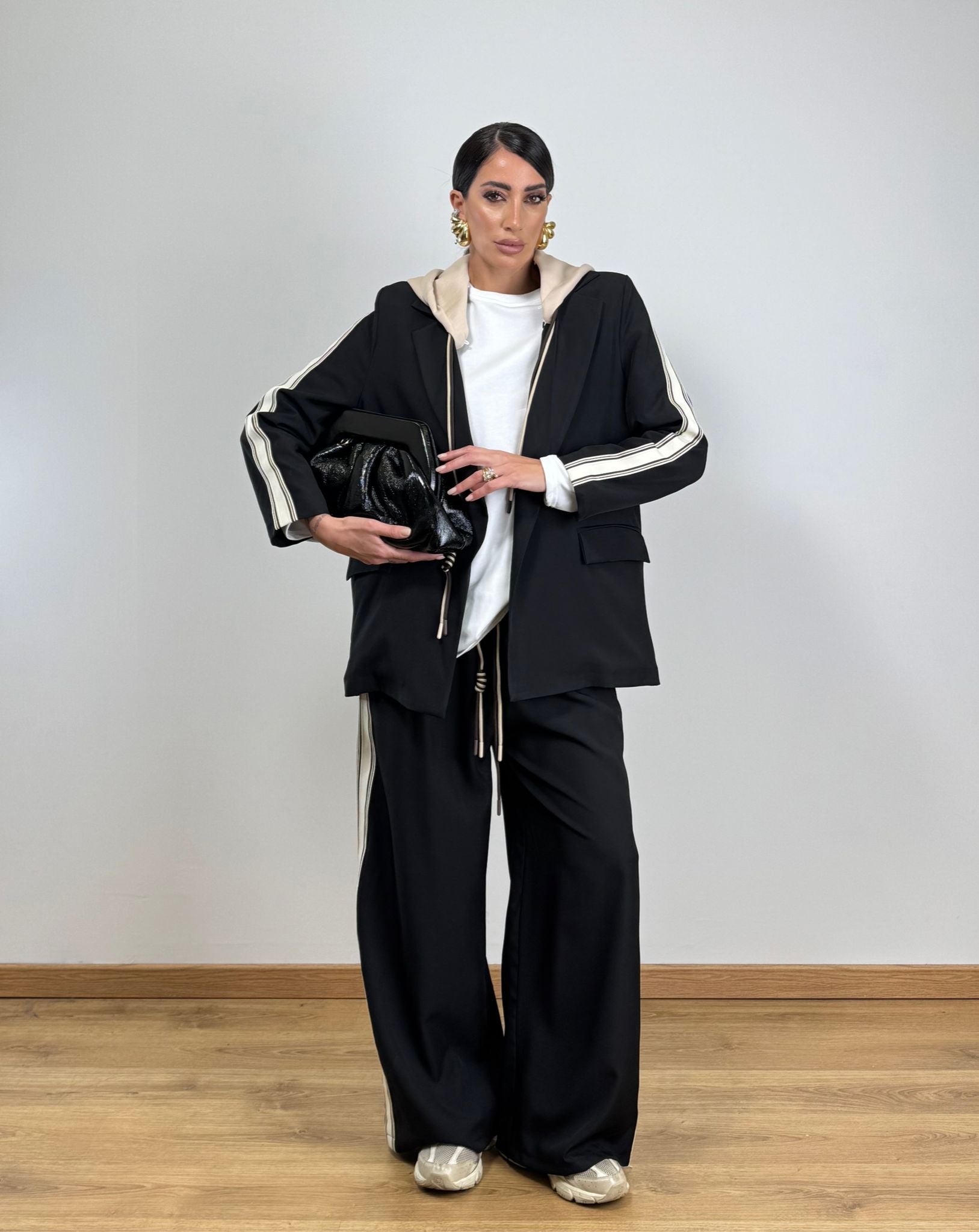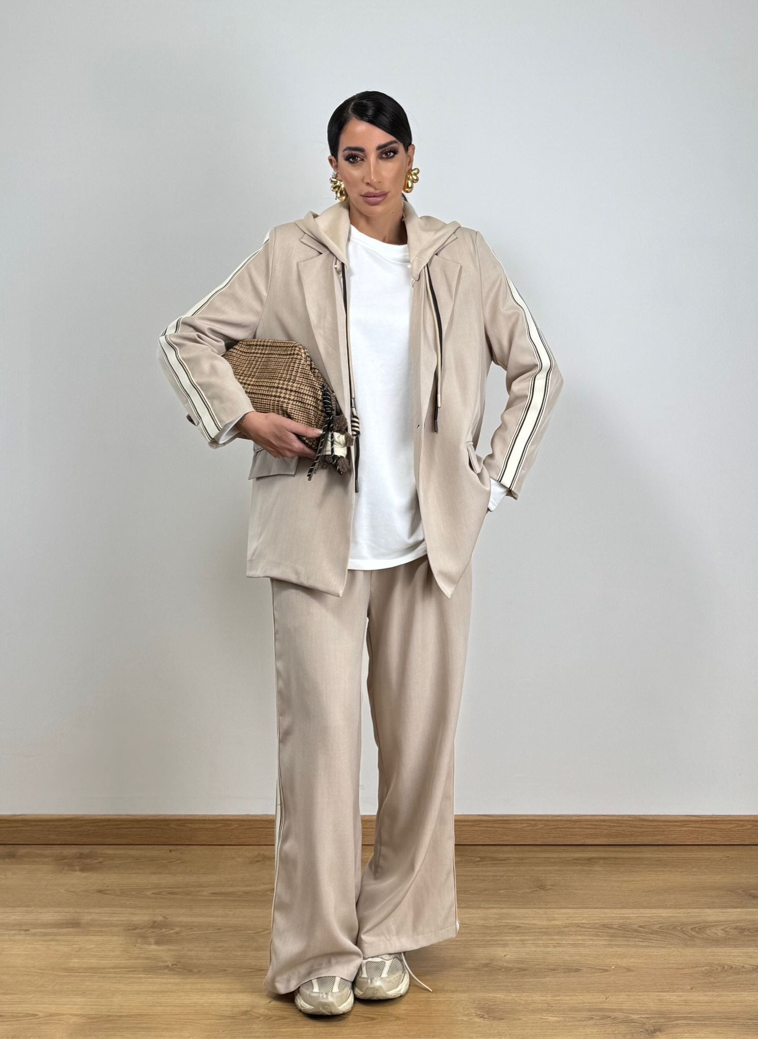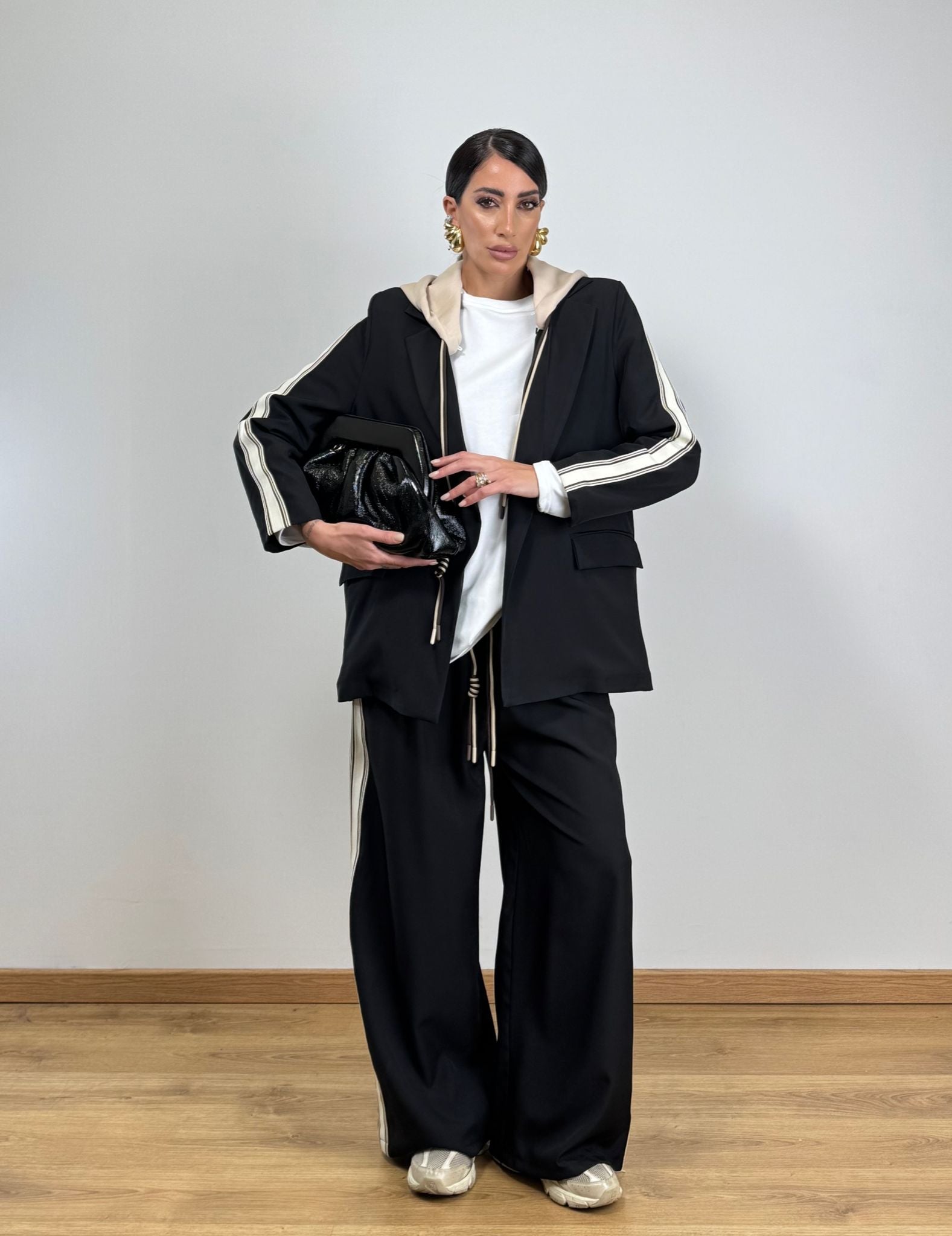 Coordinato con banda laterale taglia unica composto da blazer con cappuccio removibile, e pantalone palazzo con elastico in vita