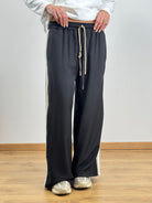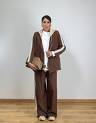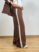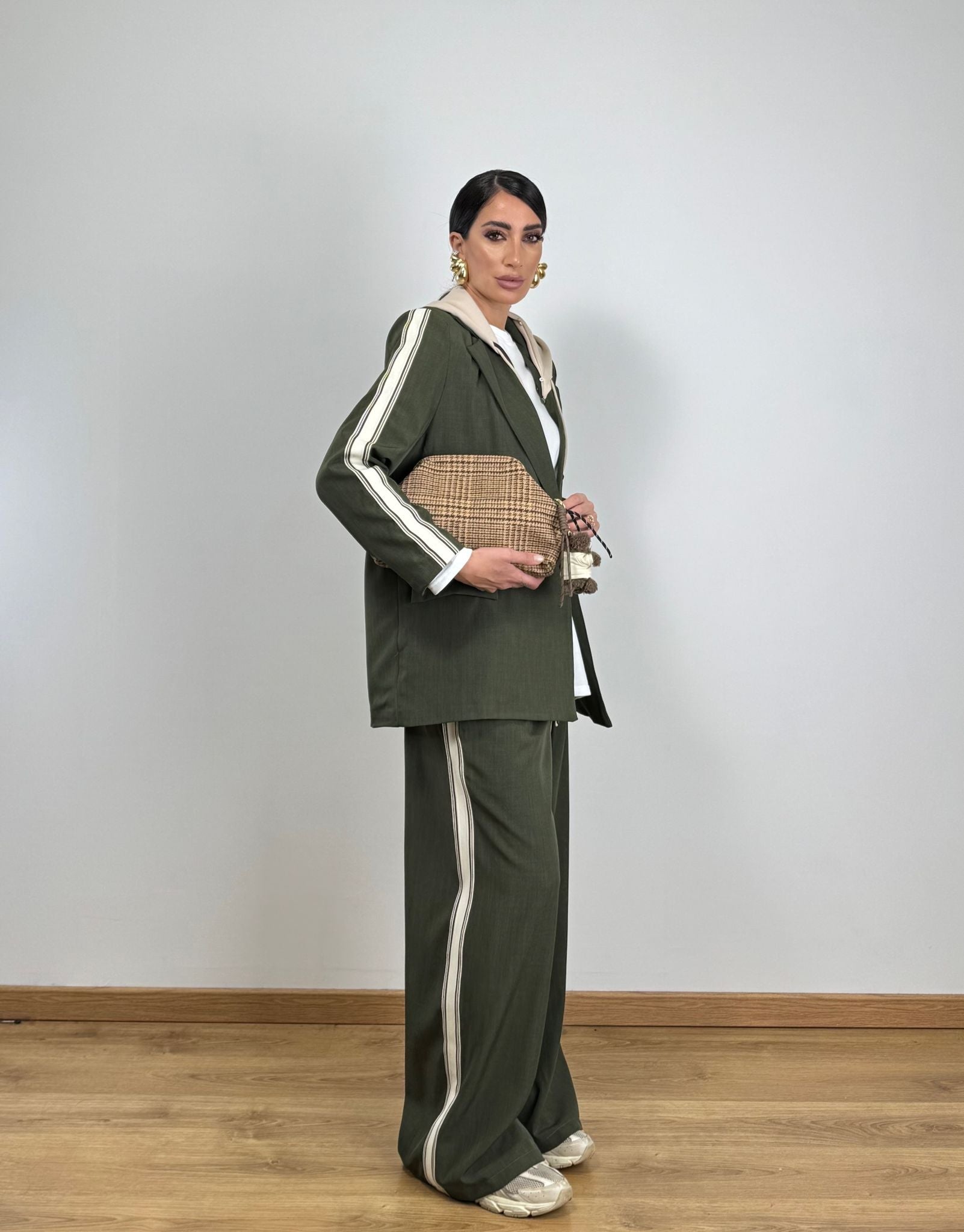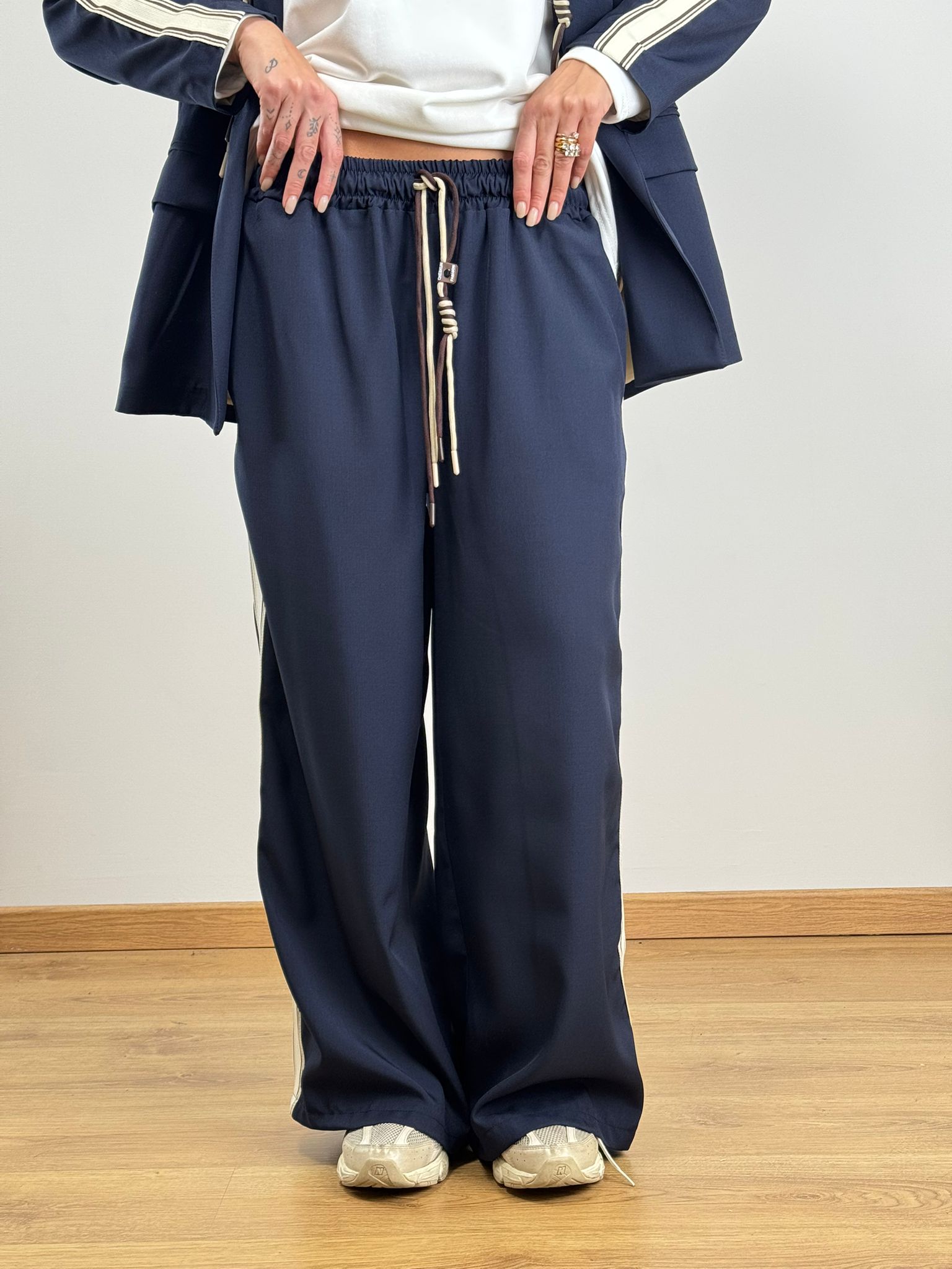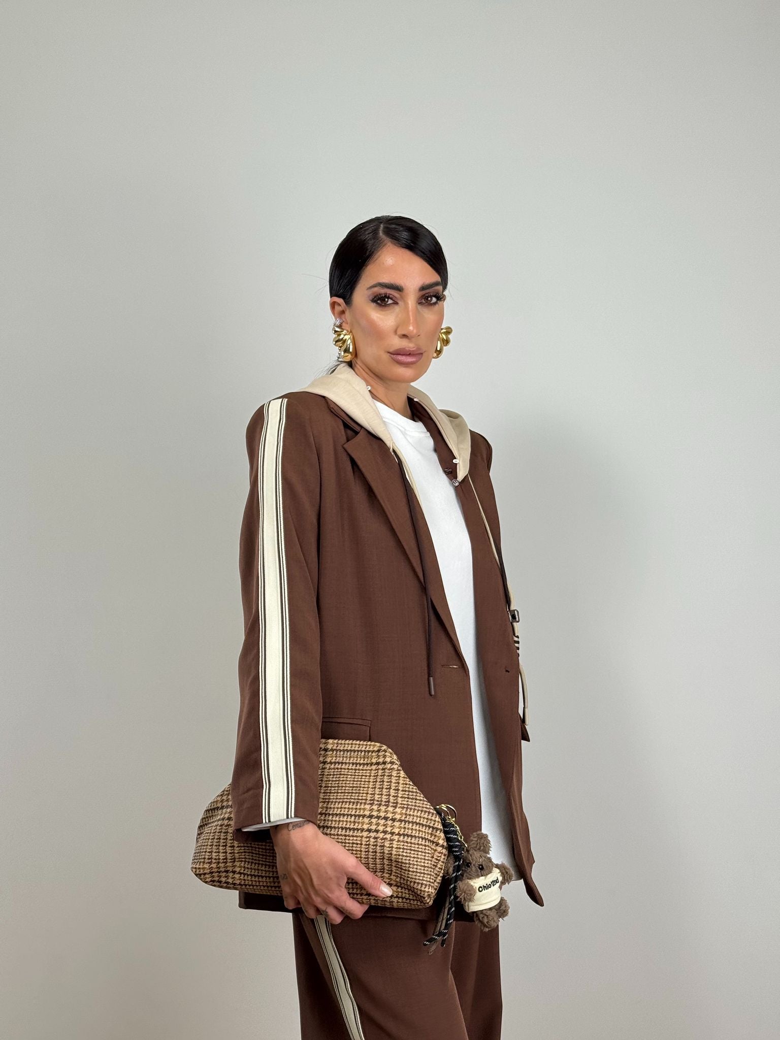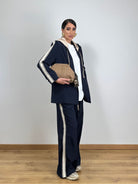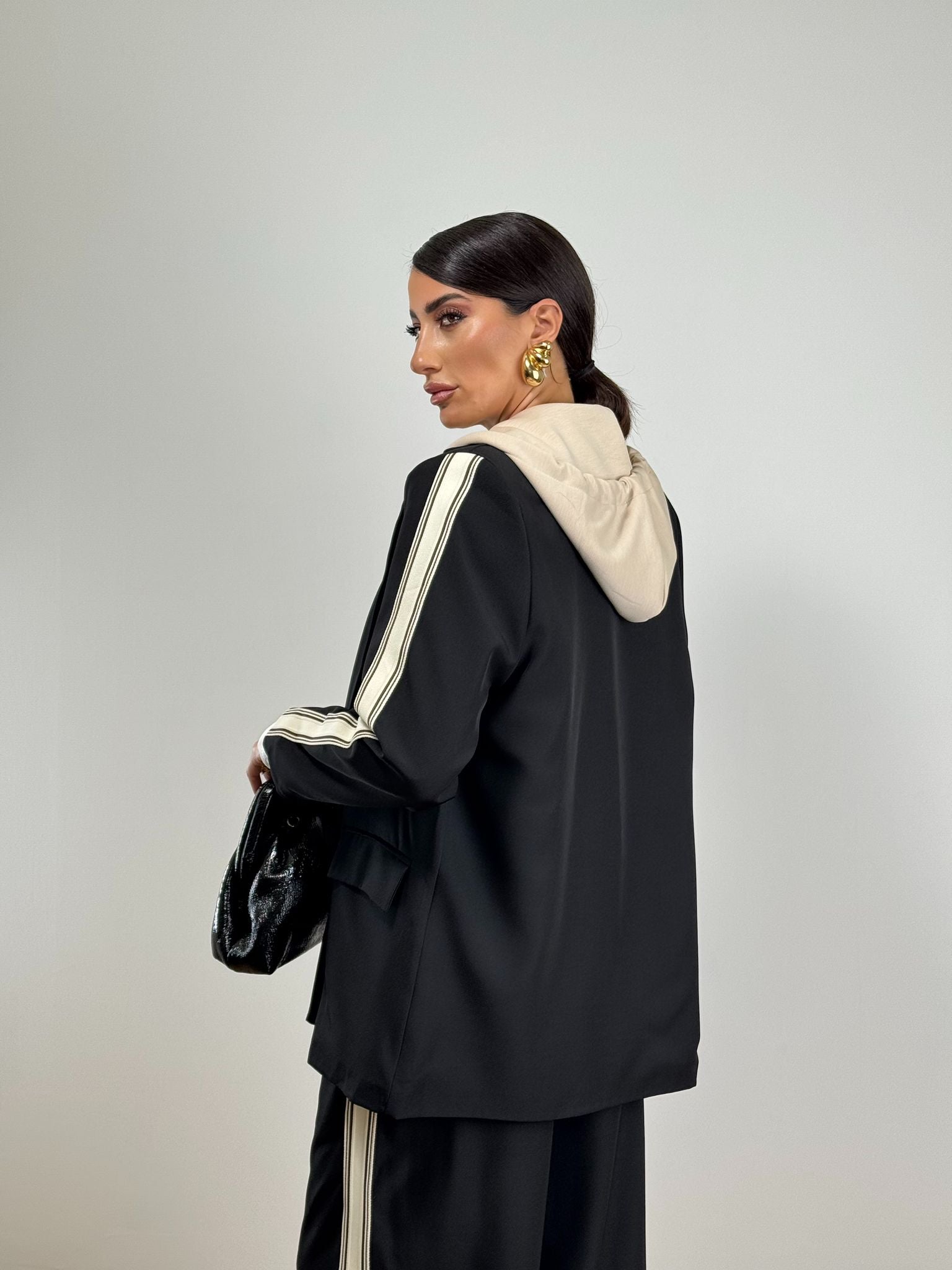 Coordinato con banda laterale taglia unica composto da blazer con cappuccio removibile, e pantalone palazzo con elastico in vita