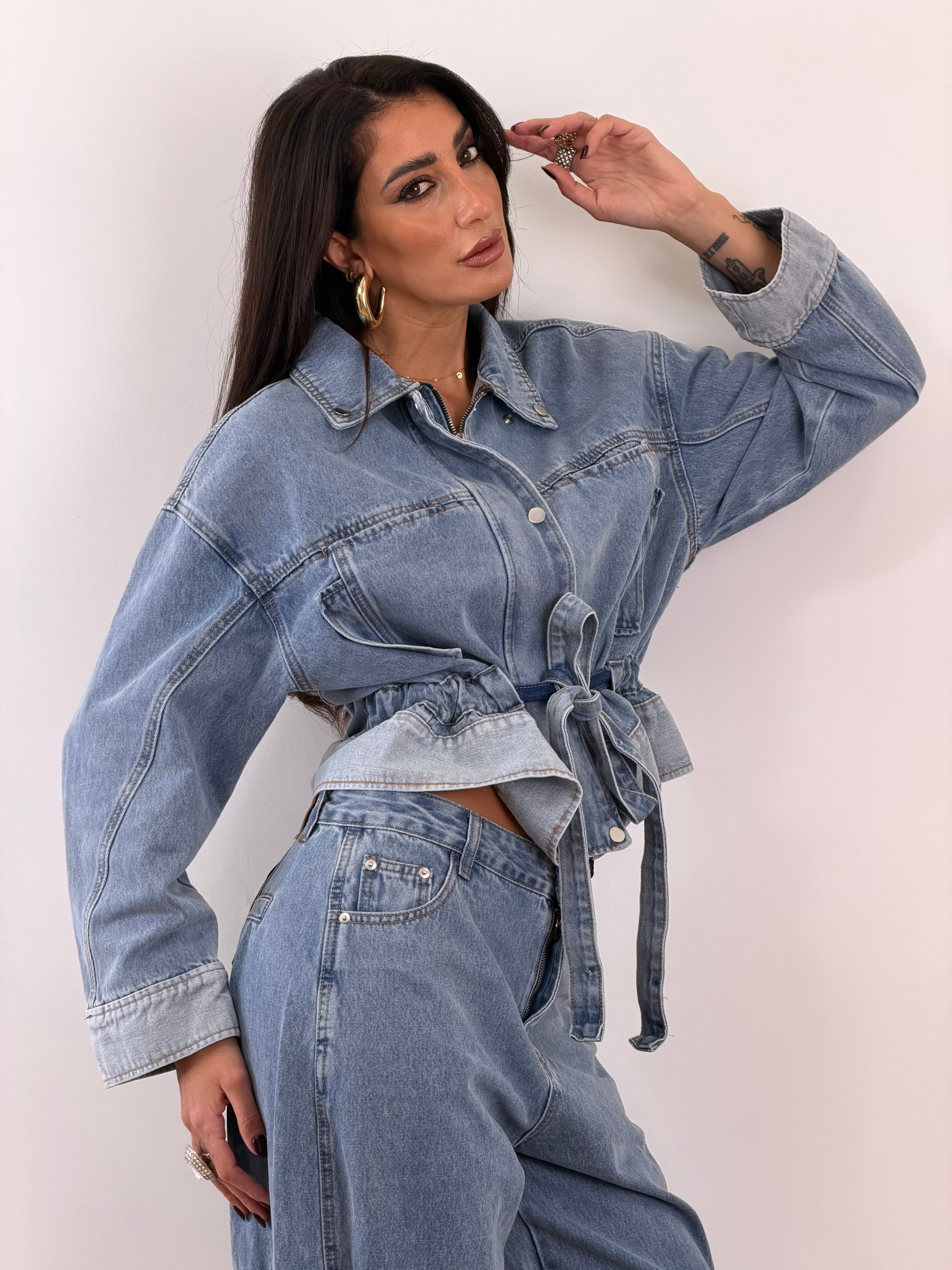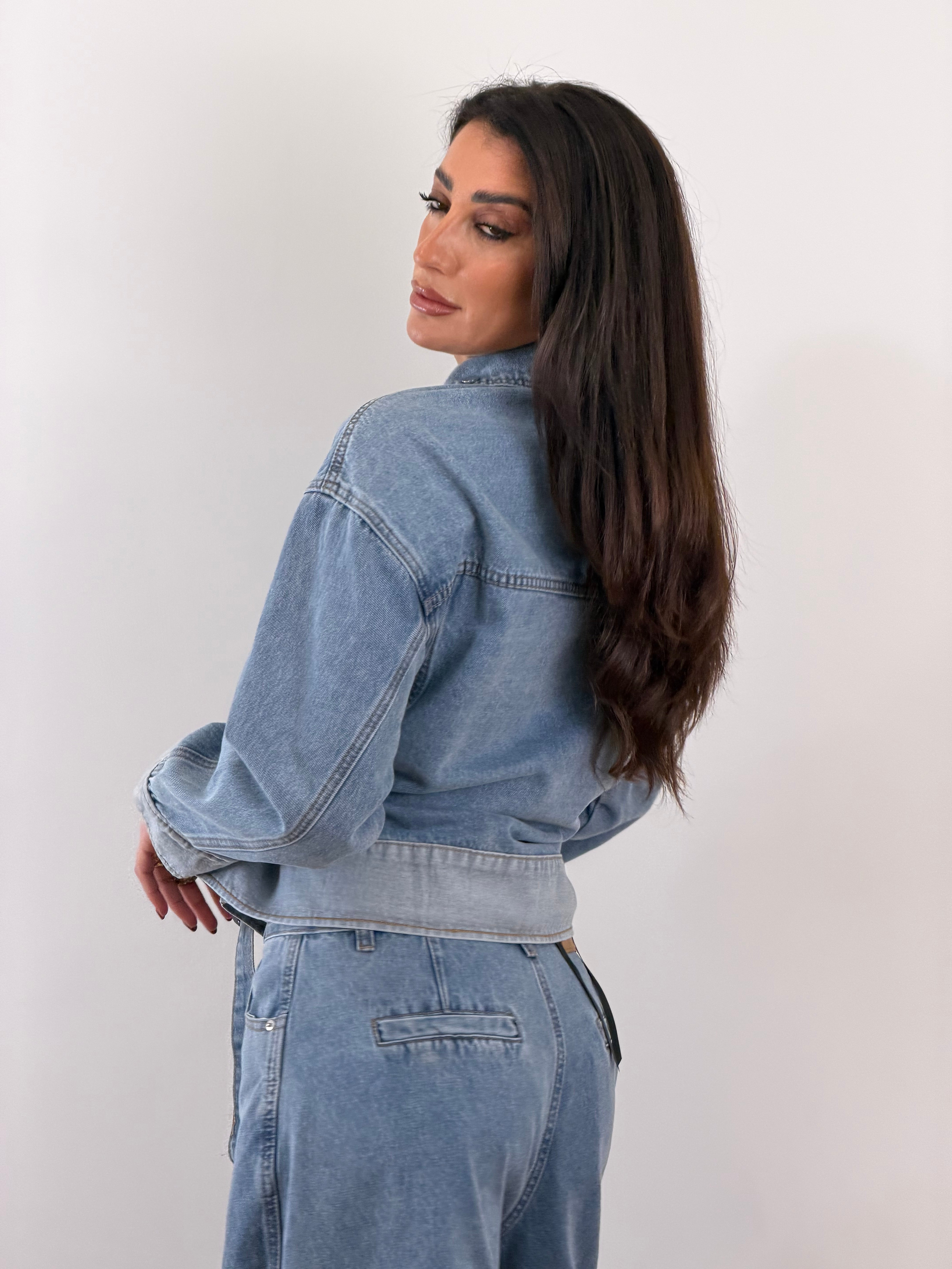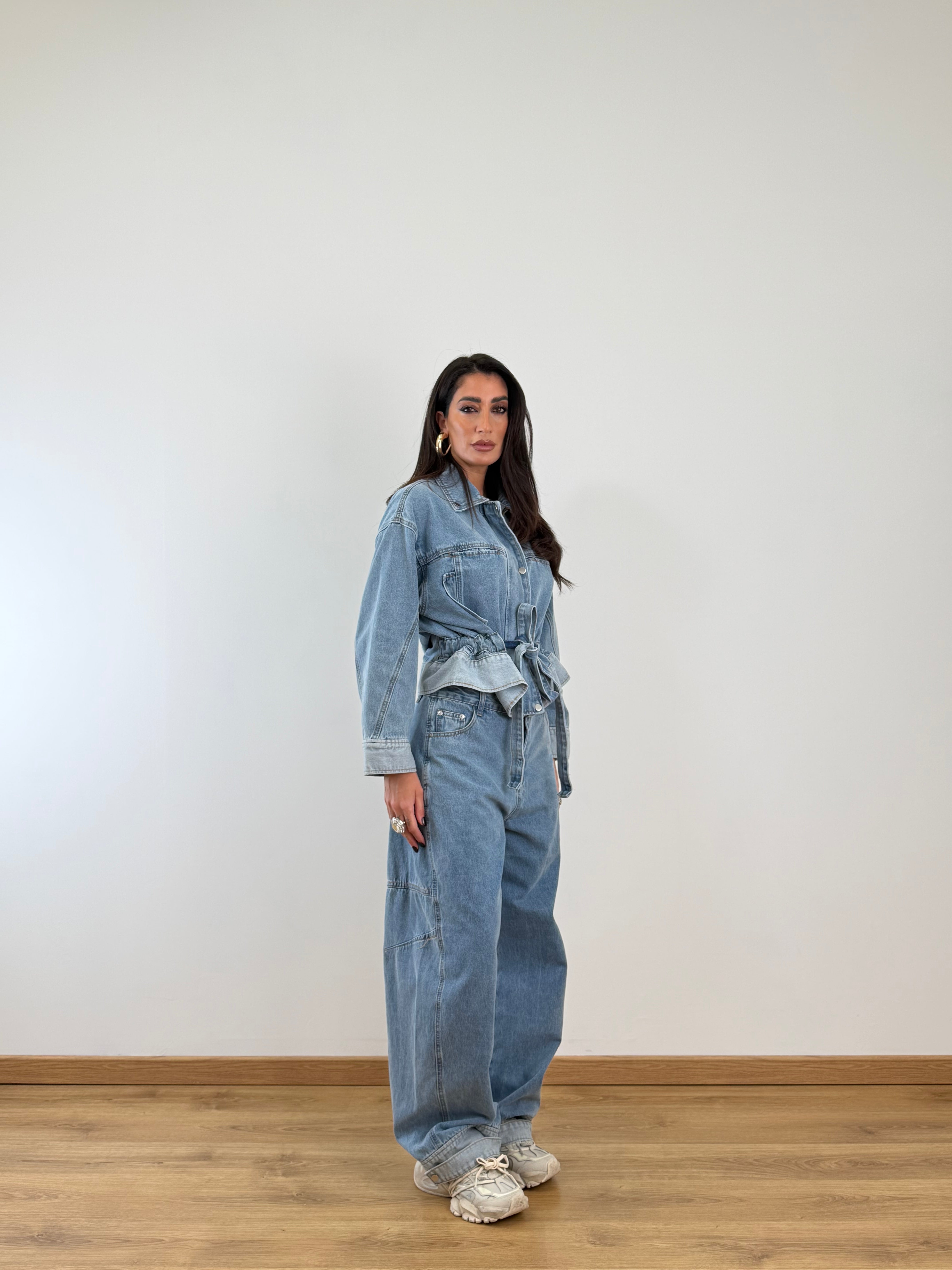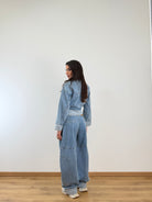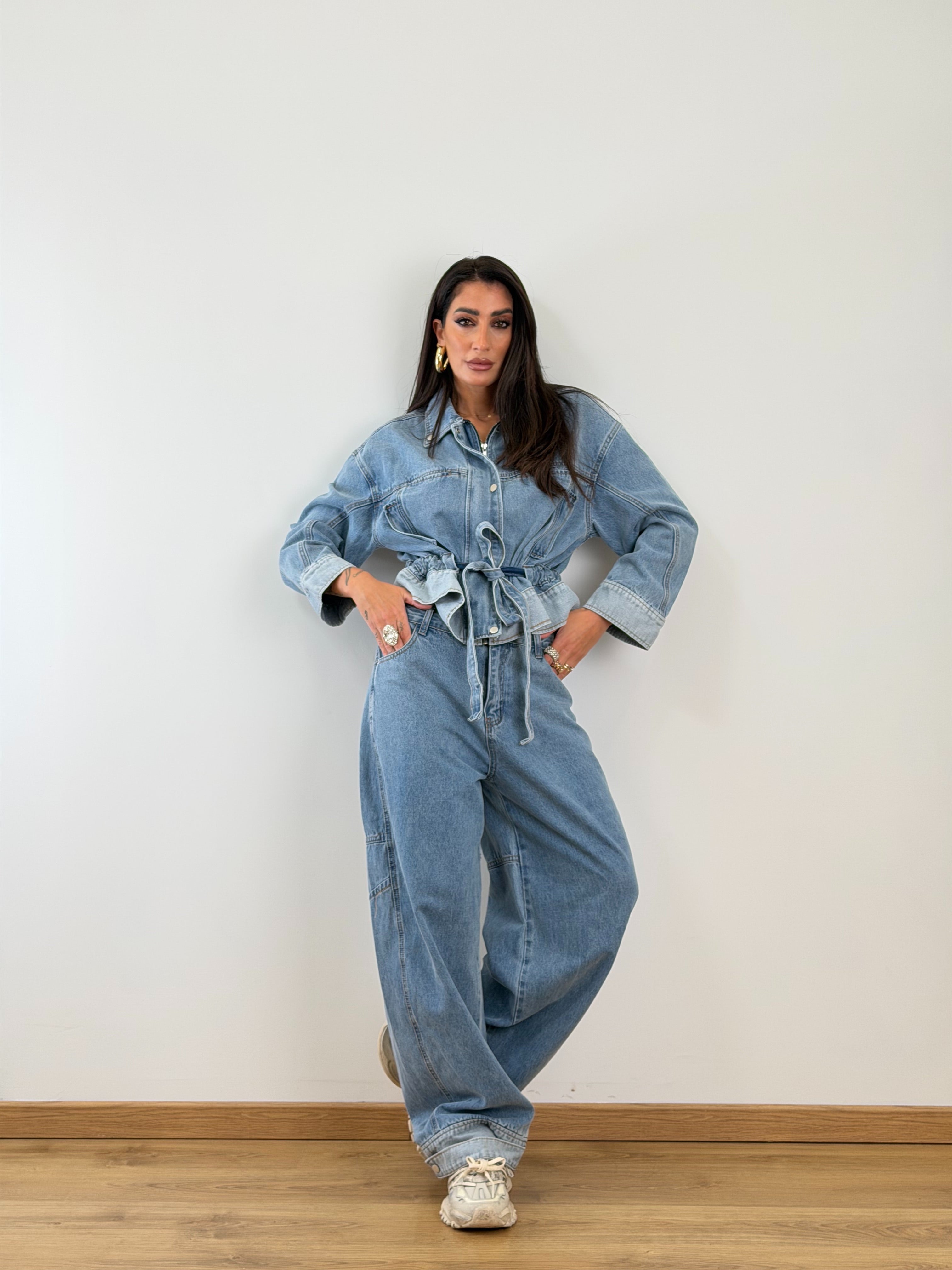 Coordinato jeans con giacca con chiusura zip e bottoni. Tasconi frontali e coulisse in vita. Jeans balloon con bottoncino sul fondo.