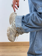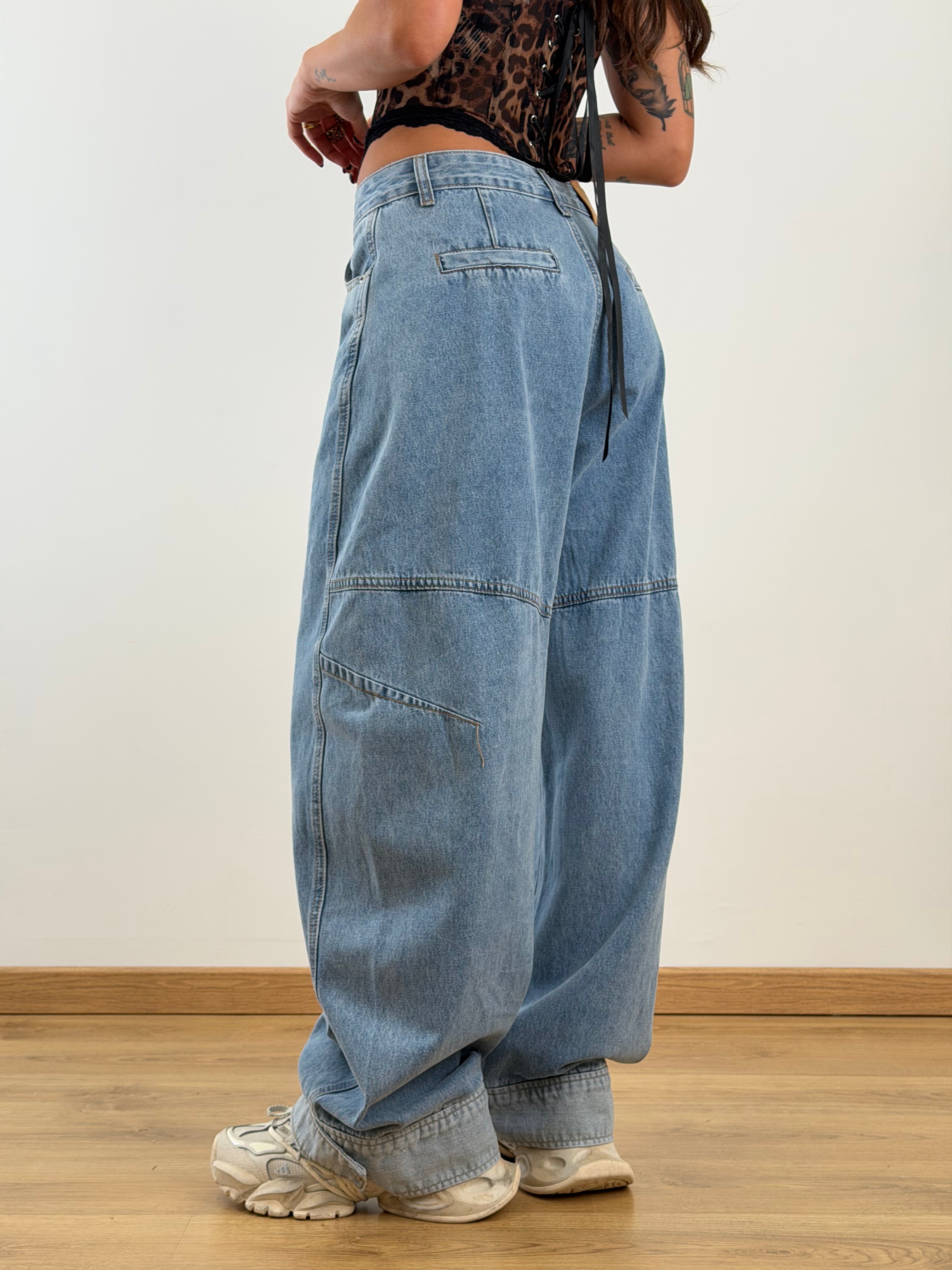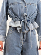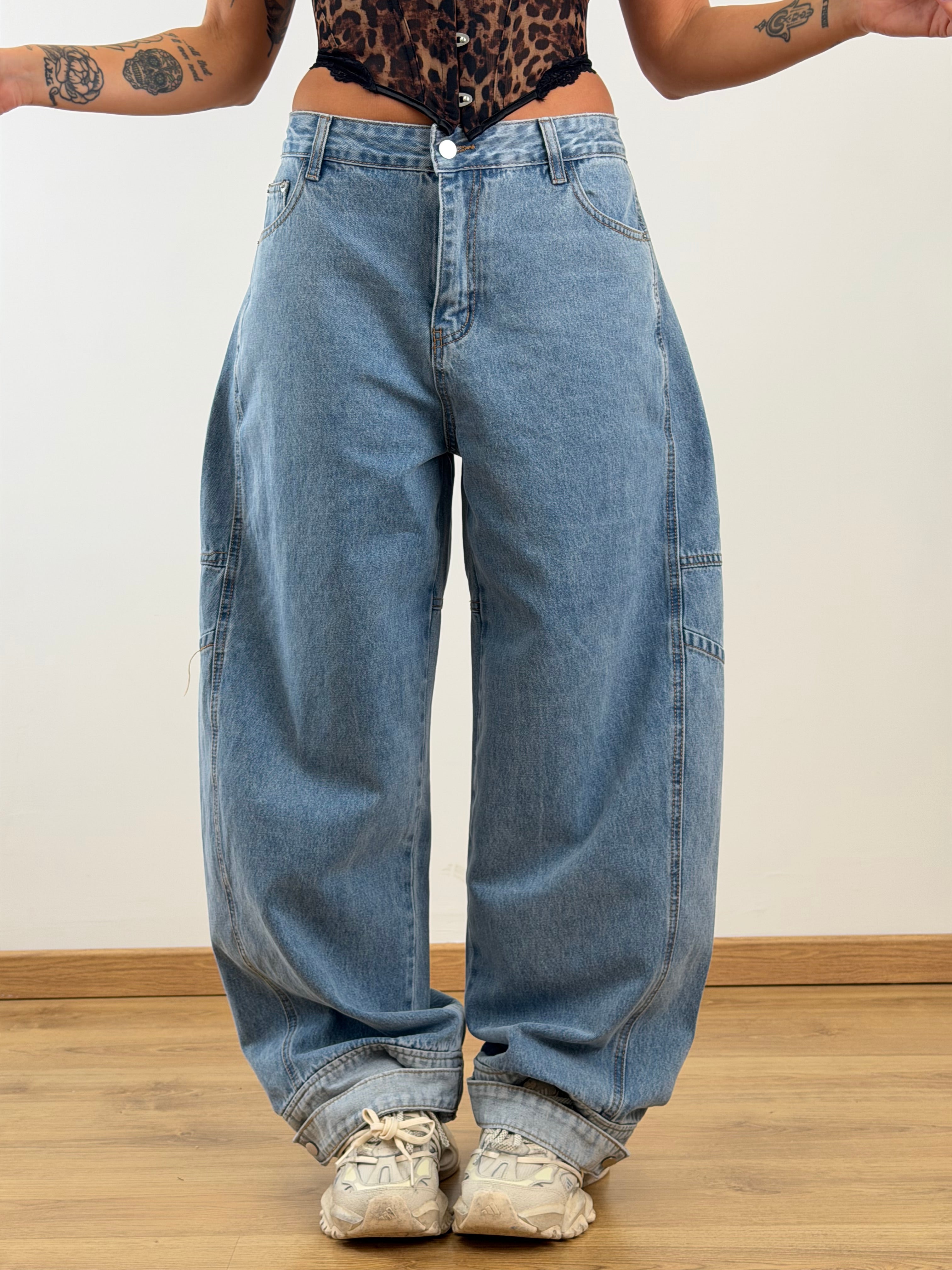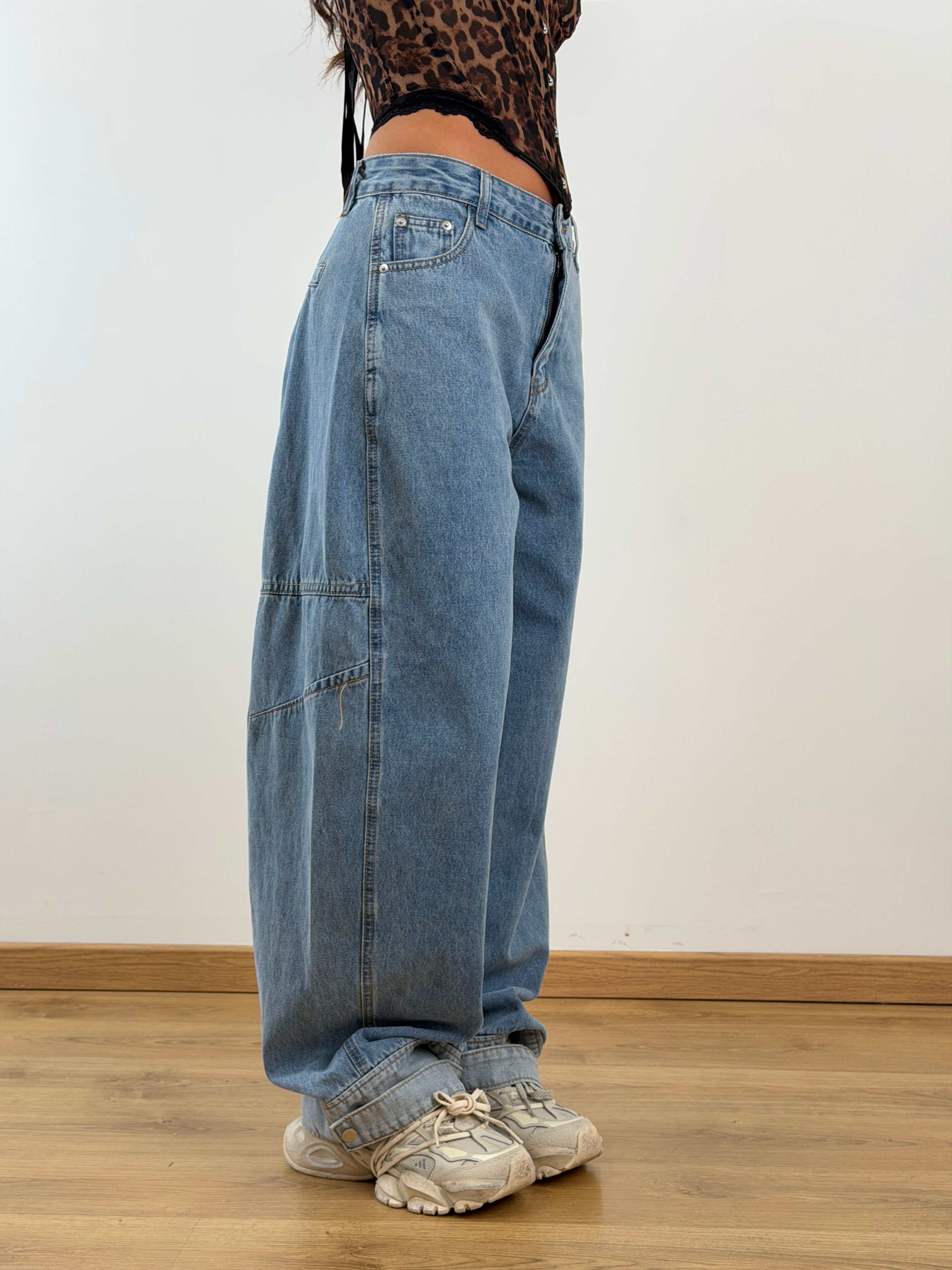 Coordinato jeans con giacca con chiusura zip e bottoni. Tasconi frontali e coulisse in vita. Jeans balloon con bottoncino sul fondo.