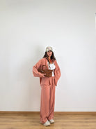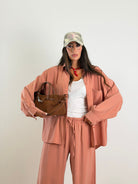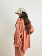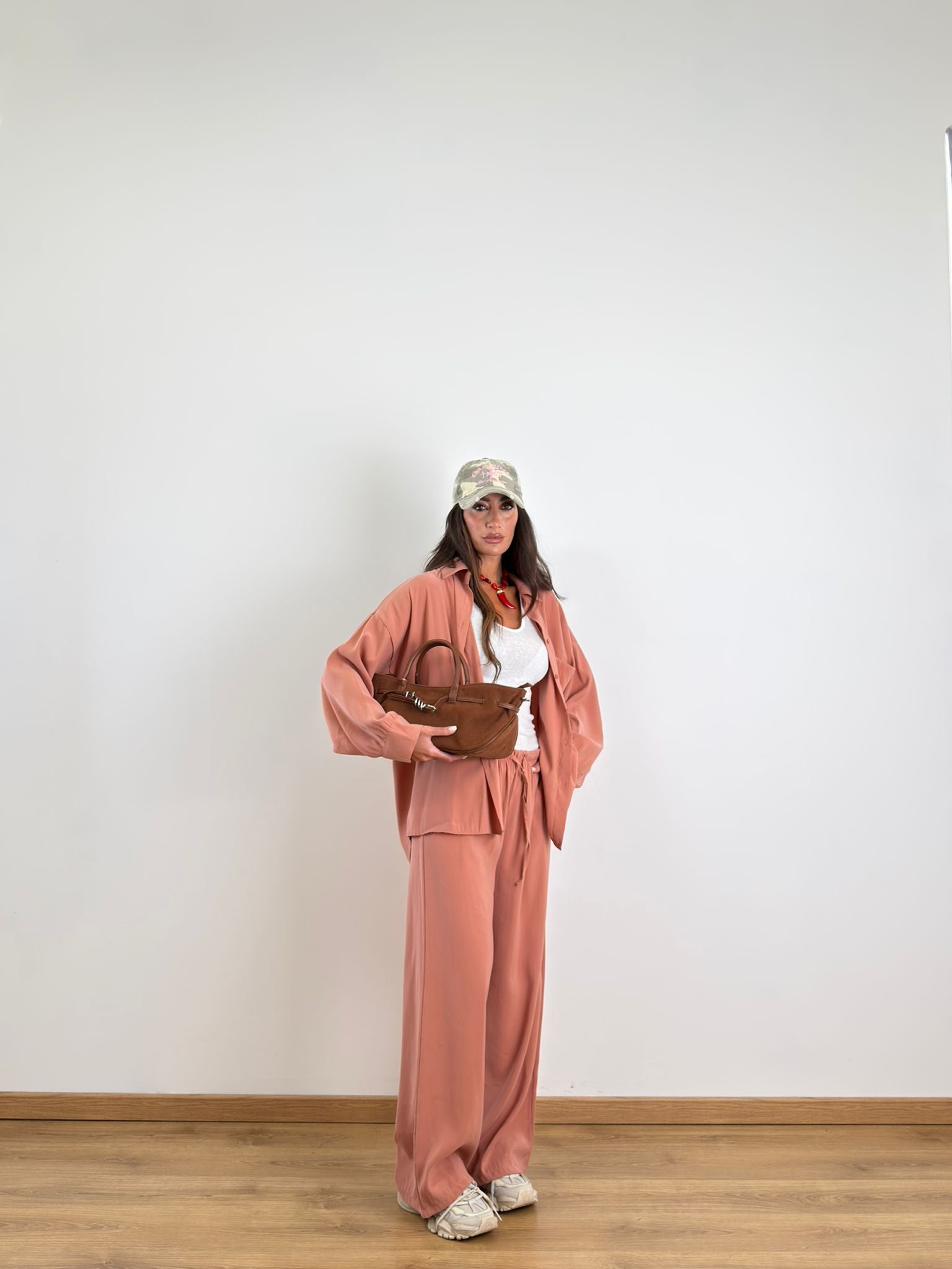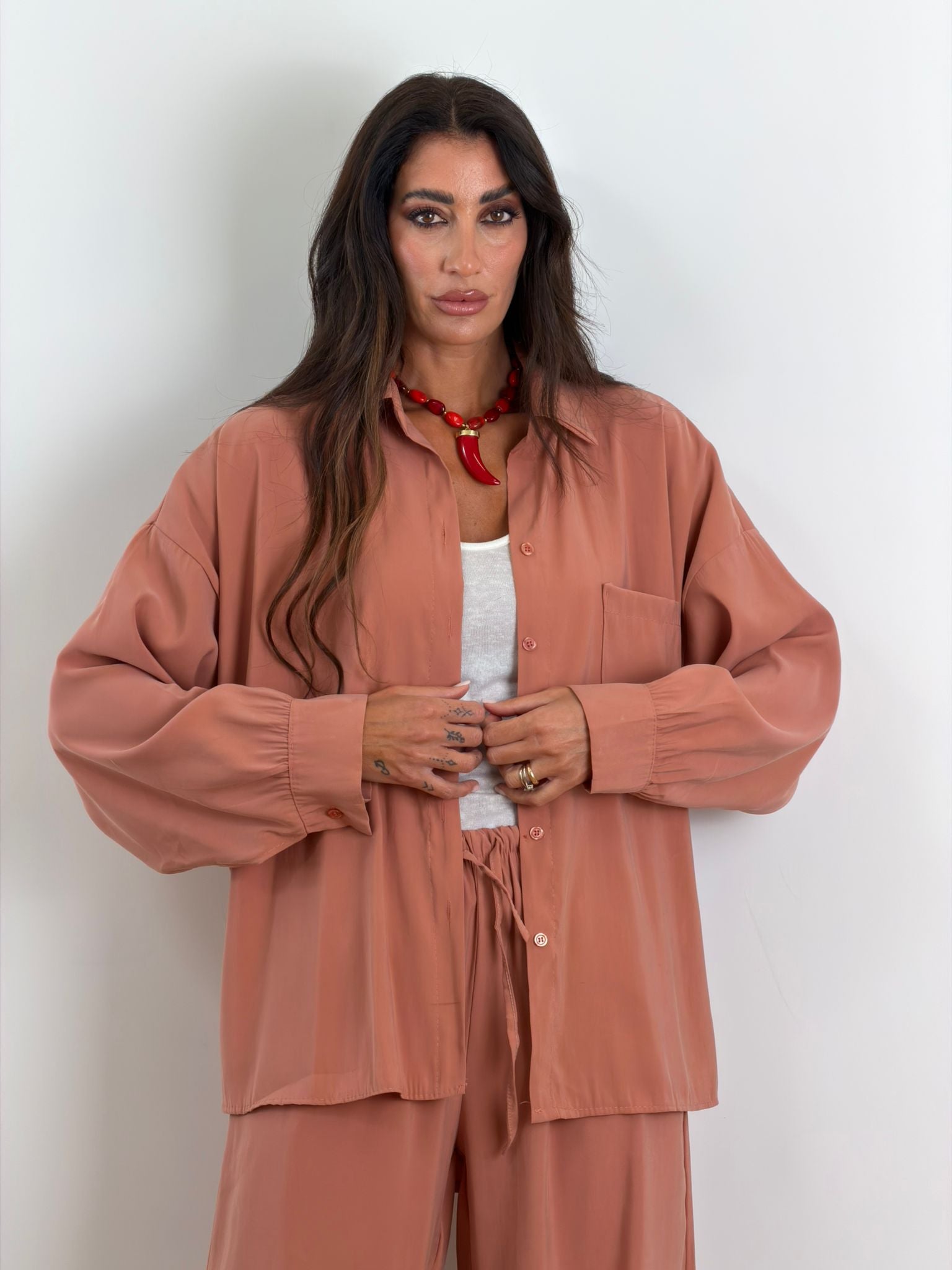Set due pezzi composto da camicia oversize e pantaloni fluidi.Dettagli Camicia:Taglio oversize con spalle scivolate.Colletto classico a punta.Abbottonatura frontale tono su tono.Orlo asimmetrico.Dettagli Pantaloni:Modello a gamba dritta e ampia.Vita alta elasticizzata con Coulisse regolabile.Vestibilità relax per il massimo comfort. 60%Viscosa. taglia unica.
