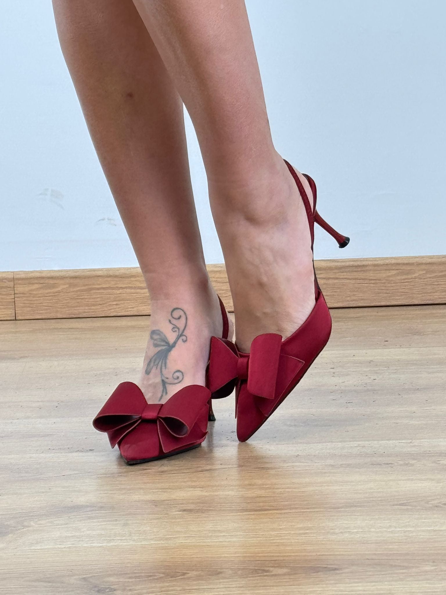 Décolleté rosso con tacco e punta chiusa con fiocco applicato