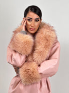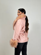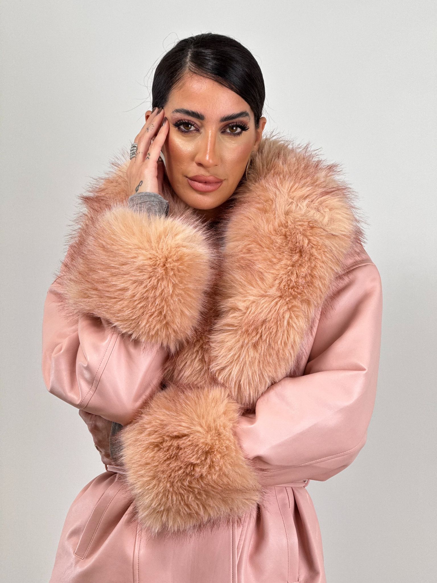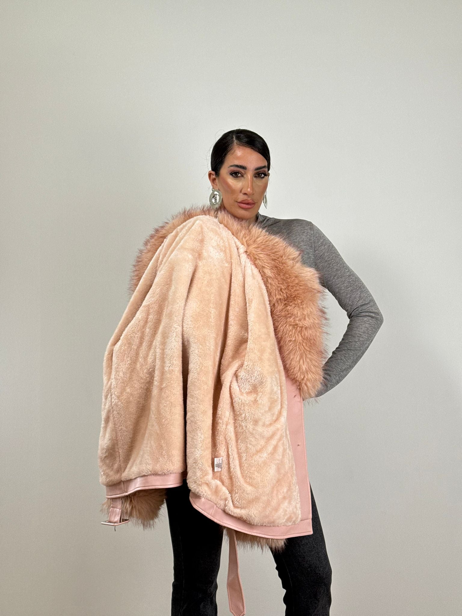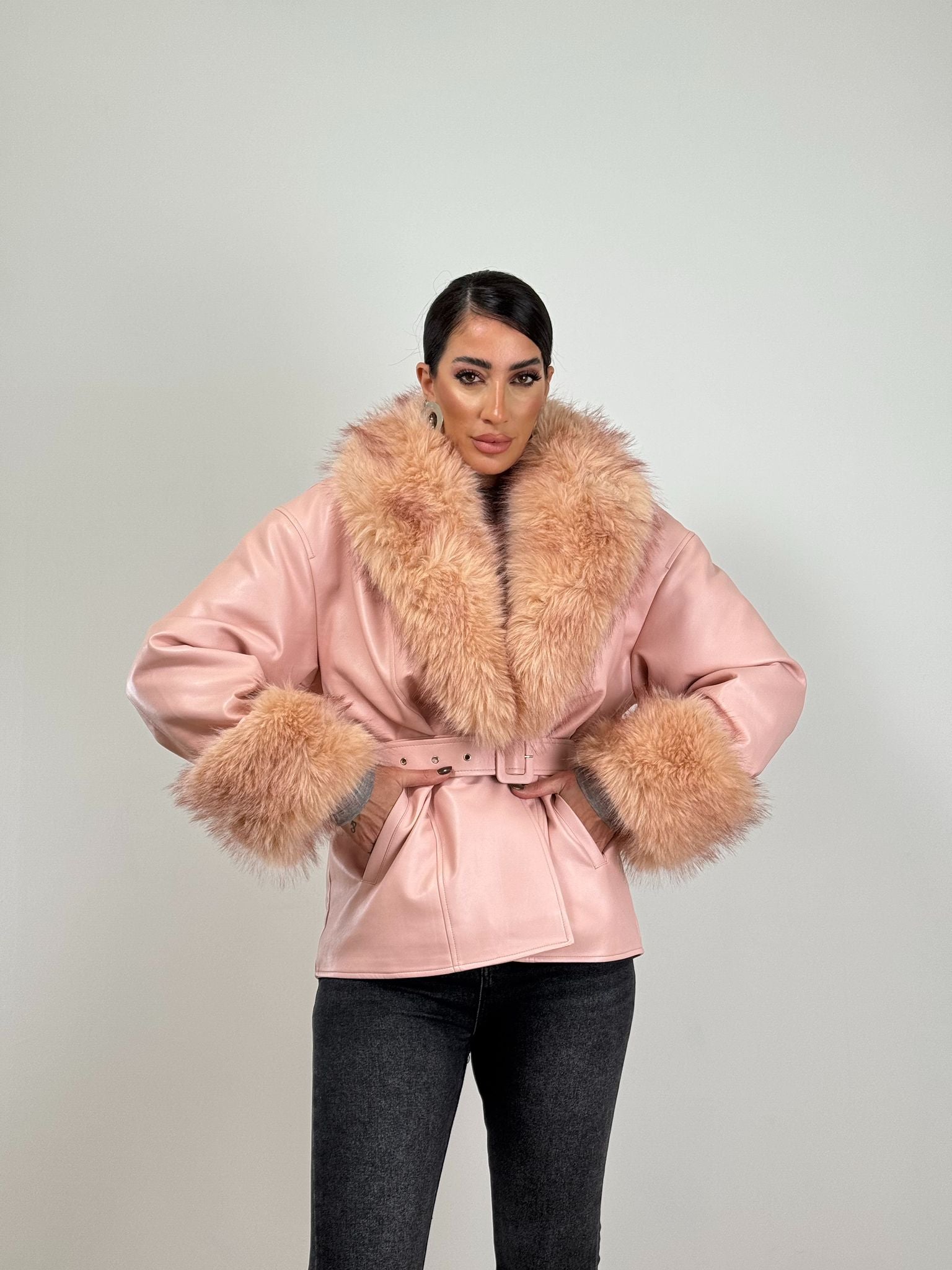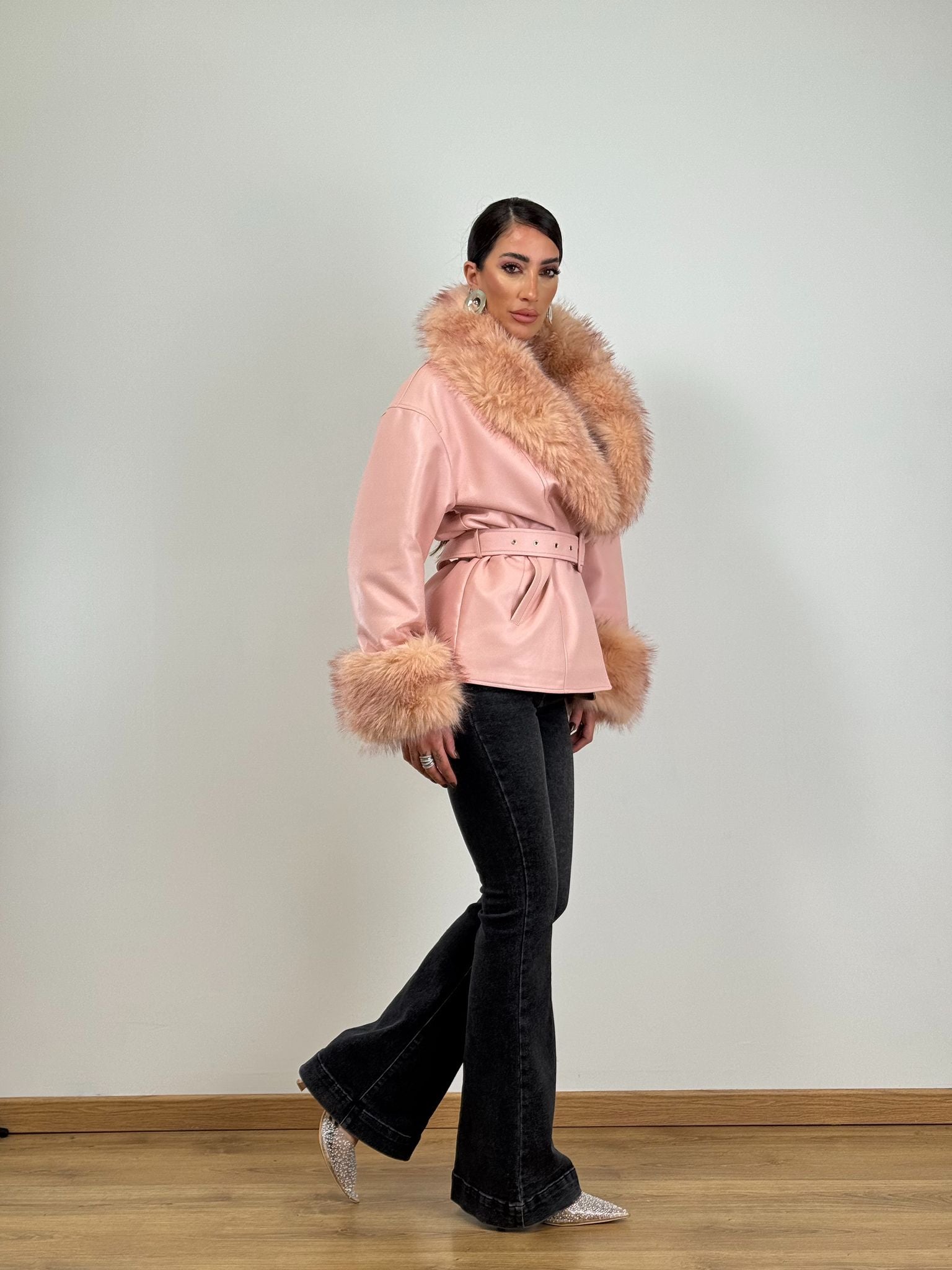 Giacca ecopelle rosa con collo e polsini in pelliccia removibili .. oversize taglia unica con cintura e tasche