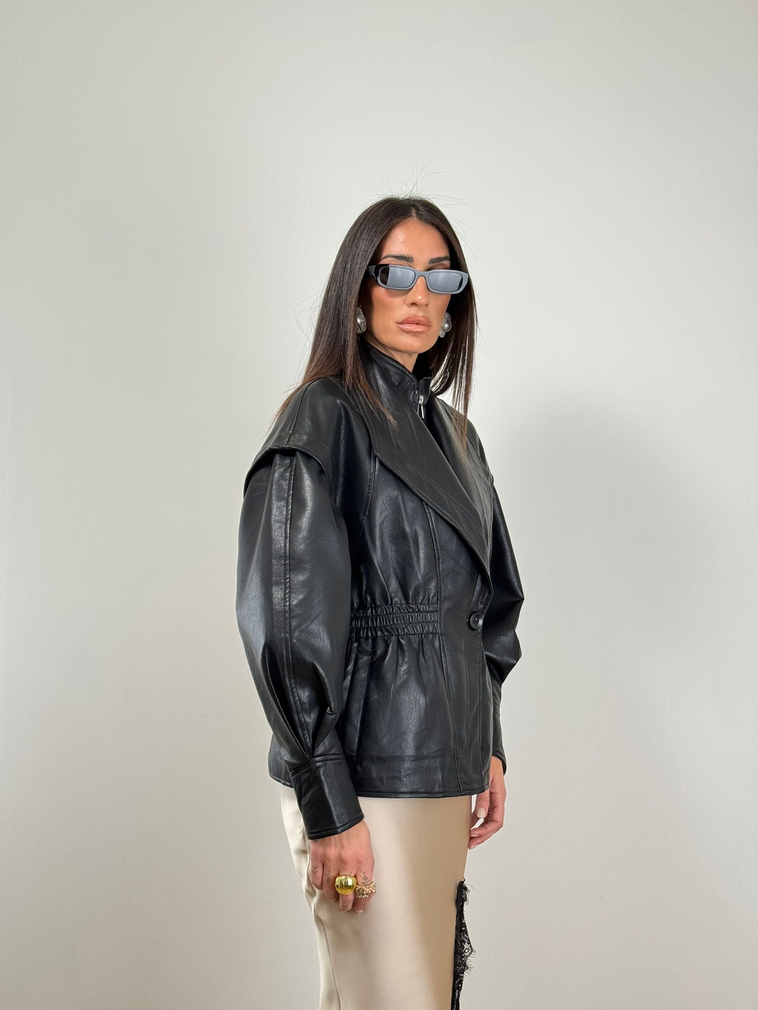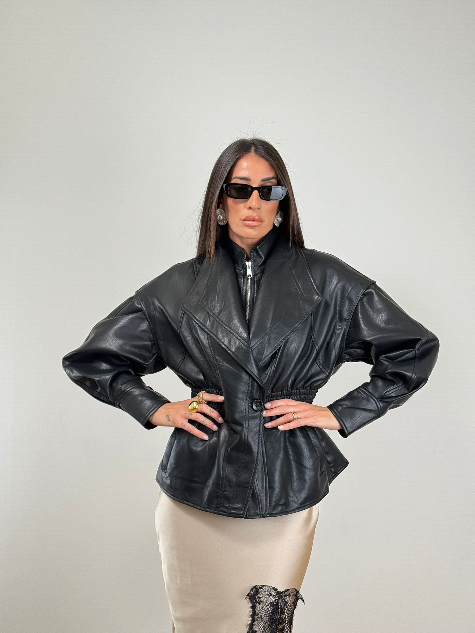 Giubbino ecopelle nero elastico in vita zip e maxi rever taglia unica