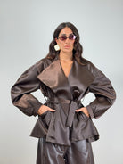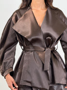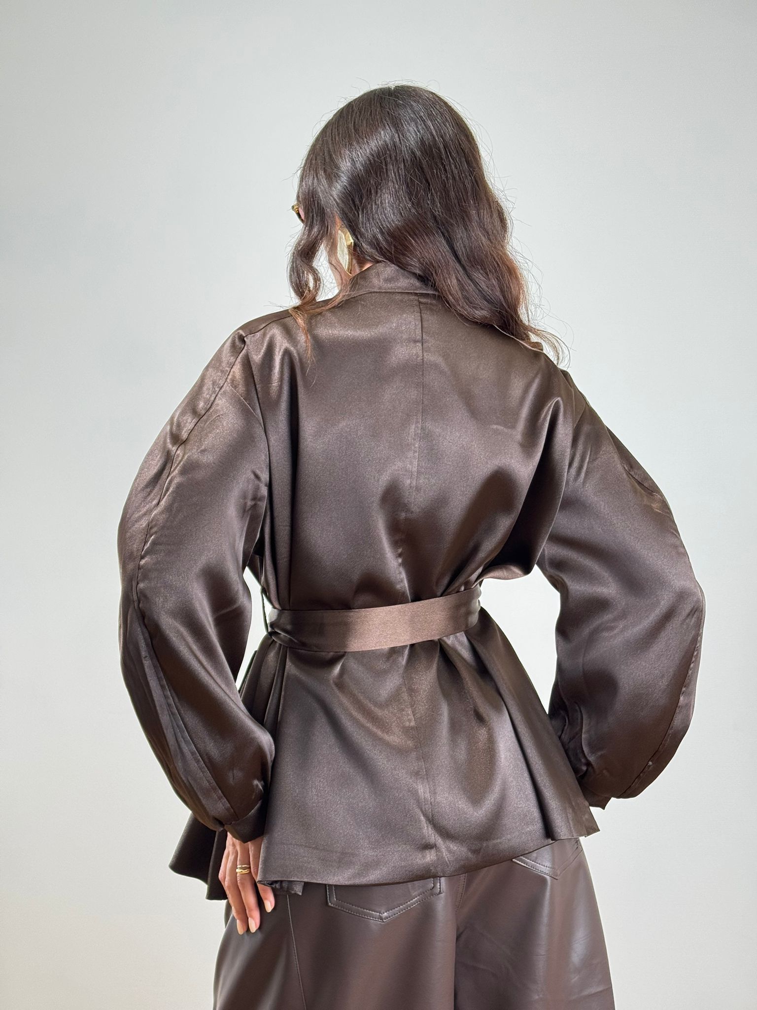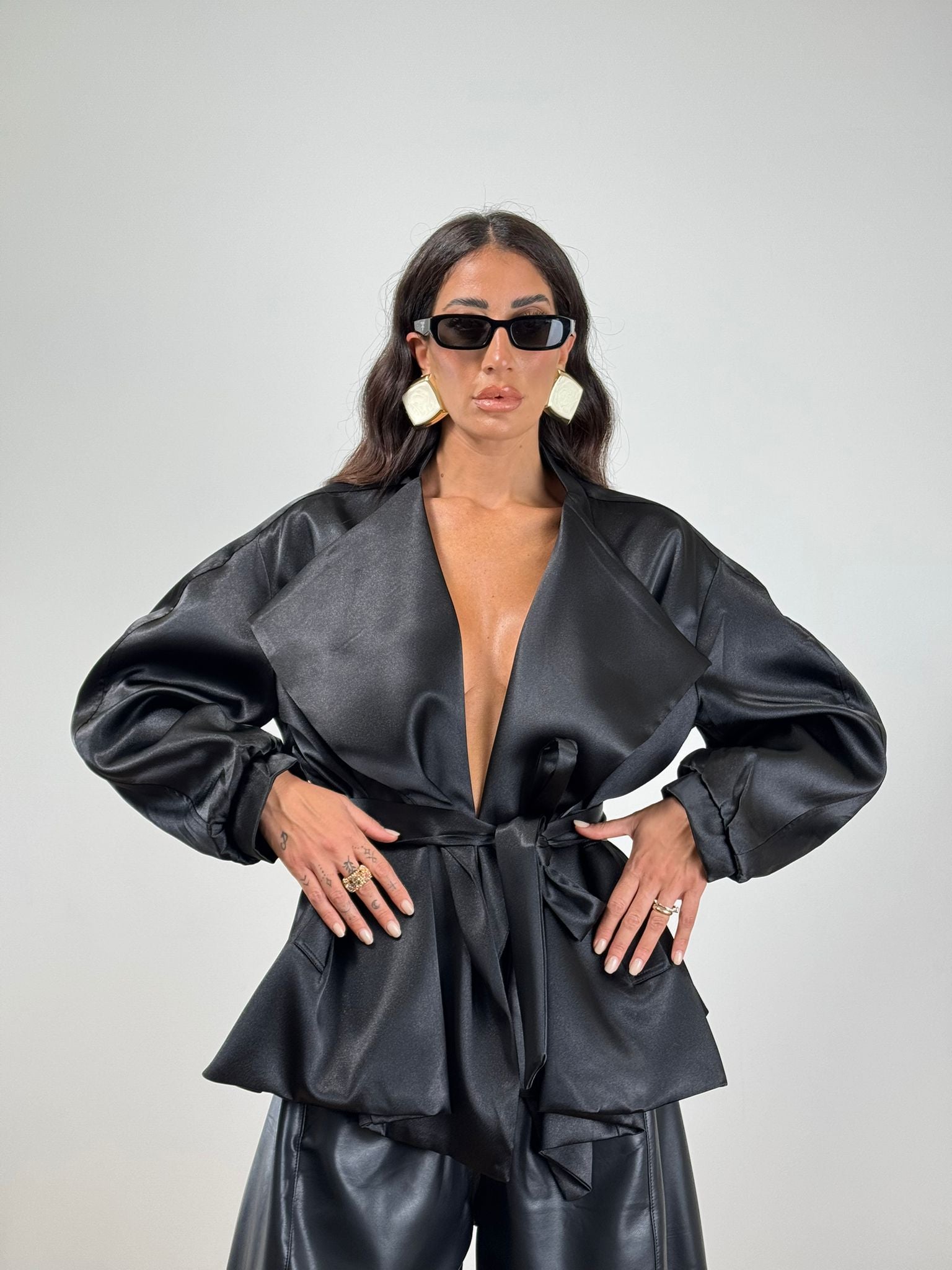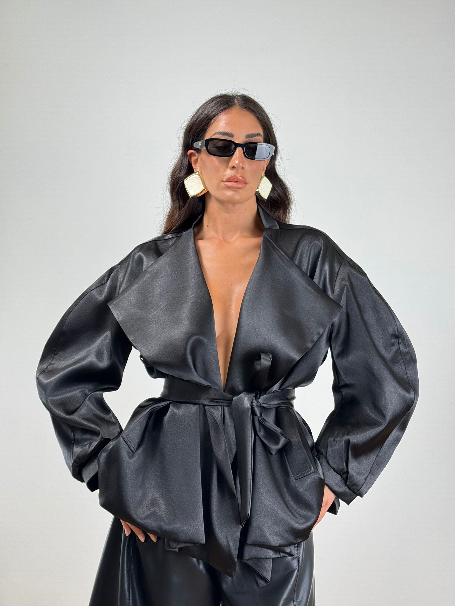 Maxi giubbino in raso oversize effetto raso taglia unica con fusciacca , maxi rever tasche e manica a palloncino