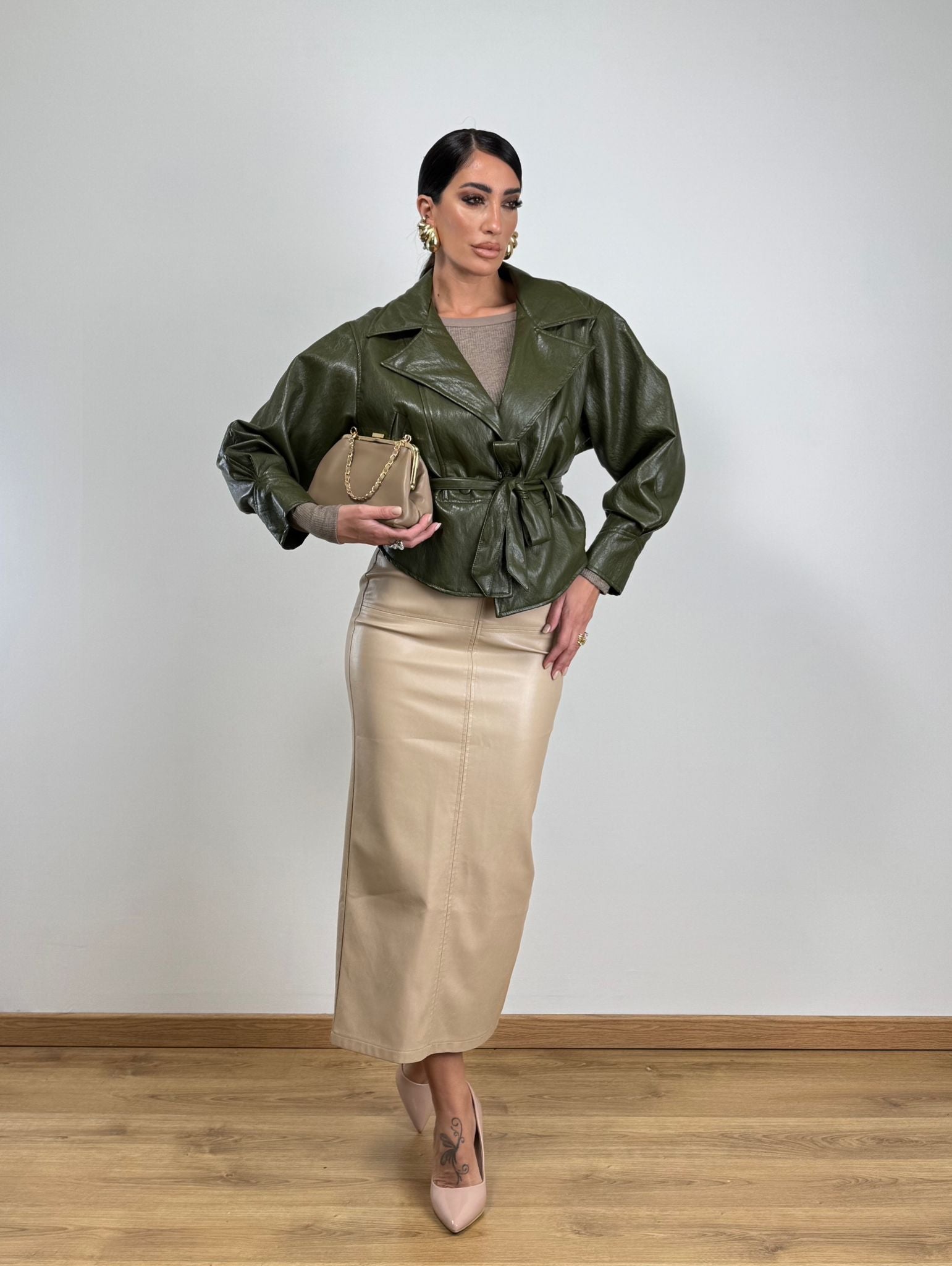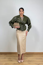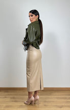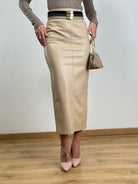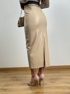 Gonna longuette in ecopelle elasticizzata con spacco sul retro vita alta a taglie top quality