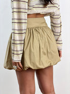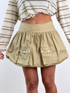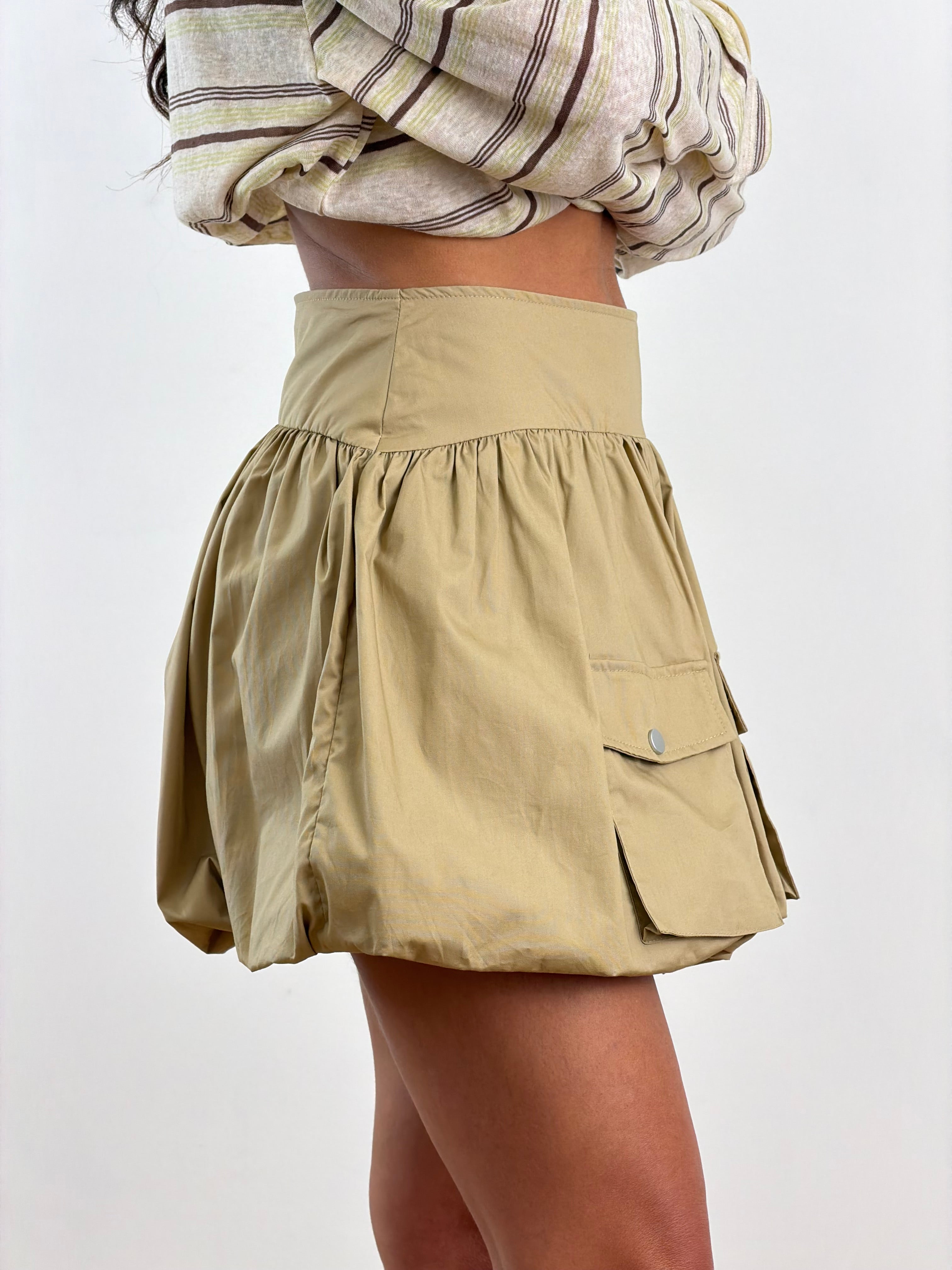Minigonna a palloncino.Colore: Beige sabbia / Corda.Fascia in vita liscia con arricciatura sottostante per creare volume.Due maxi tasche frontali a toppa con patta.Bottoni a pressione metallici a contrasto. Questo capo veste più grande rispetto alla taglia standard.