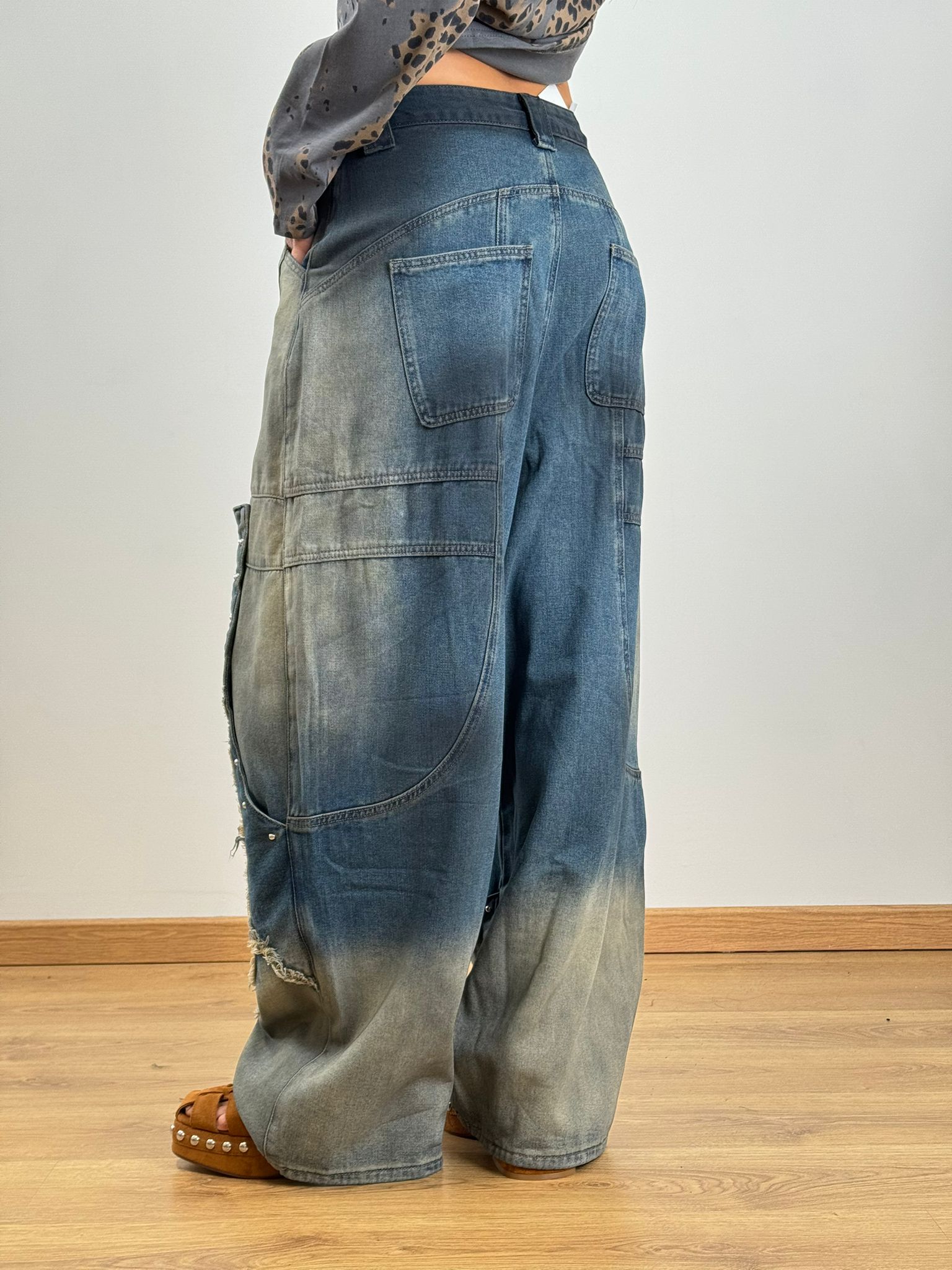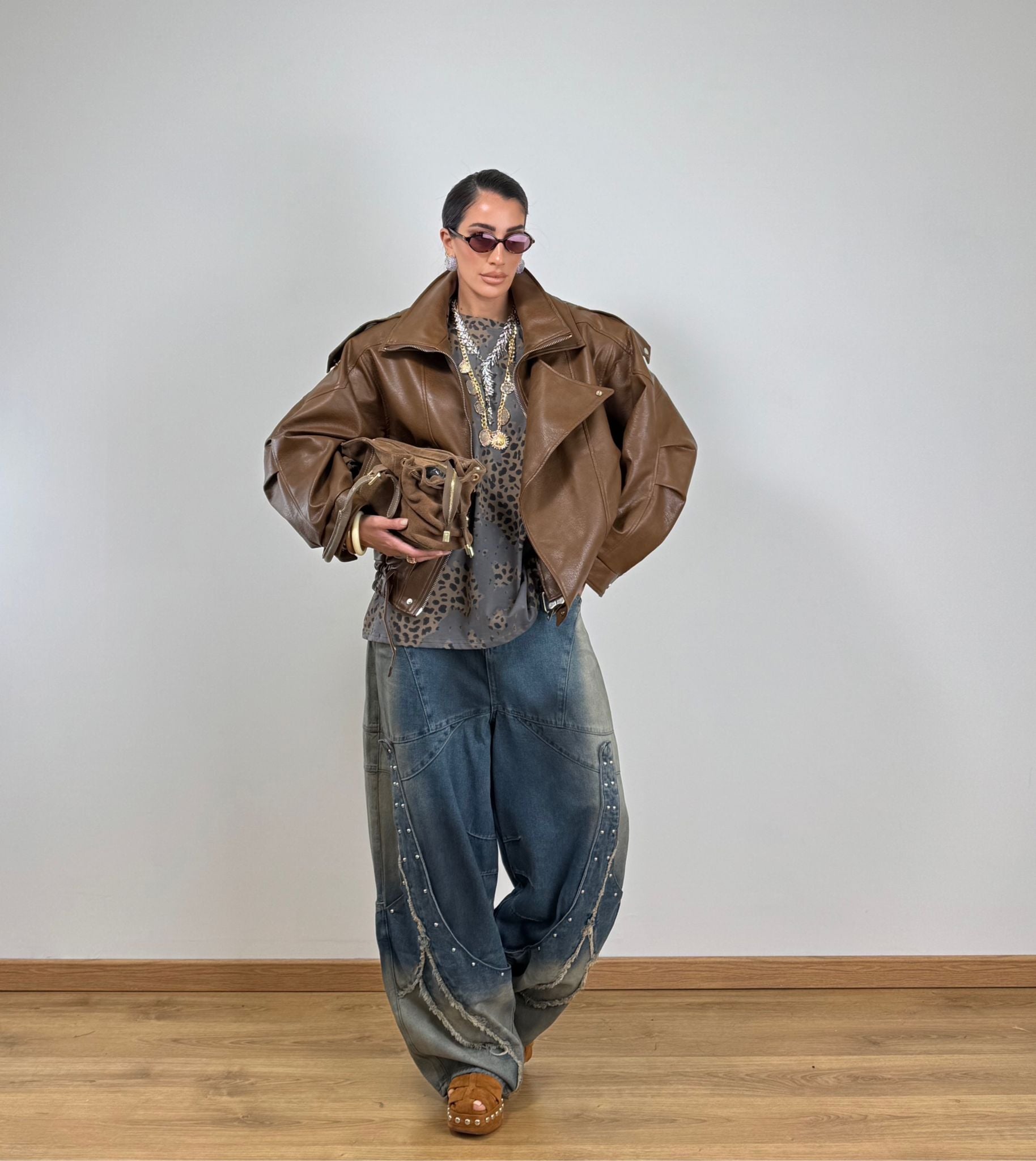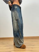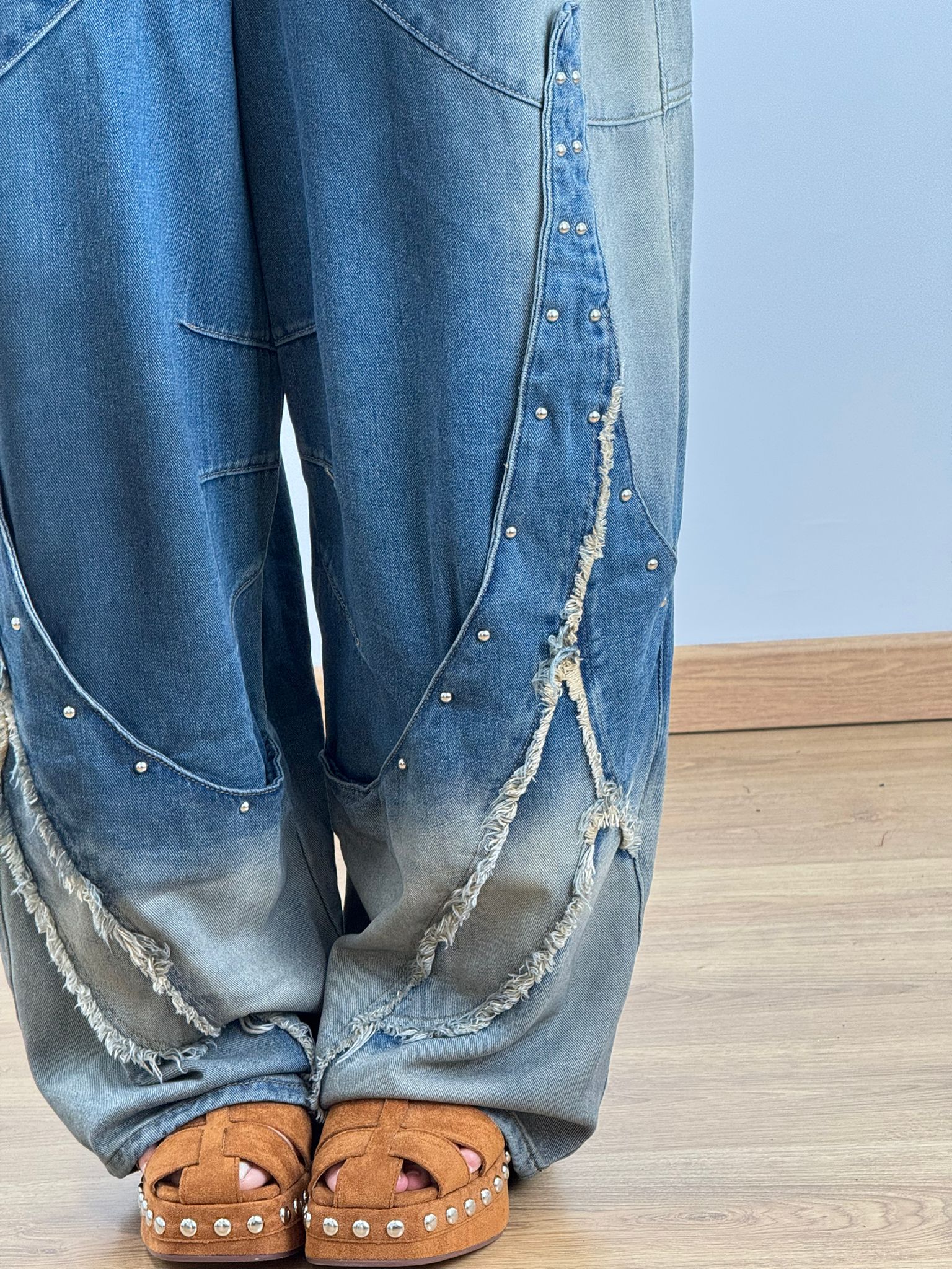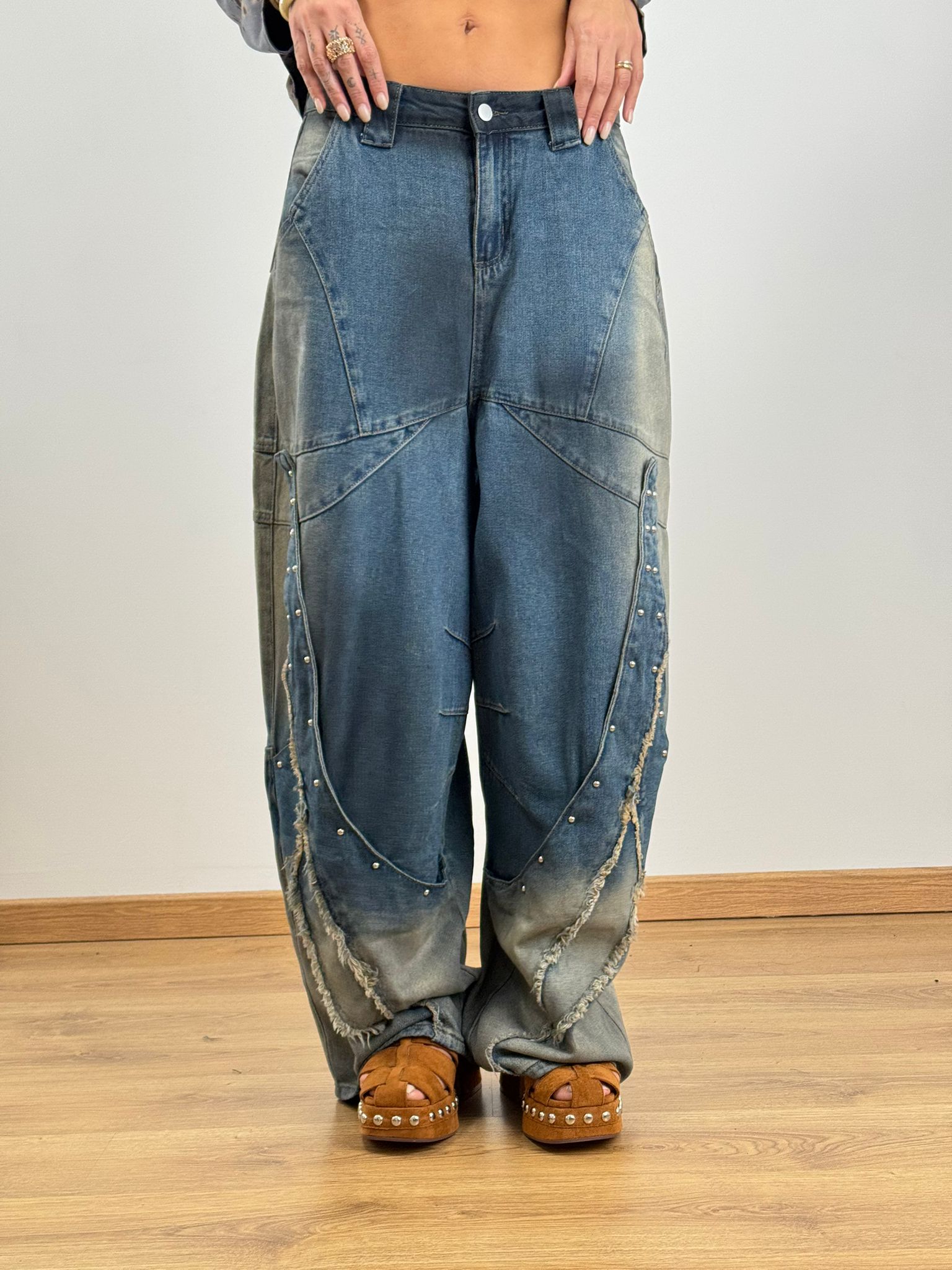 Jeans sabbiato gamba larga sfrangiato con borchie