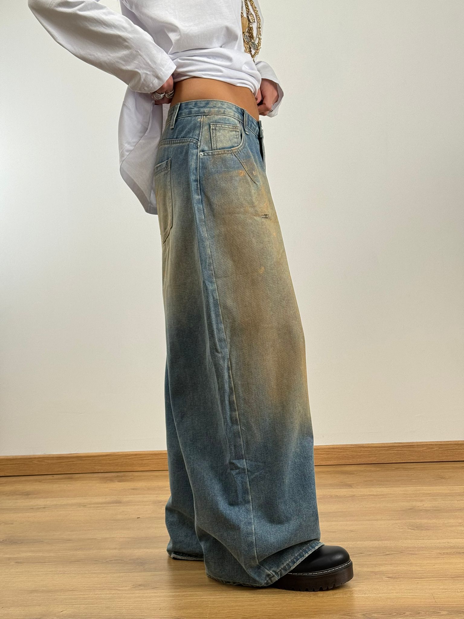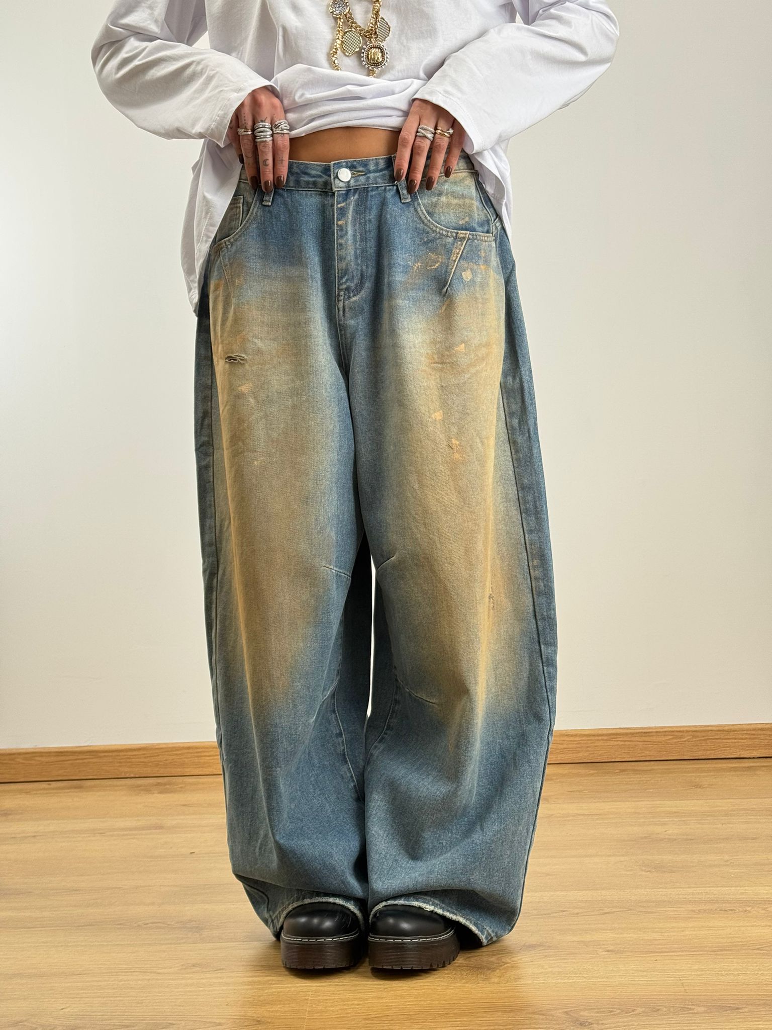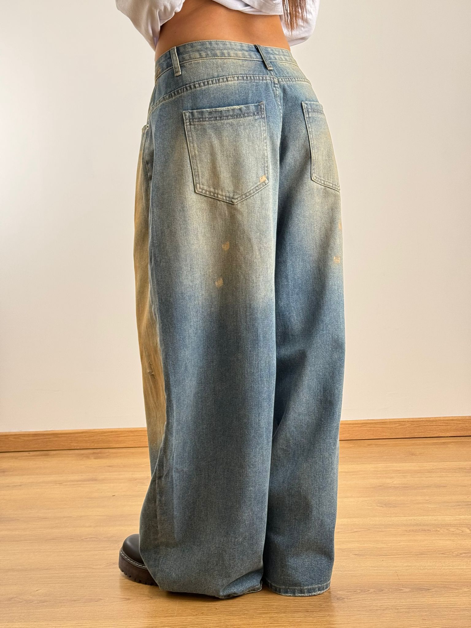 Jeans loose gamba larga scoloritura sul davanti effetto usurato