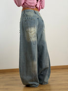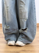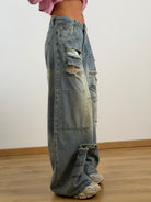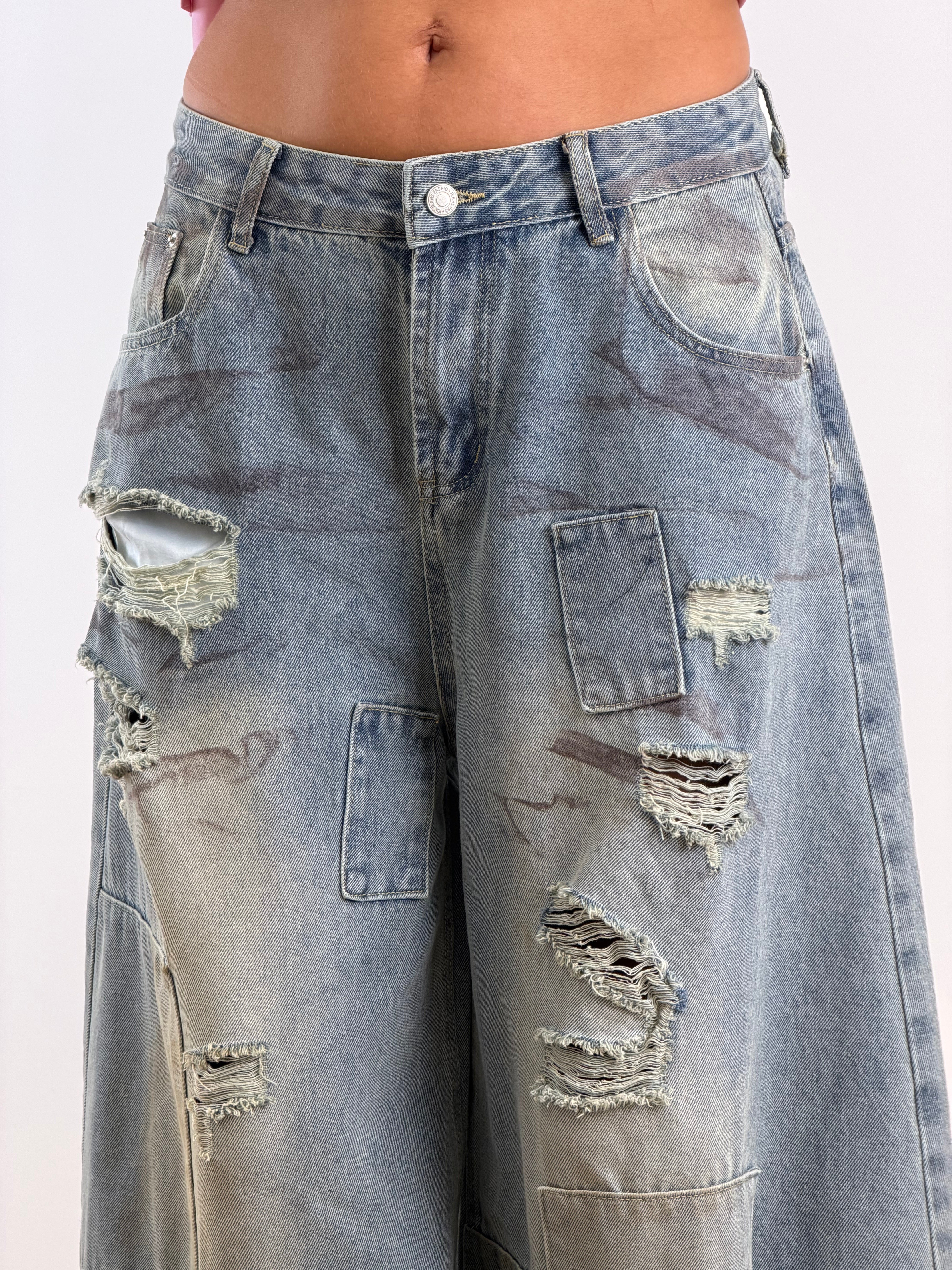 Jeans a gamba larga (Wide-Leg / Baggy) Denim azzurro chiaro.Strappi orizzontali profondi su entrambe le gambe.Sfilacciature a vista per un effetto "vissuto".Applicazione di patch in denim tono su tono cucite con bordi a rilievo. Stampe grafiche sfumate a contrasto (grigio antracite) che simulano pennellate o ombreggiature lungo tutta la gamba.