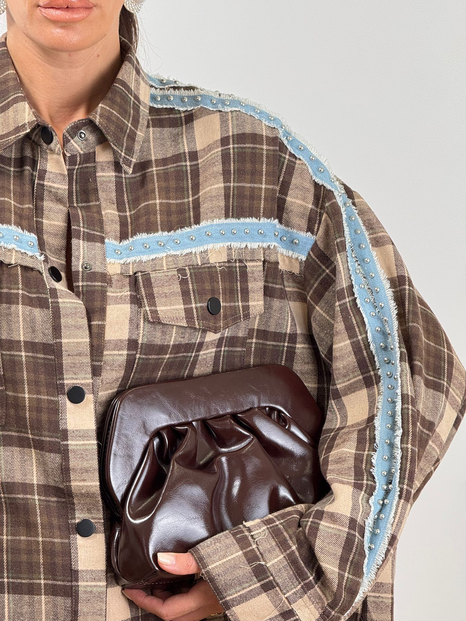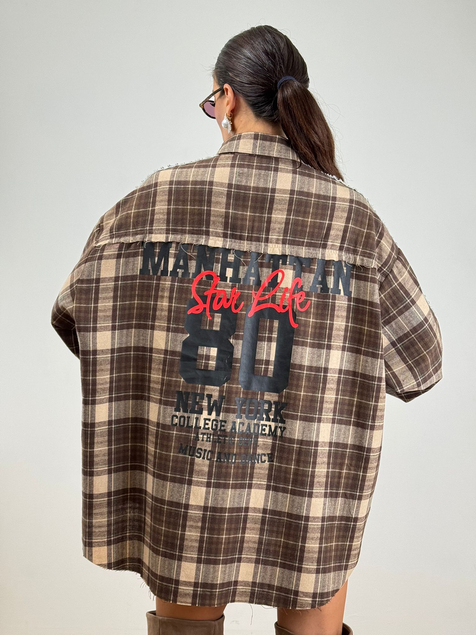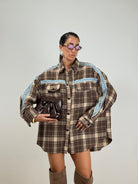 maxi camicia abitino a quadri con scritta sul retro inserti in denim e perline