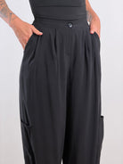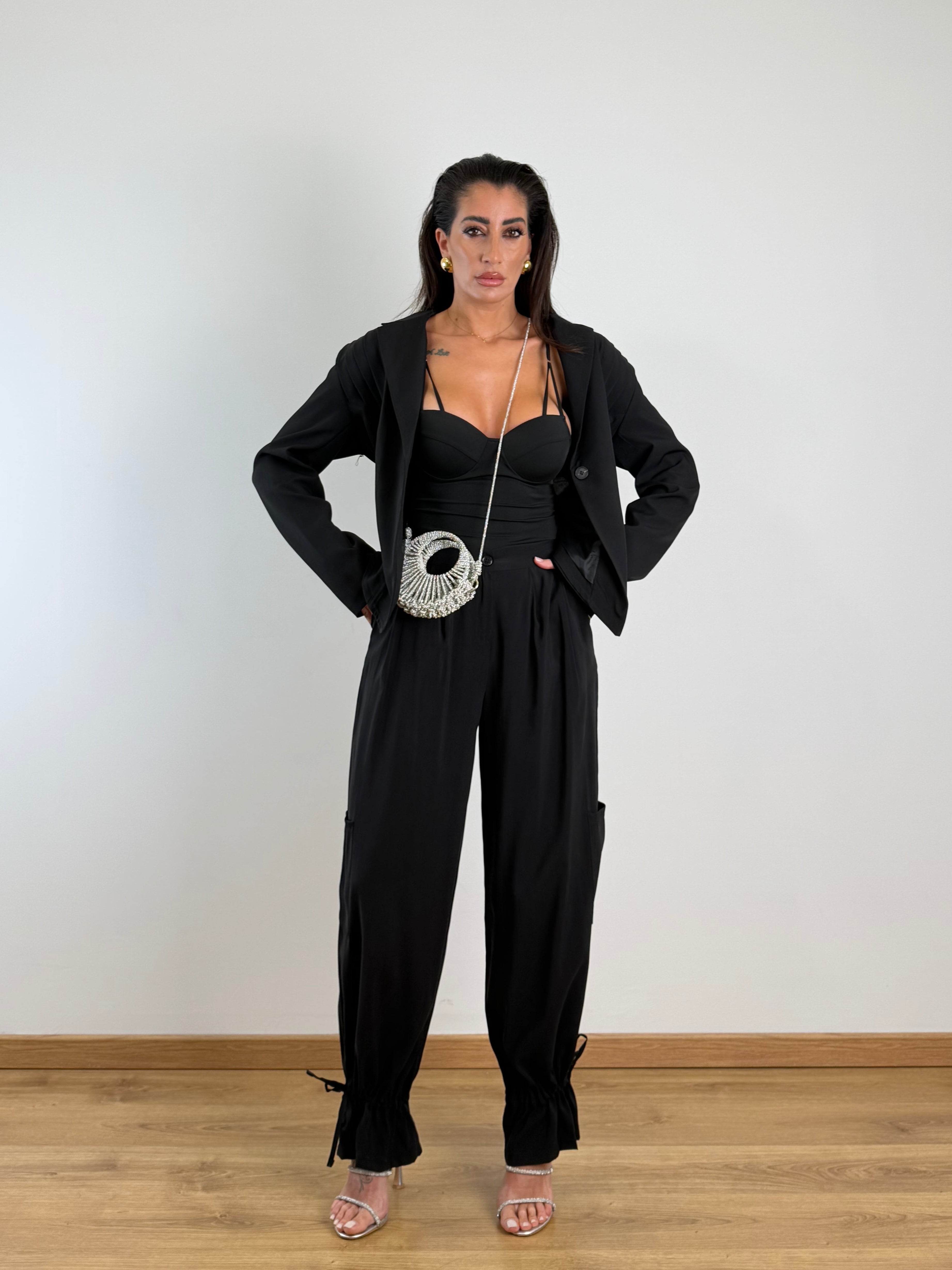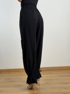 Pantalone con gamba ampia, dettaglio arricciato con cordoncino regolabile sul fondo gamba. Chiusura bottone e zip ed elastico sul retro. Taglia unica