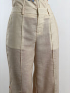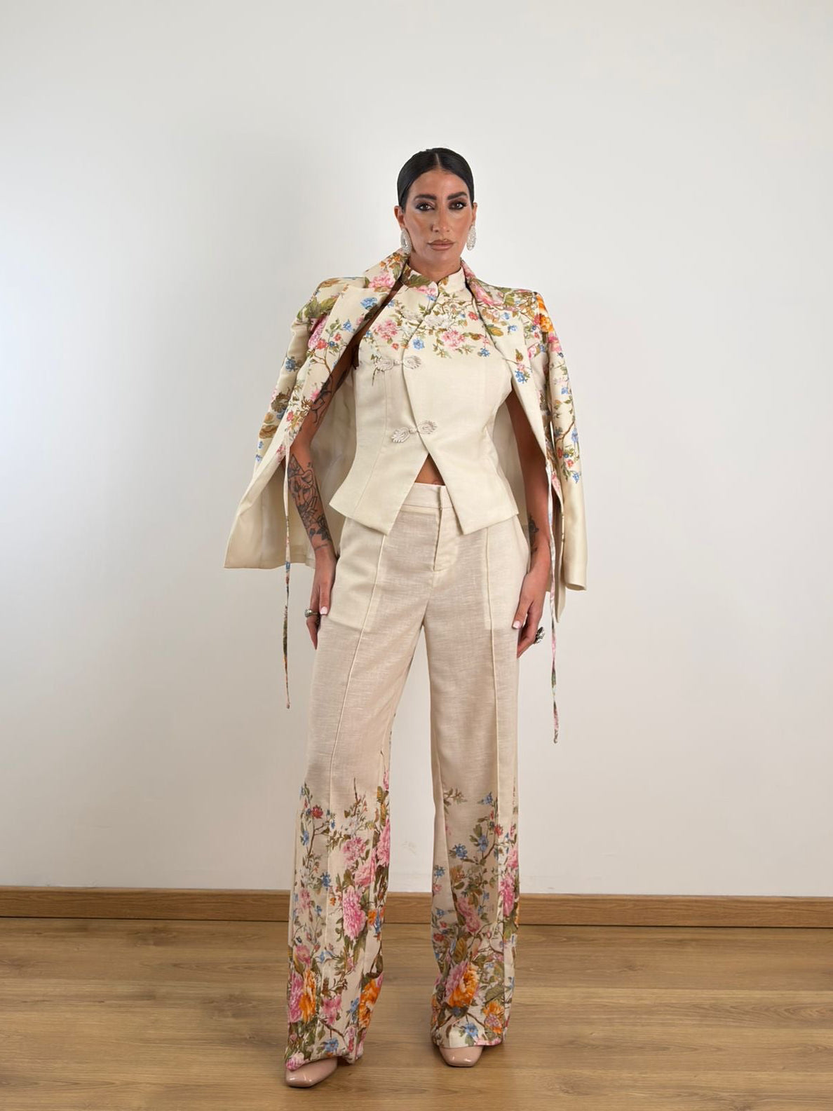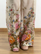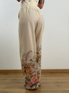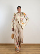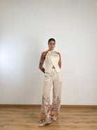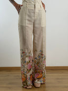 Pantalone a gamba larga con taglio sartoriale.Maxi stampa floreale multicolore (toni arancio, rosa, azzurro e giallo) posizionata strategicamente sul fondo gamba.Vita alta con passanti per cintura.Chiusura frontale a scomparsa con zip e gancio.Tasche laterali a filo.Pince frontali per una caduta fluida del tessuto.