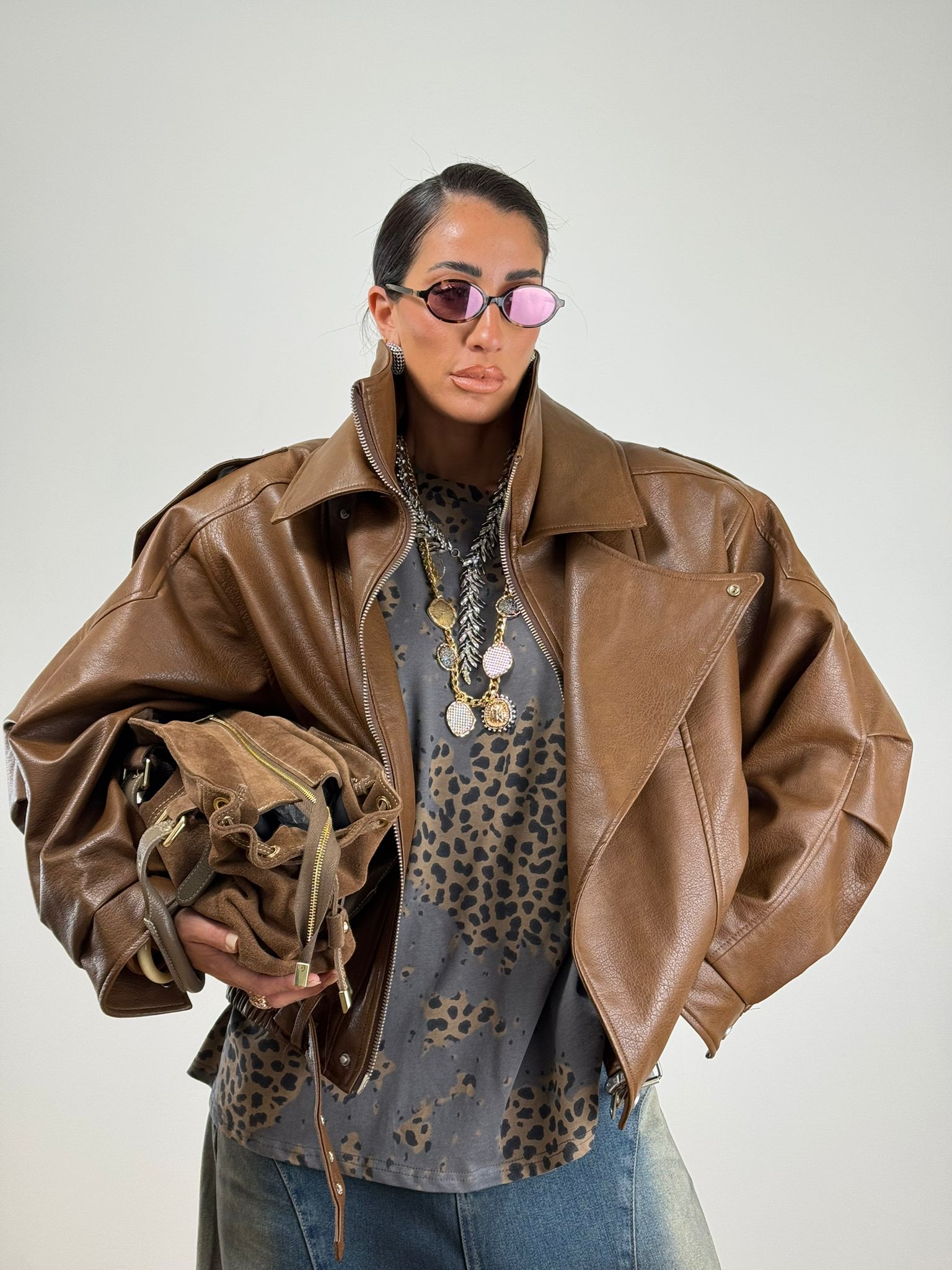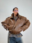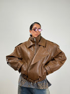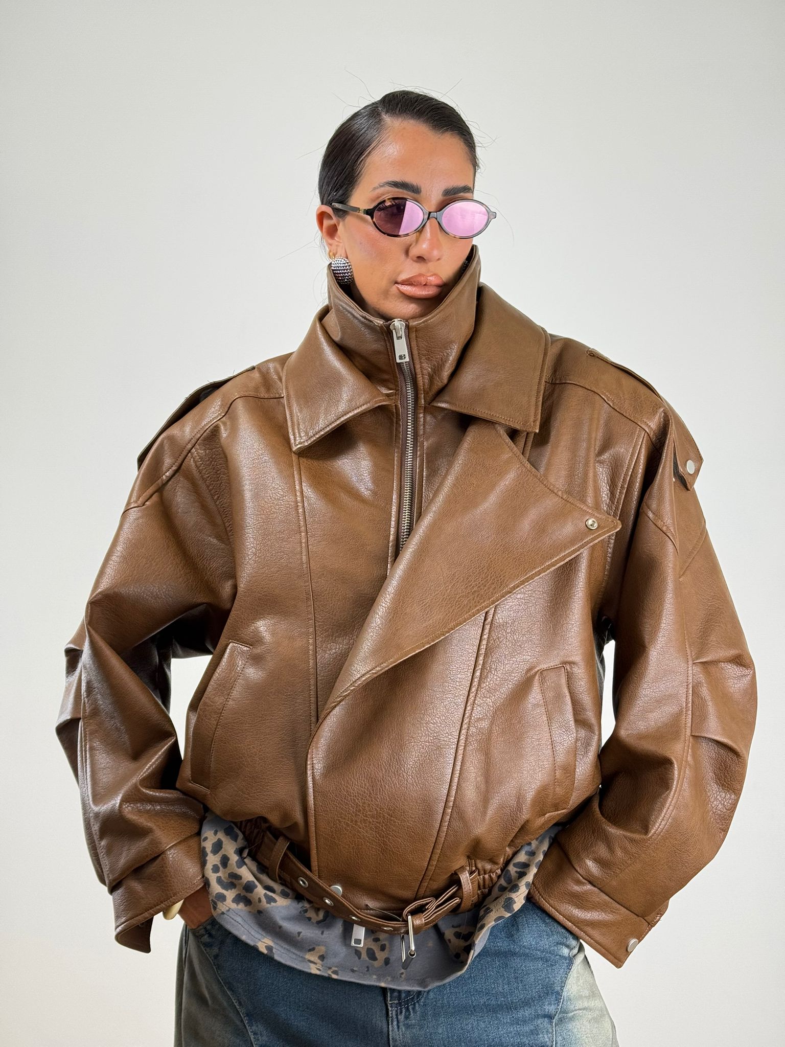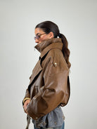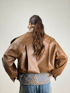 Chiodo oversize marrone con patta sul davanti doppio colletto e cintura