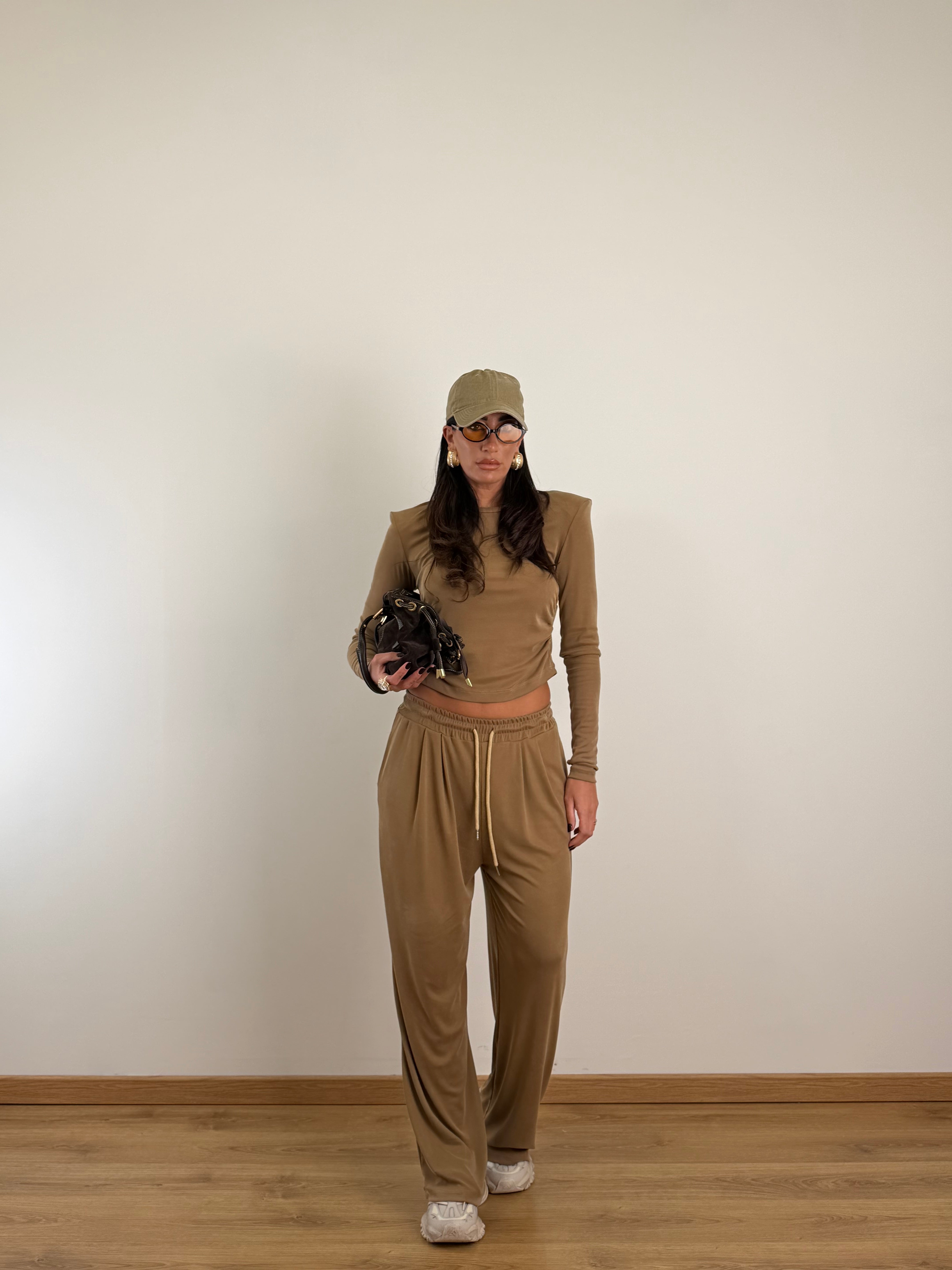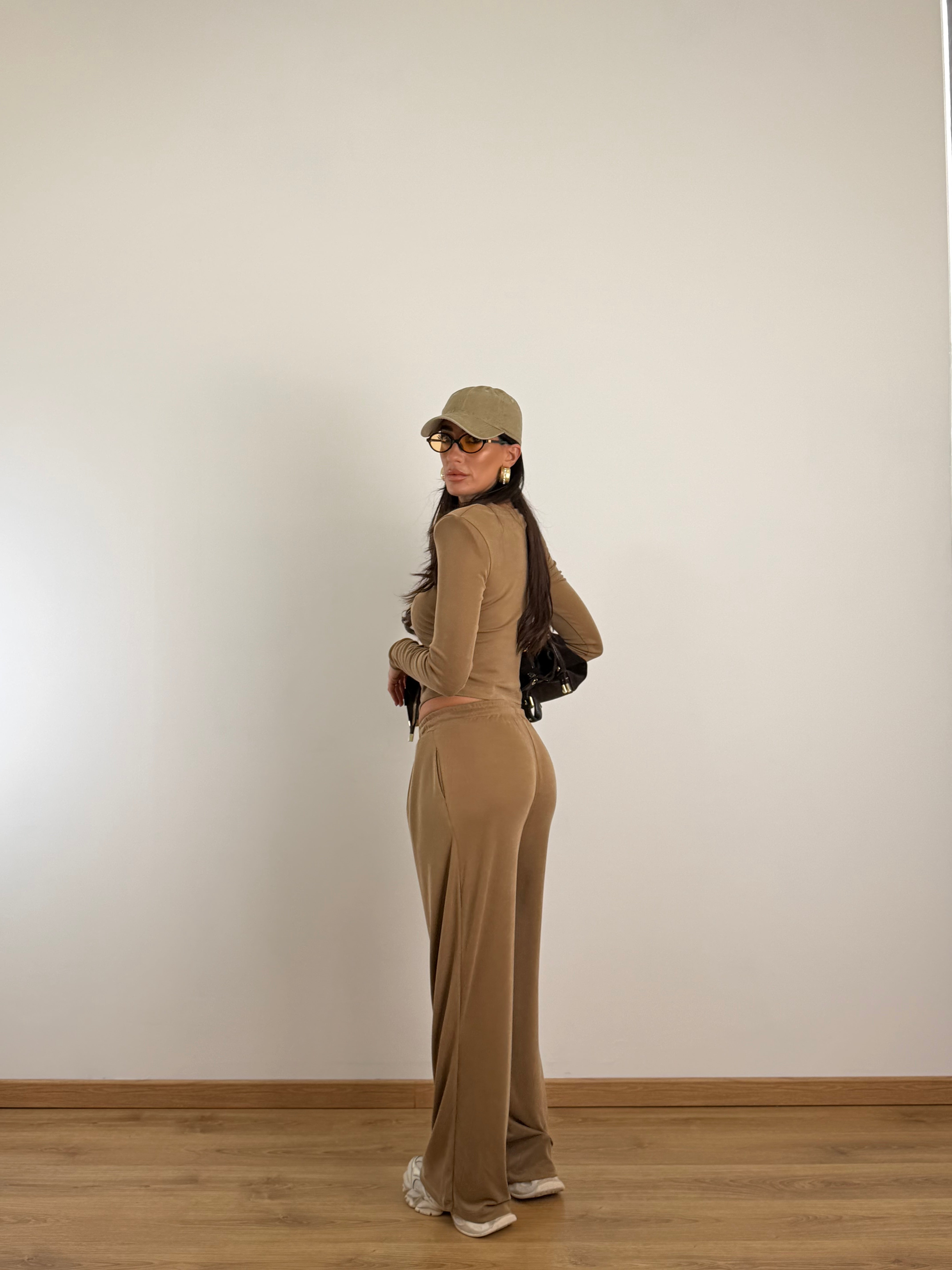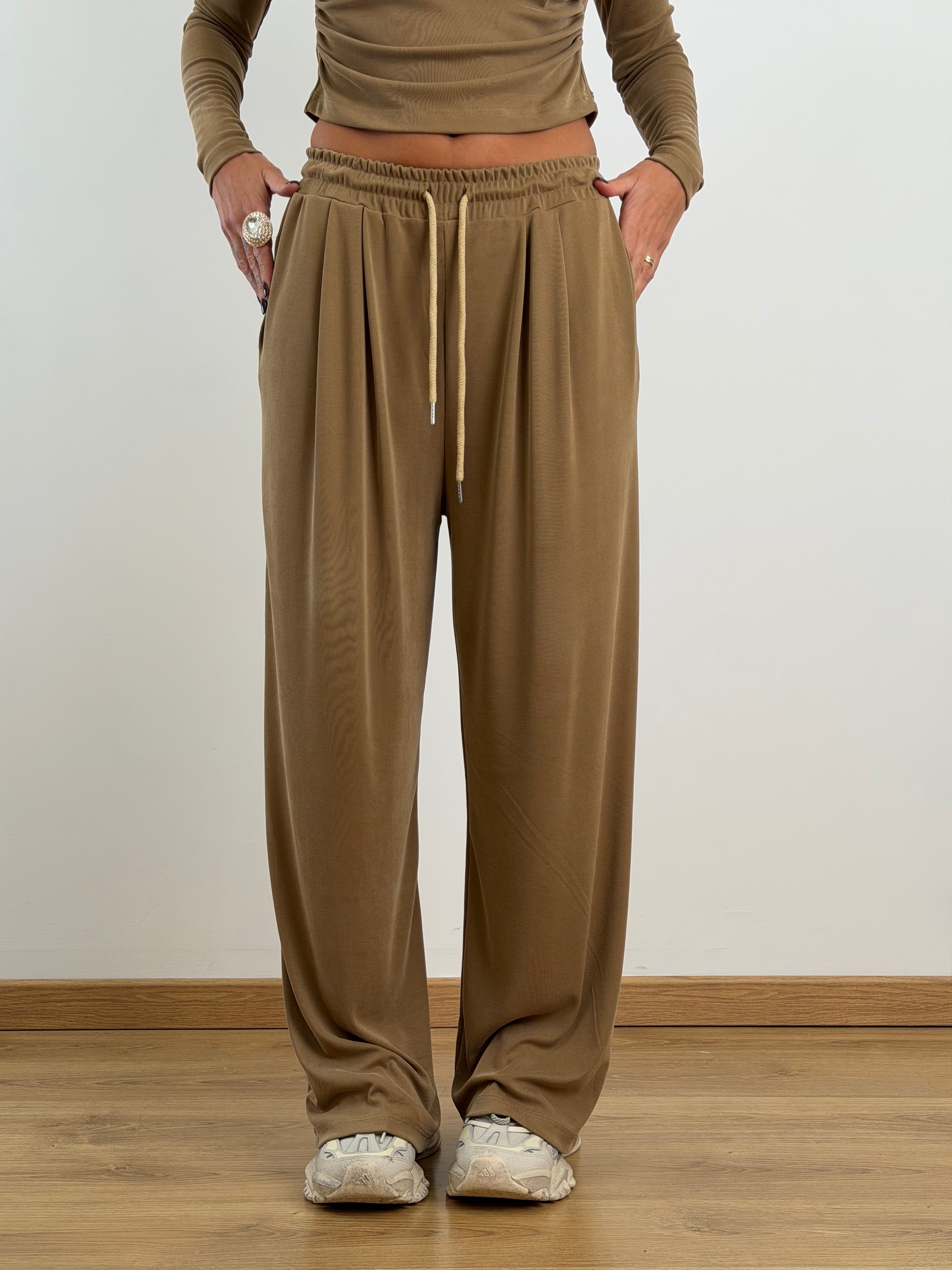 Pantaloncini color caramello, con patta frontale e tasconi chiusura con anello e laccetto. Chiusura laterale con zip.