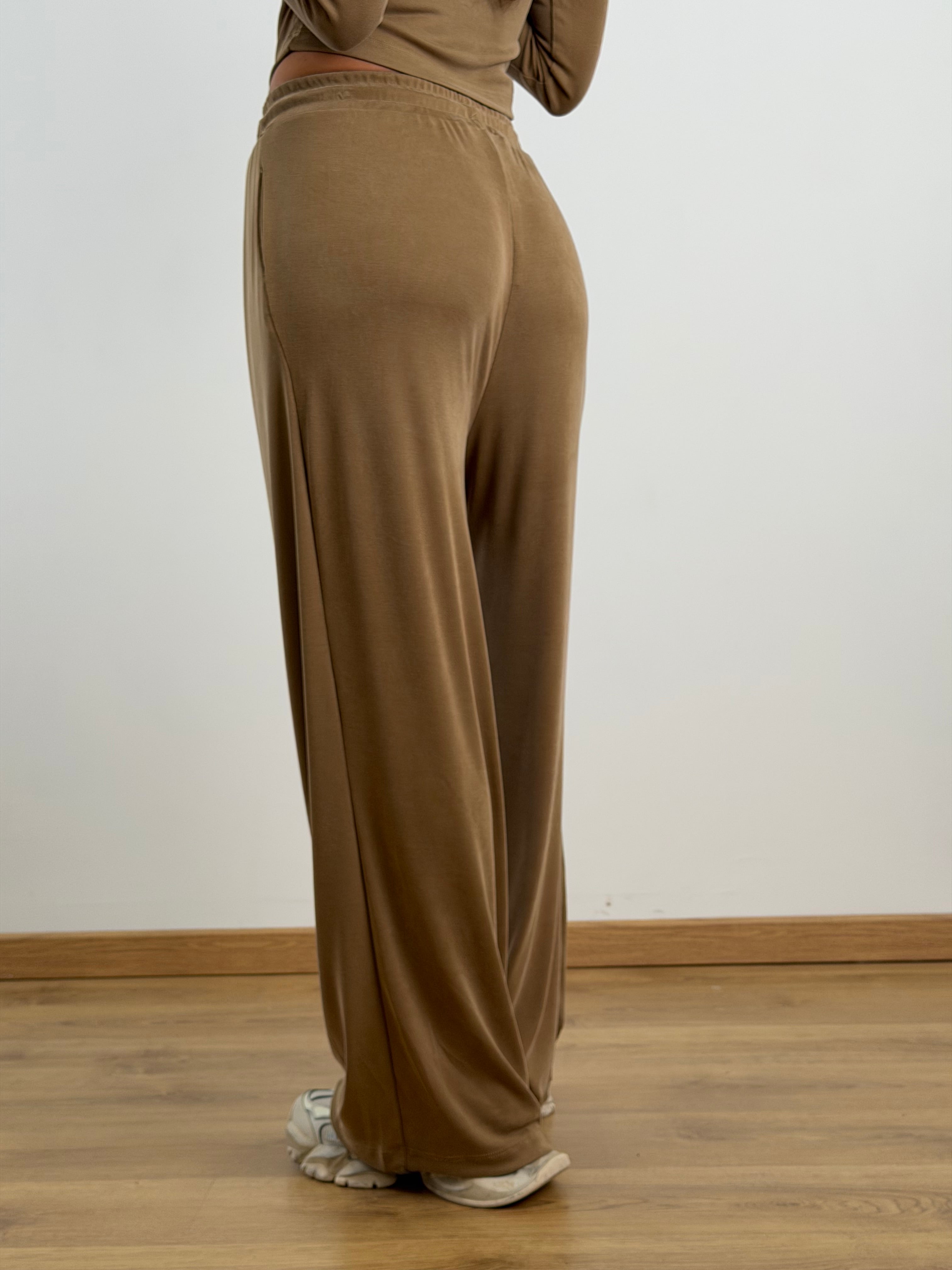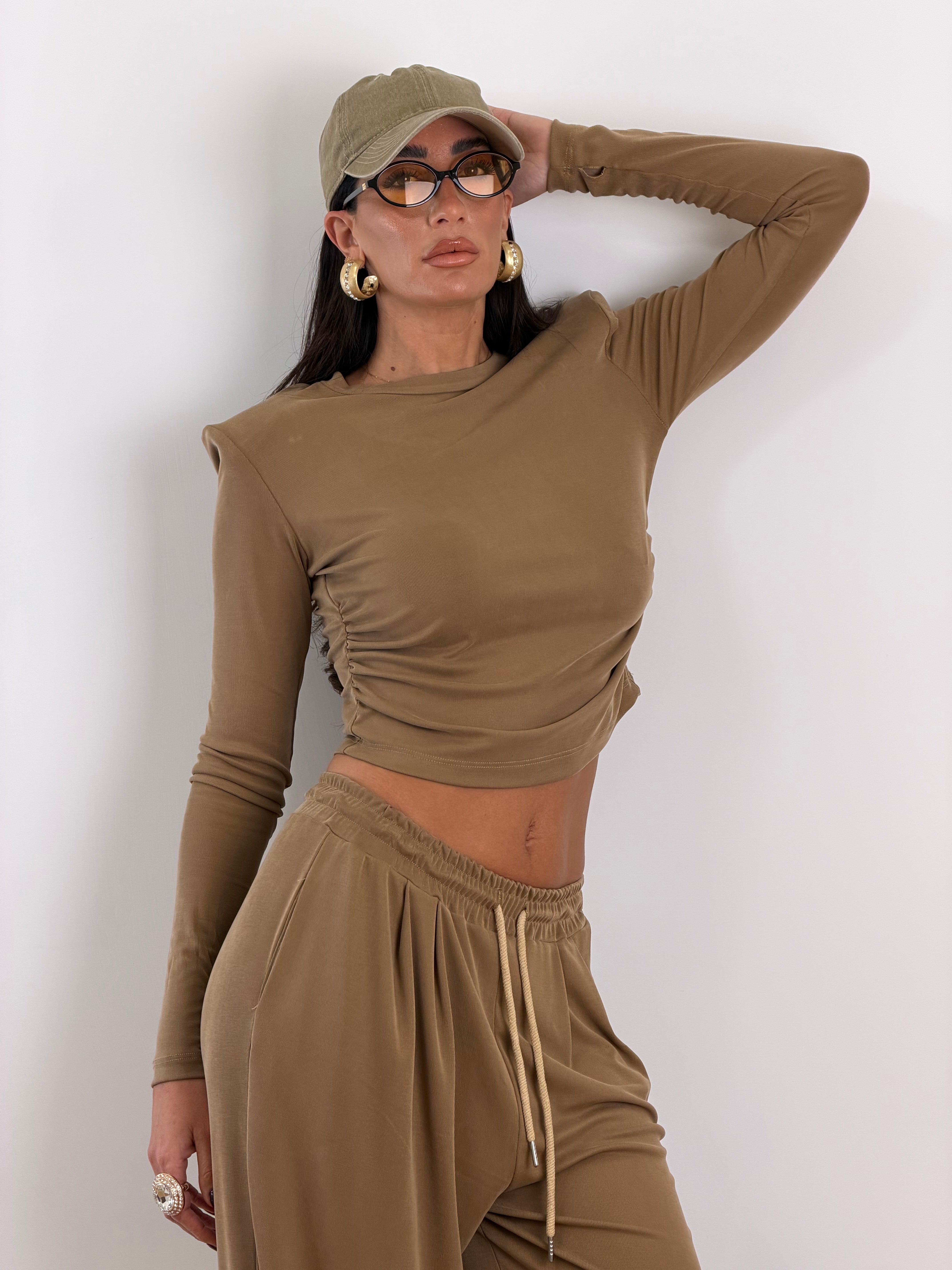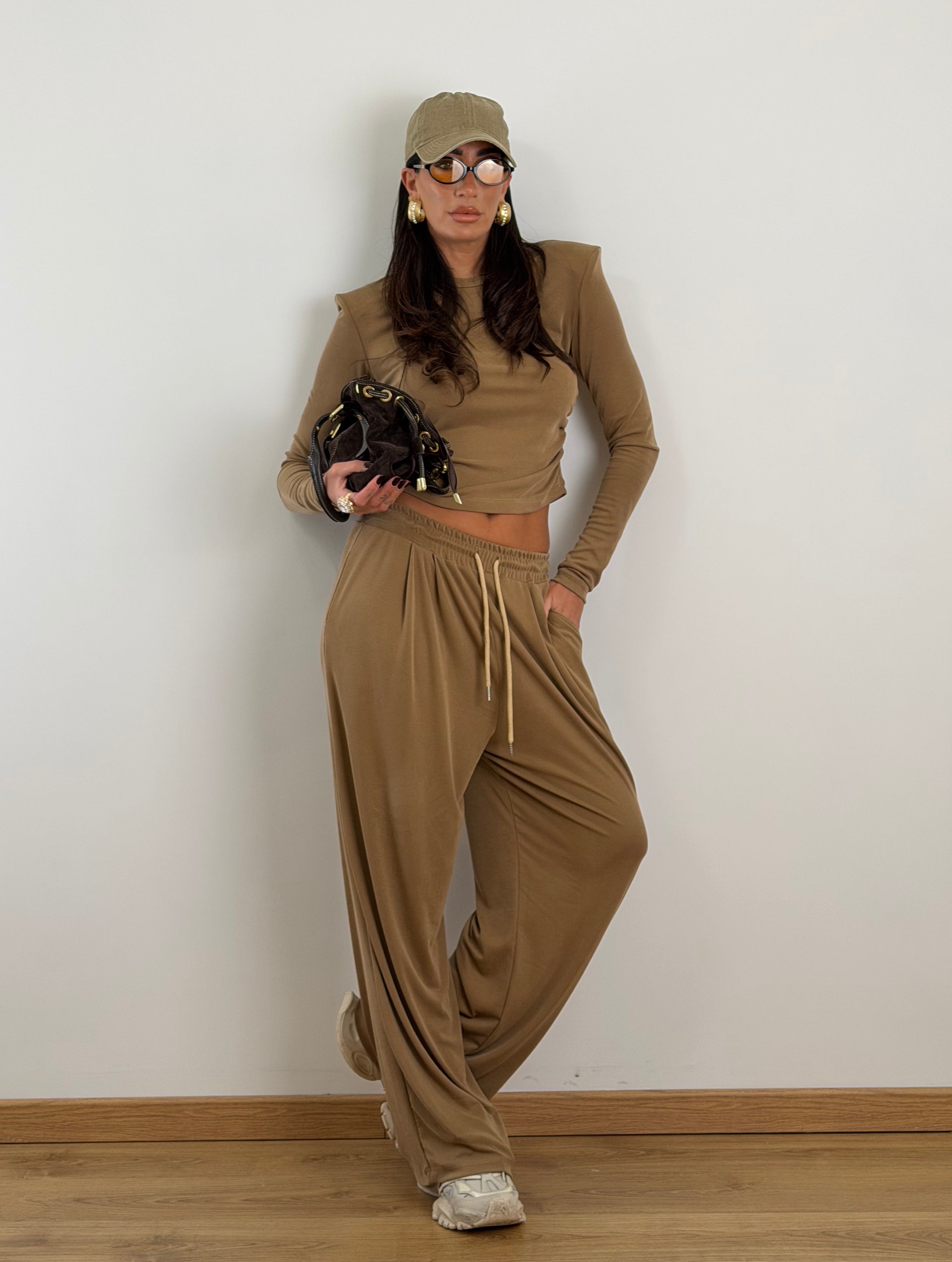Pantaloncini color caramello, con patta frontale e tasconi chiusura con anello e laccetto. Chiusura laterale con zip.