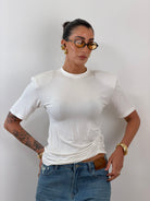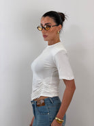 T shirt mezza manica con arricciatura laterale. 95% viscosa 5 % elastene. Taglia unica