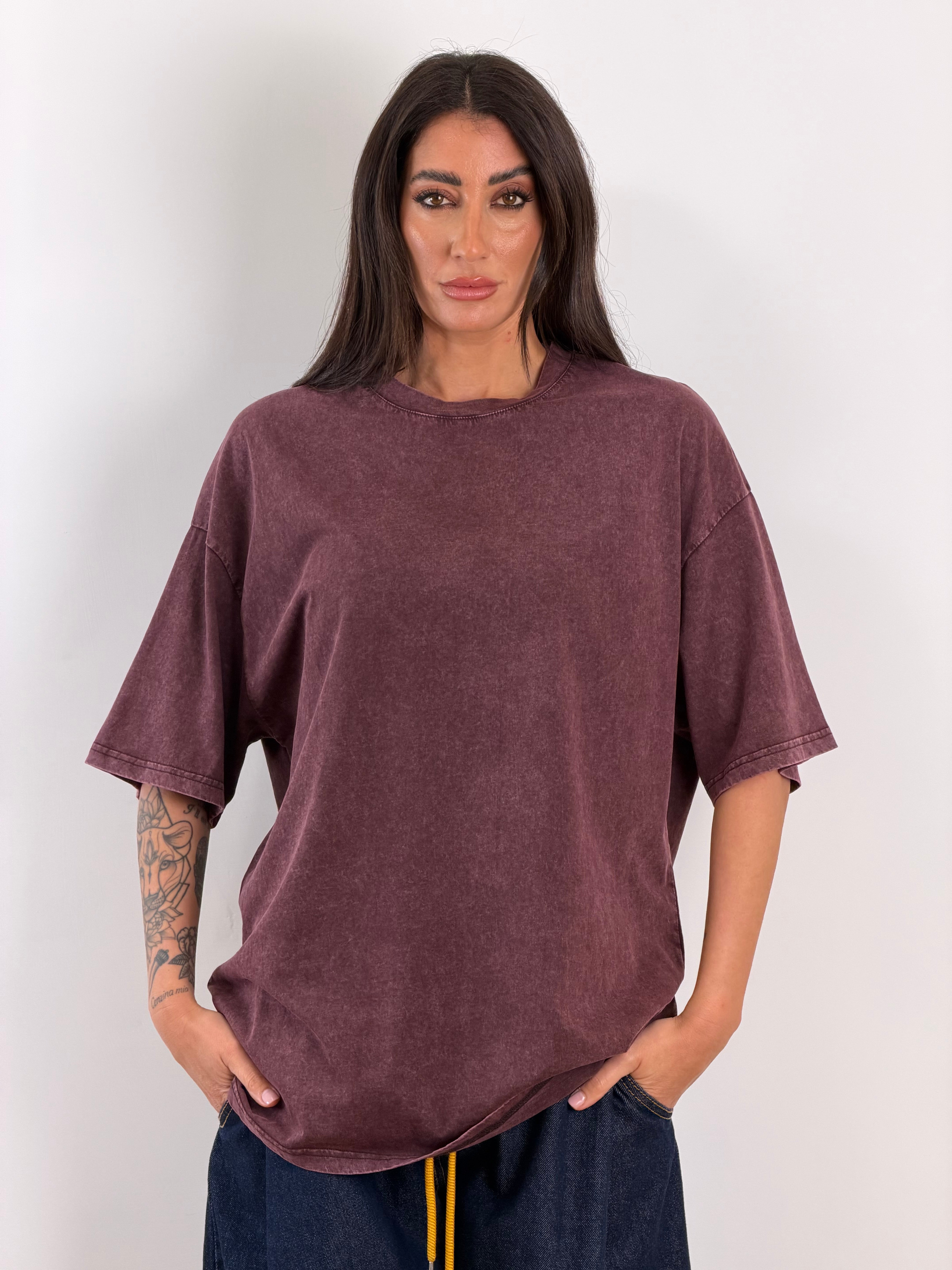 T-shirt a maniche corte.Modello: Oversize, taglio ampio e squadrato.Lavaggio effetto slavato/vintage. Girocollo a costine spesse.Spalla Scesa. 100% cotone. Taglia unica