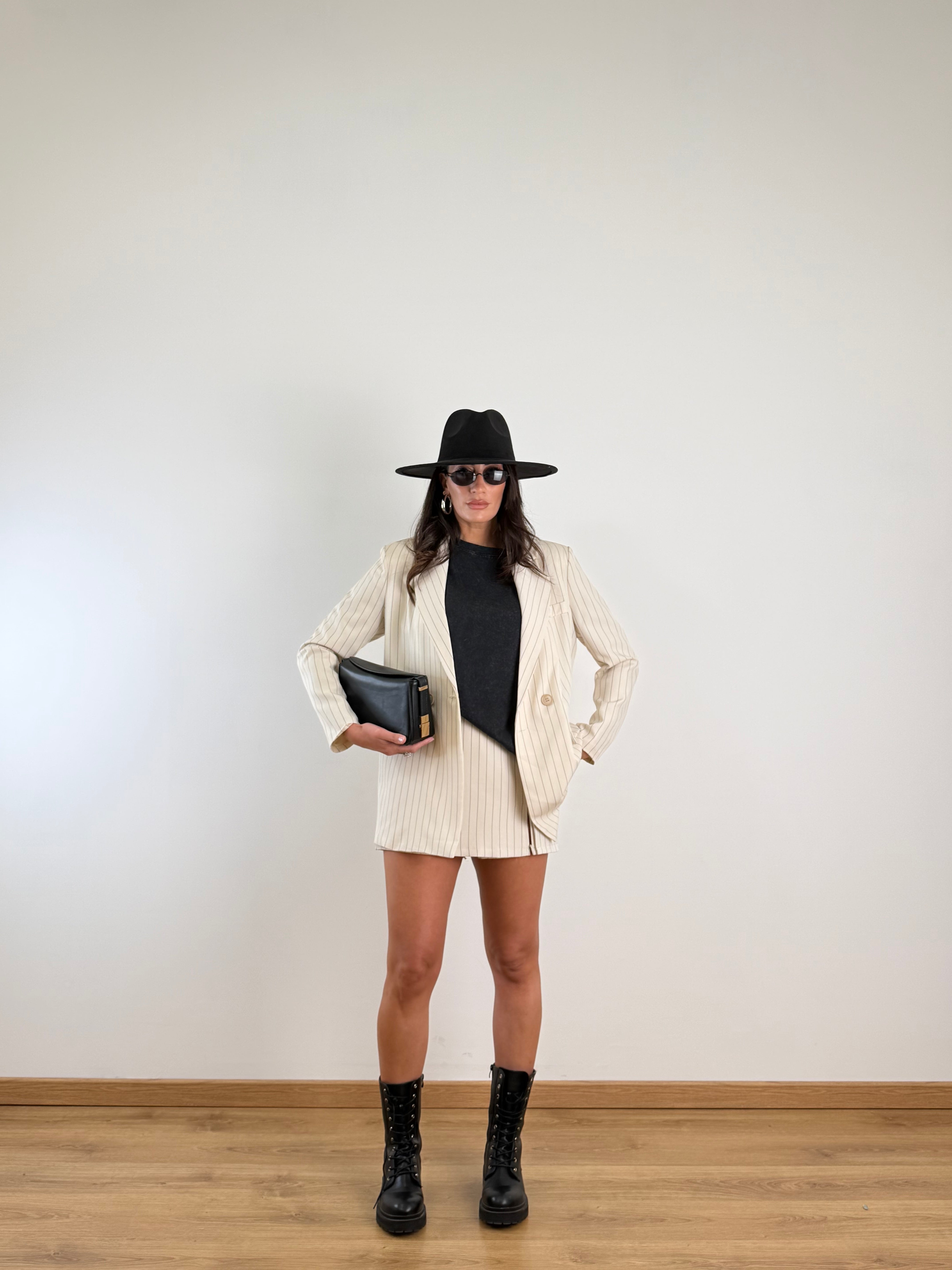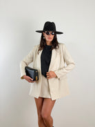 Tailleur con blazer doppiopetto a 4 bottoni. Spalline leggere. Revers classico a lancia. Tasche laterali con patta. Taschino a filo sul petto. Pantaloncini con patta elastico sul retro e cerniera laterale. Taglia unica