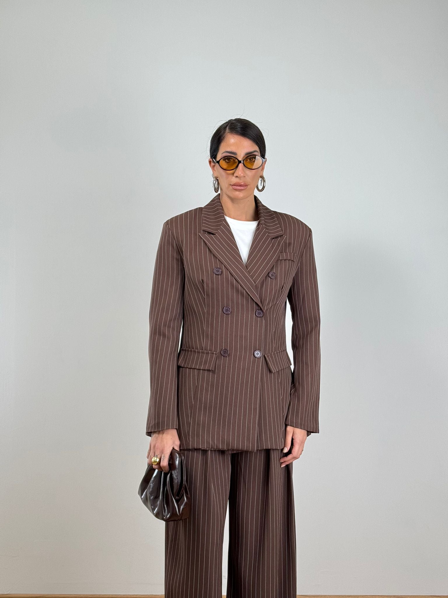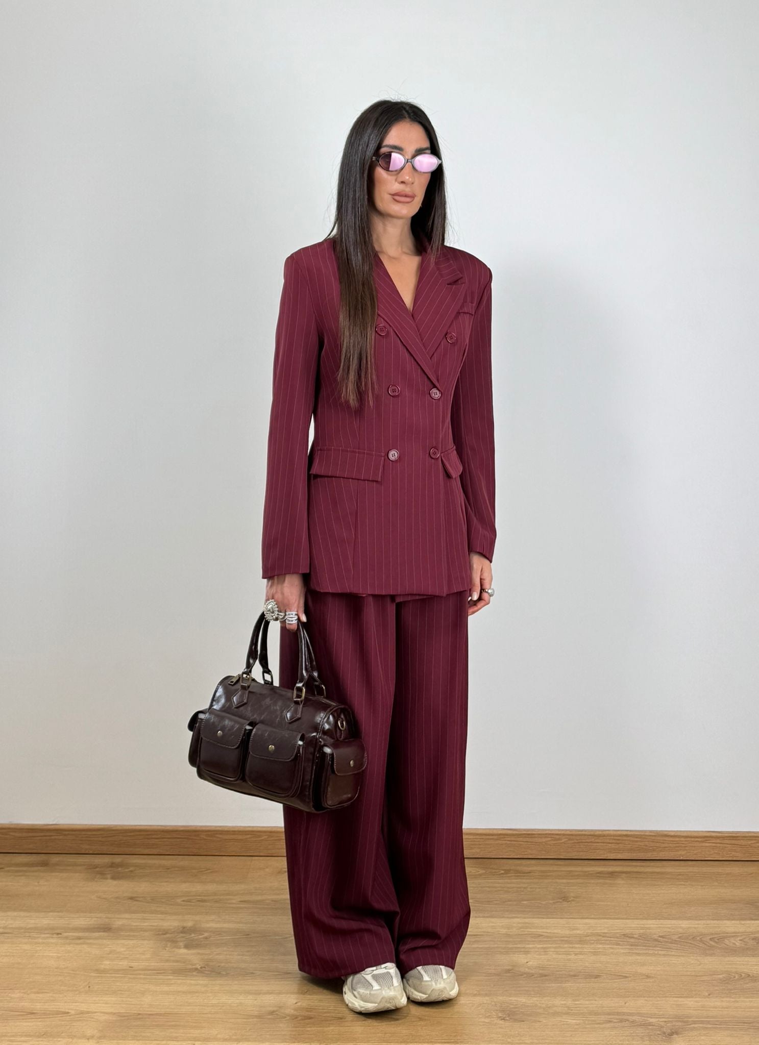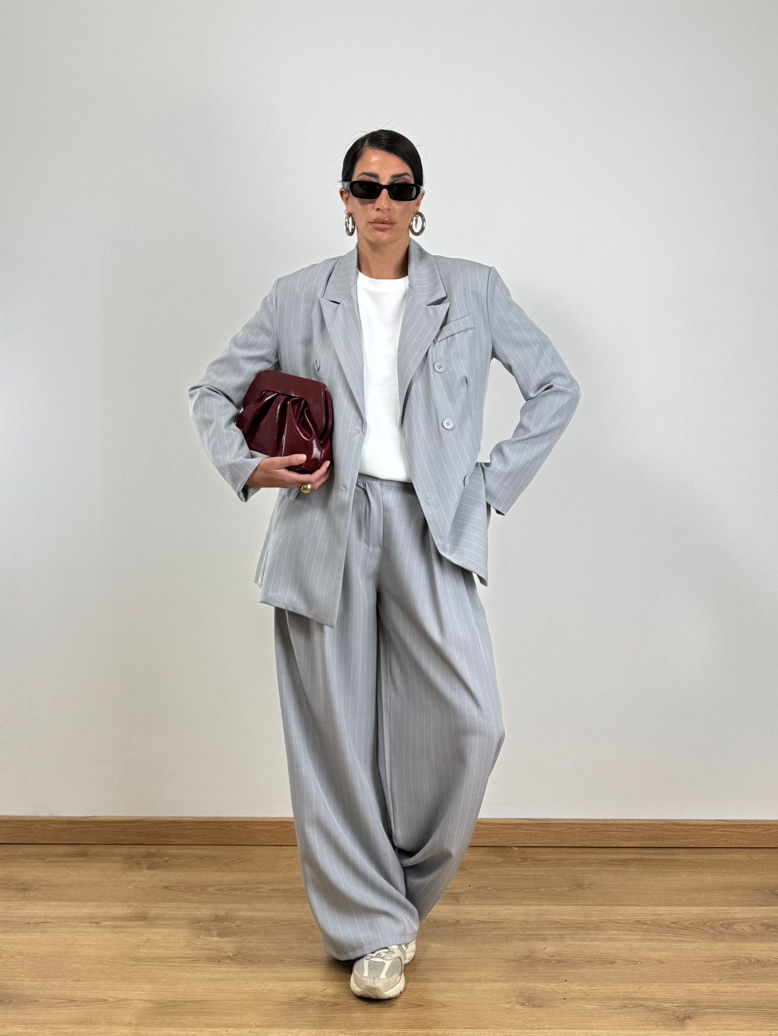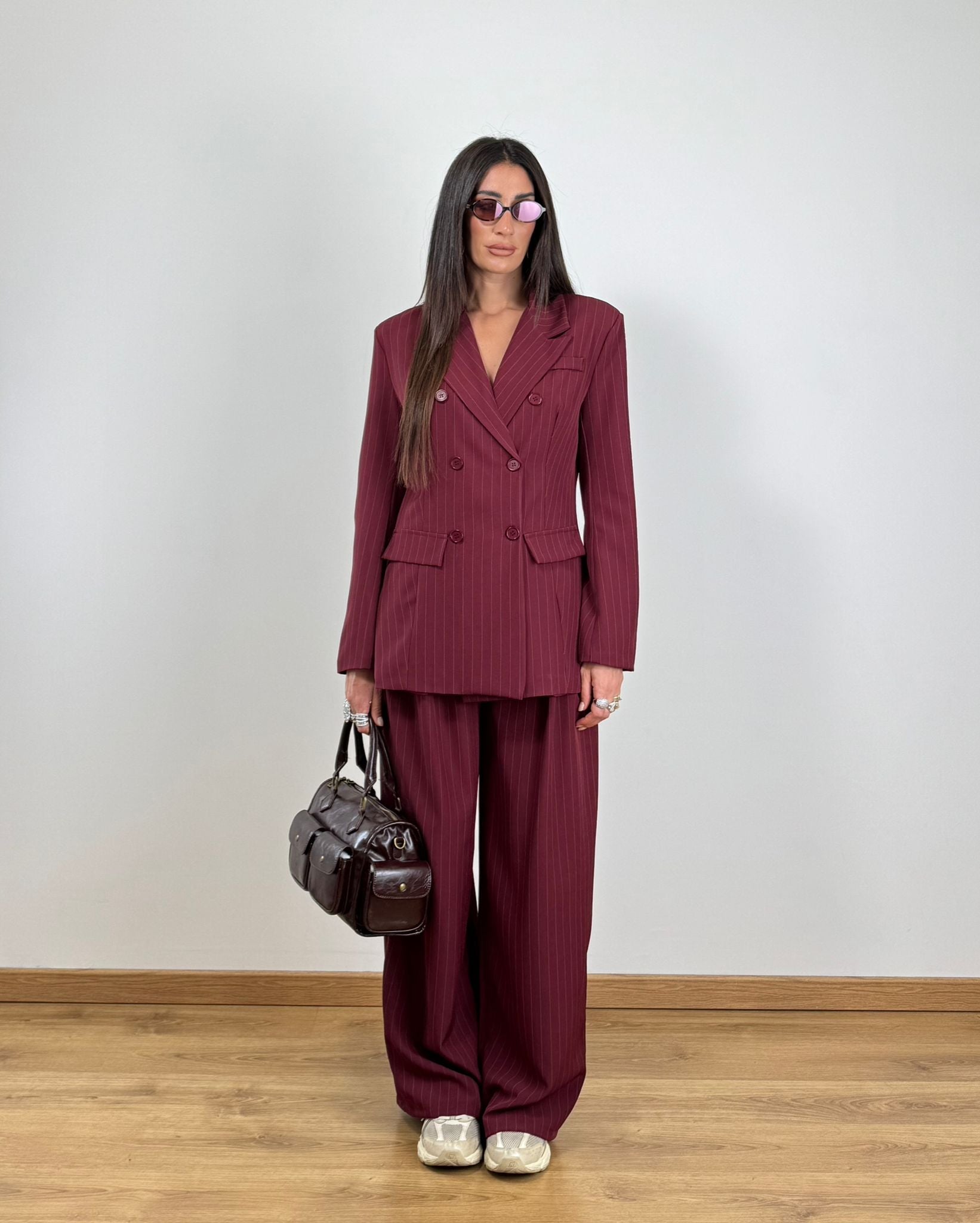 Tailleur gessato taglia unica composto da giacca doppio petto con spalline vestibilita regolare , e pantalone palazzo con pence sul davanti , elastico in vita , veste fino 46