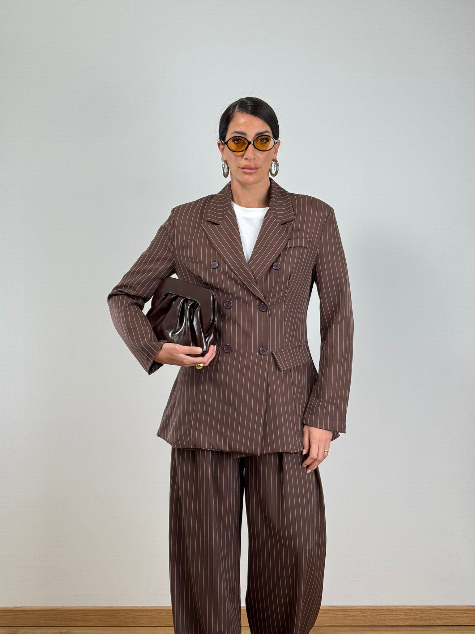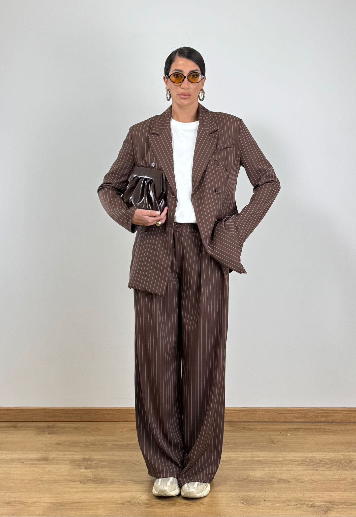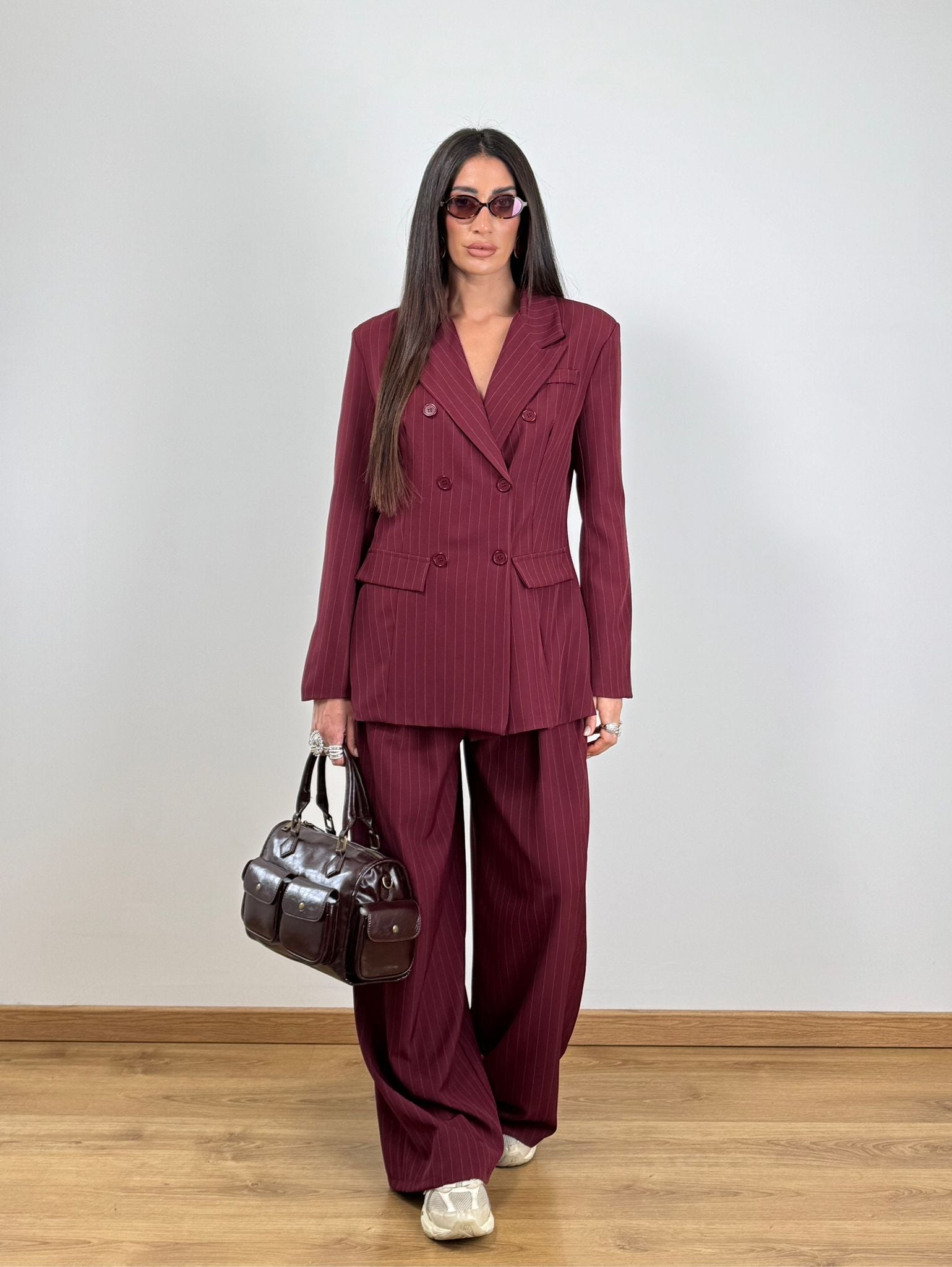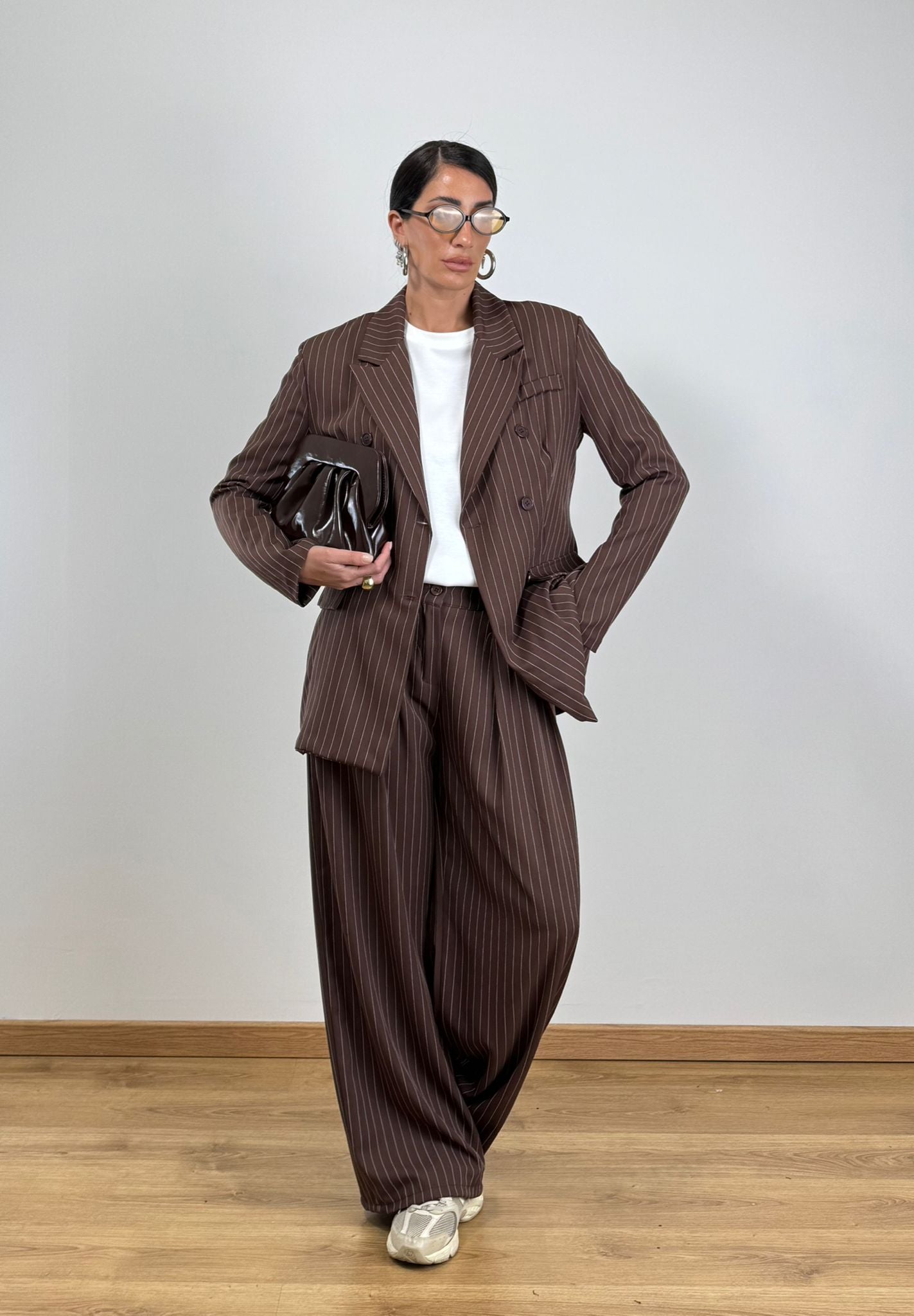 Tailleur gessato taglia unica composto da giacca doppio petto con spalline vestibilita regolare , e pantalone palazzo con pence sul davanti , elastico in vita , veste fino 46