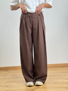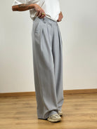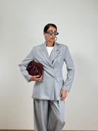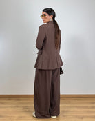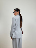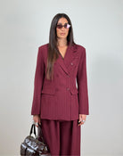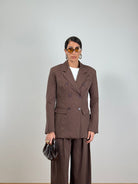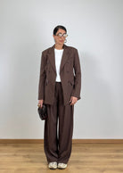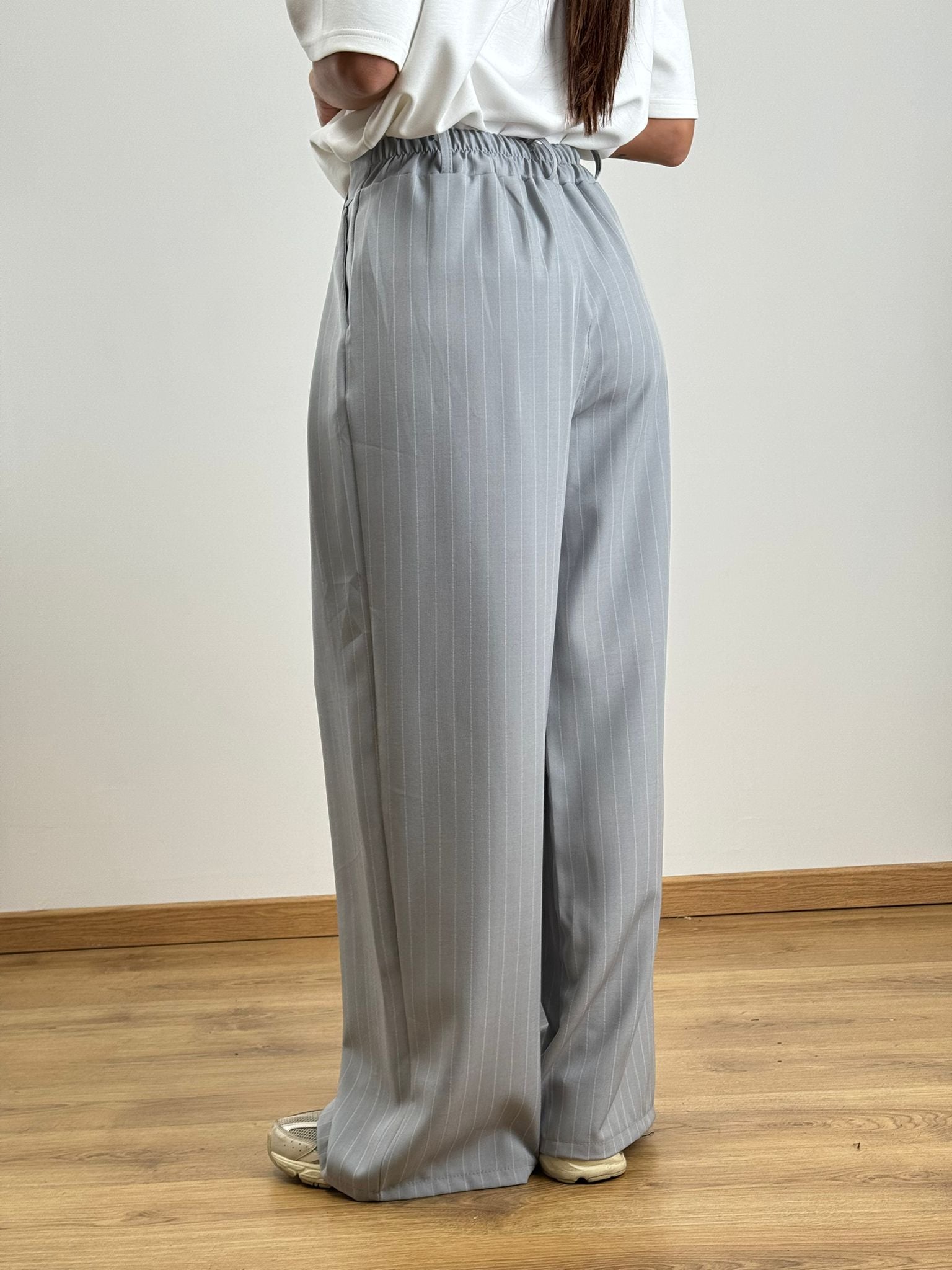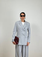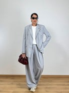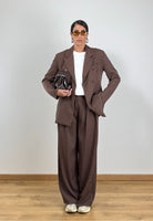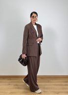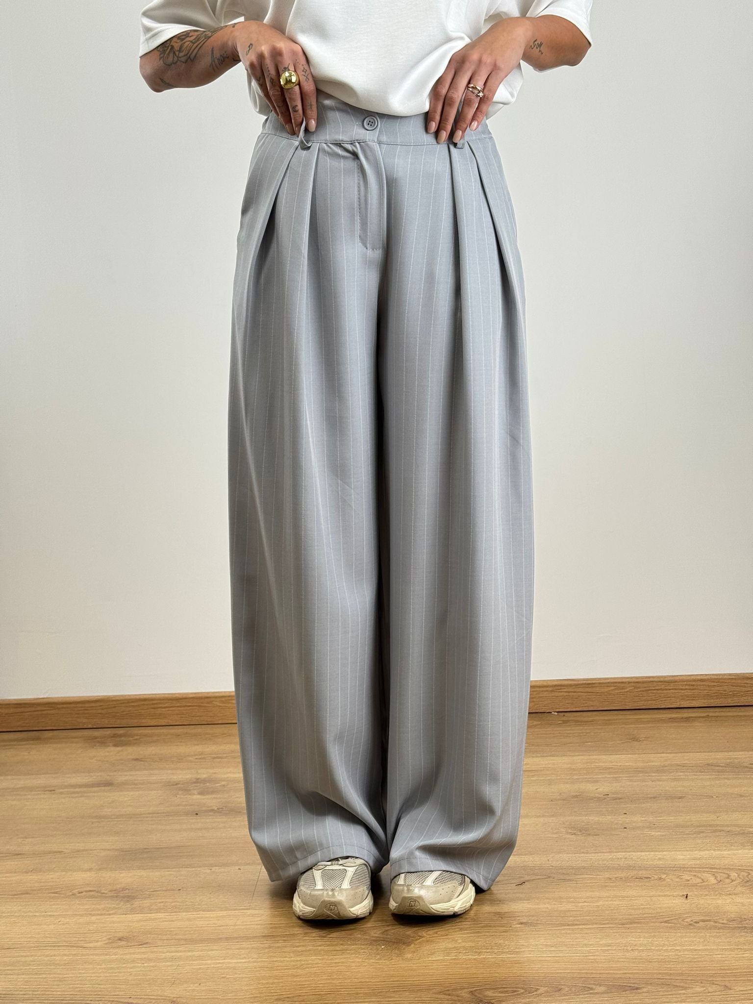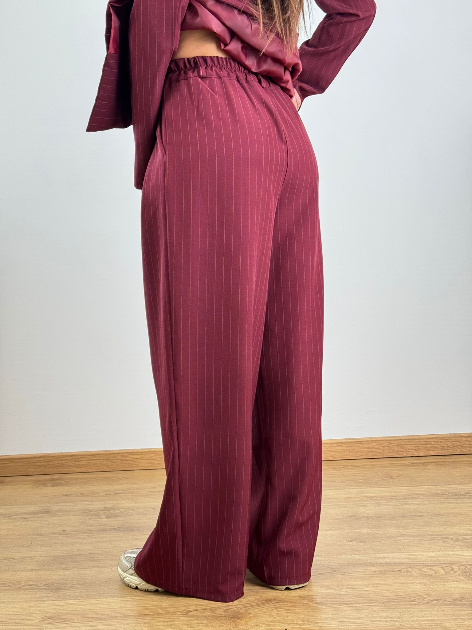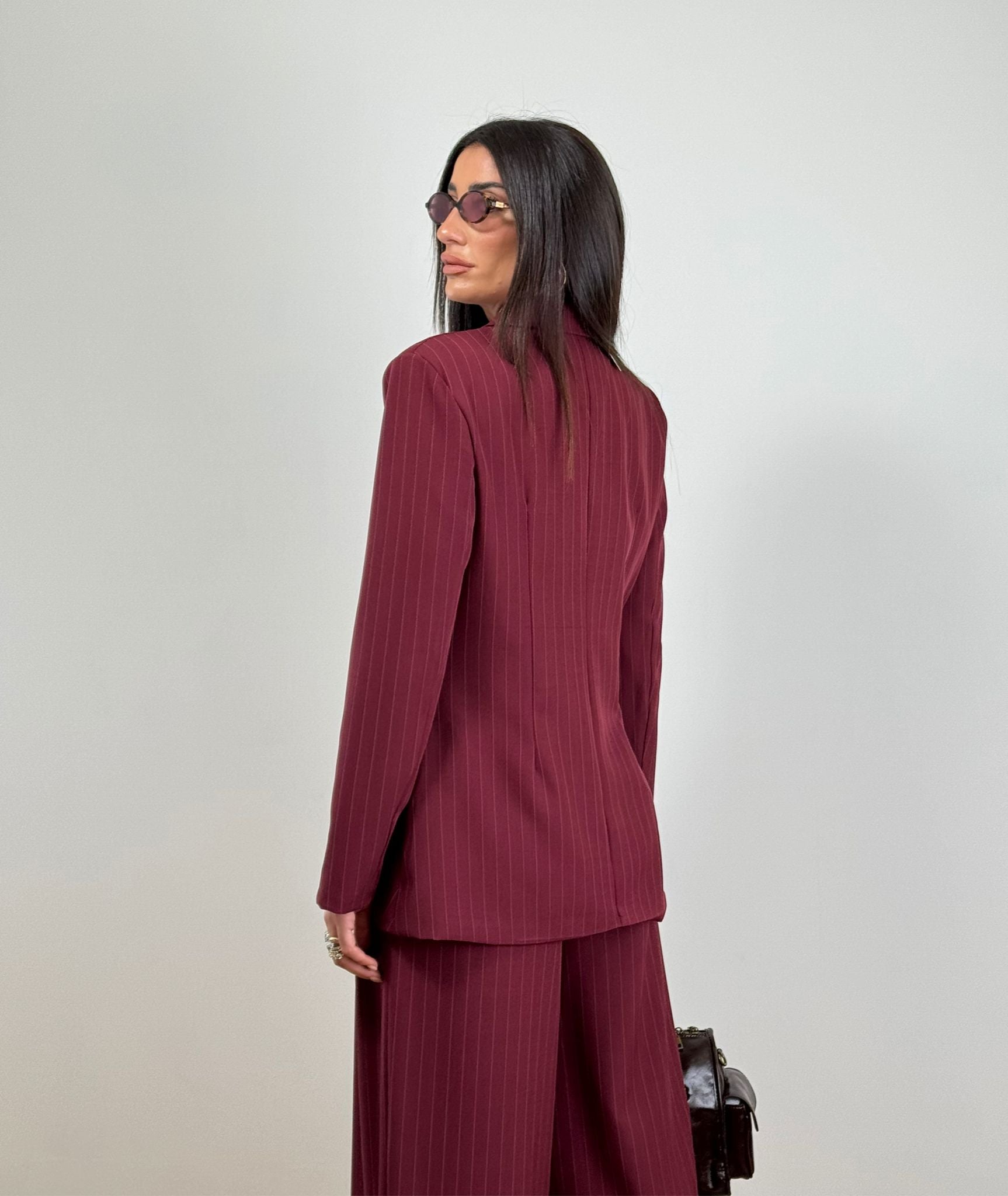 Tailleur gessato taglia unica composto da giacca doppio petto con spalline vestibilita regolare , e pantalone palazzo con pence sul davanti , elastico in vita , veste fino 46