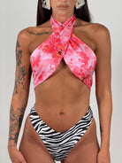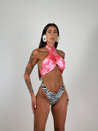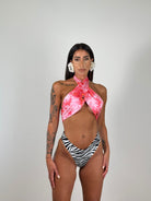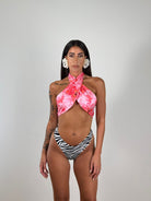 Trikini composto da fascia incrociata sul davanti fiorata e slip brasiliana zebrato, si allaccia al collo e si unisce sul retro