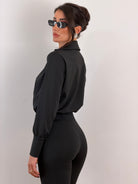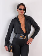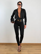 Tutina nera manica lunga con scollo profondo. Colletto e polsini. Taglia unica
