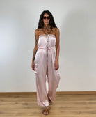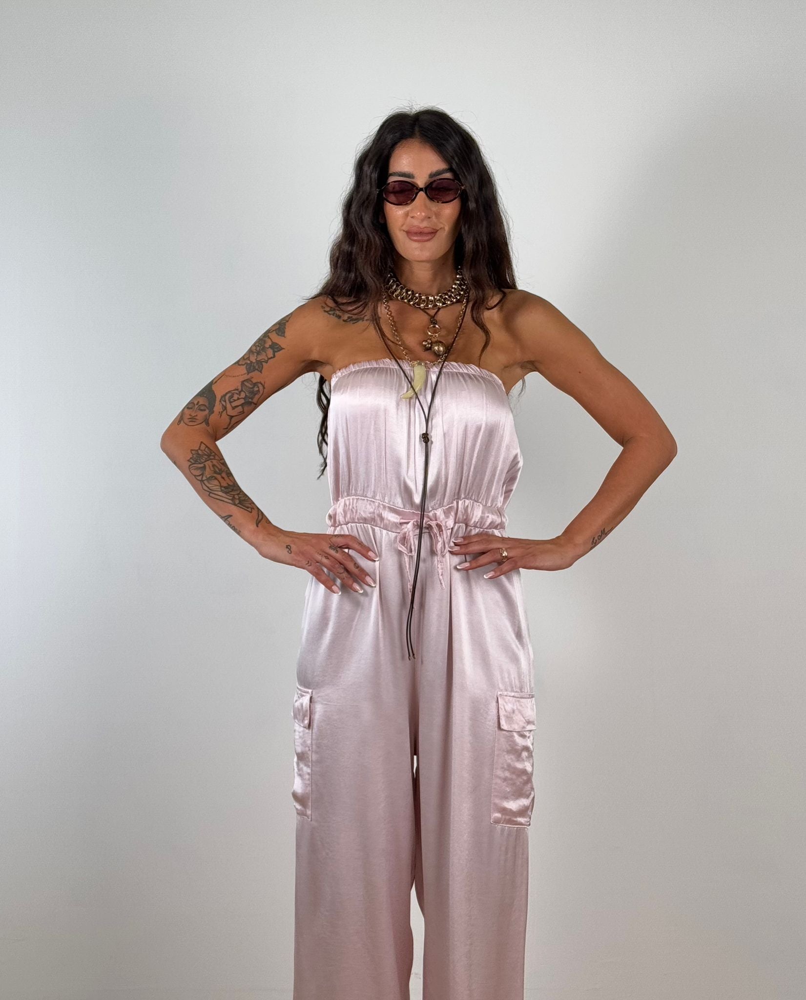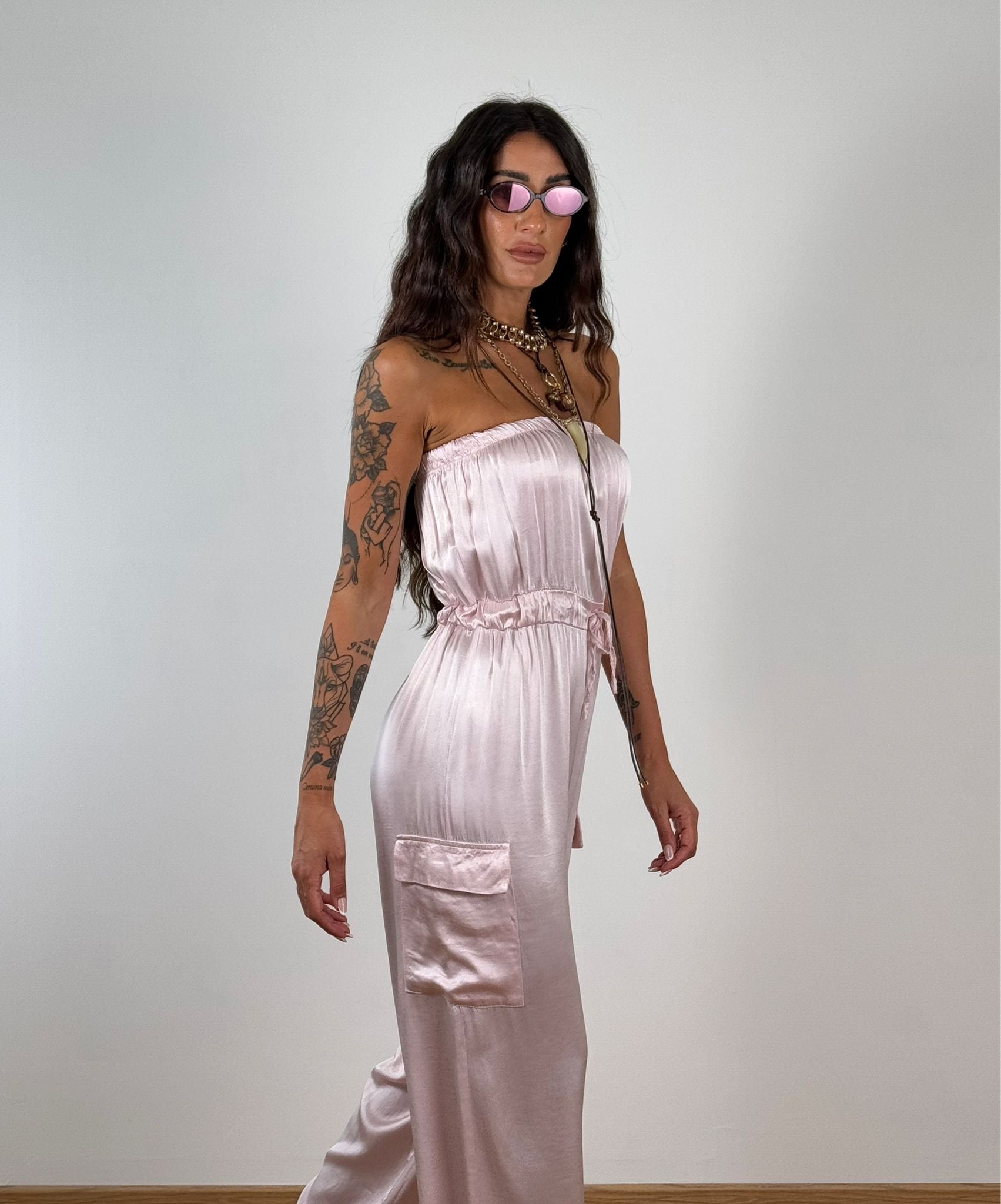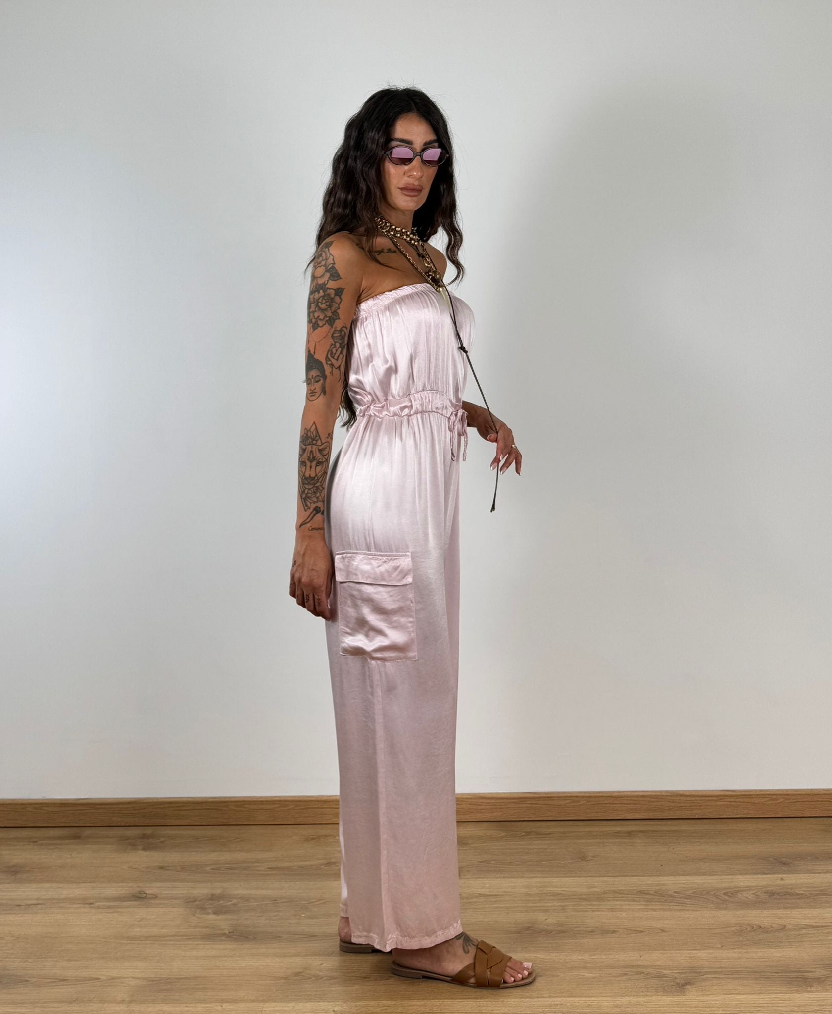 Tutina a fascia elastico in vita e coulisse , morbida con tasconi laterali, effetto seta.